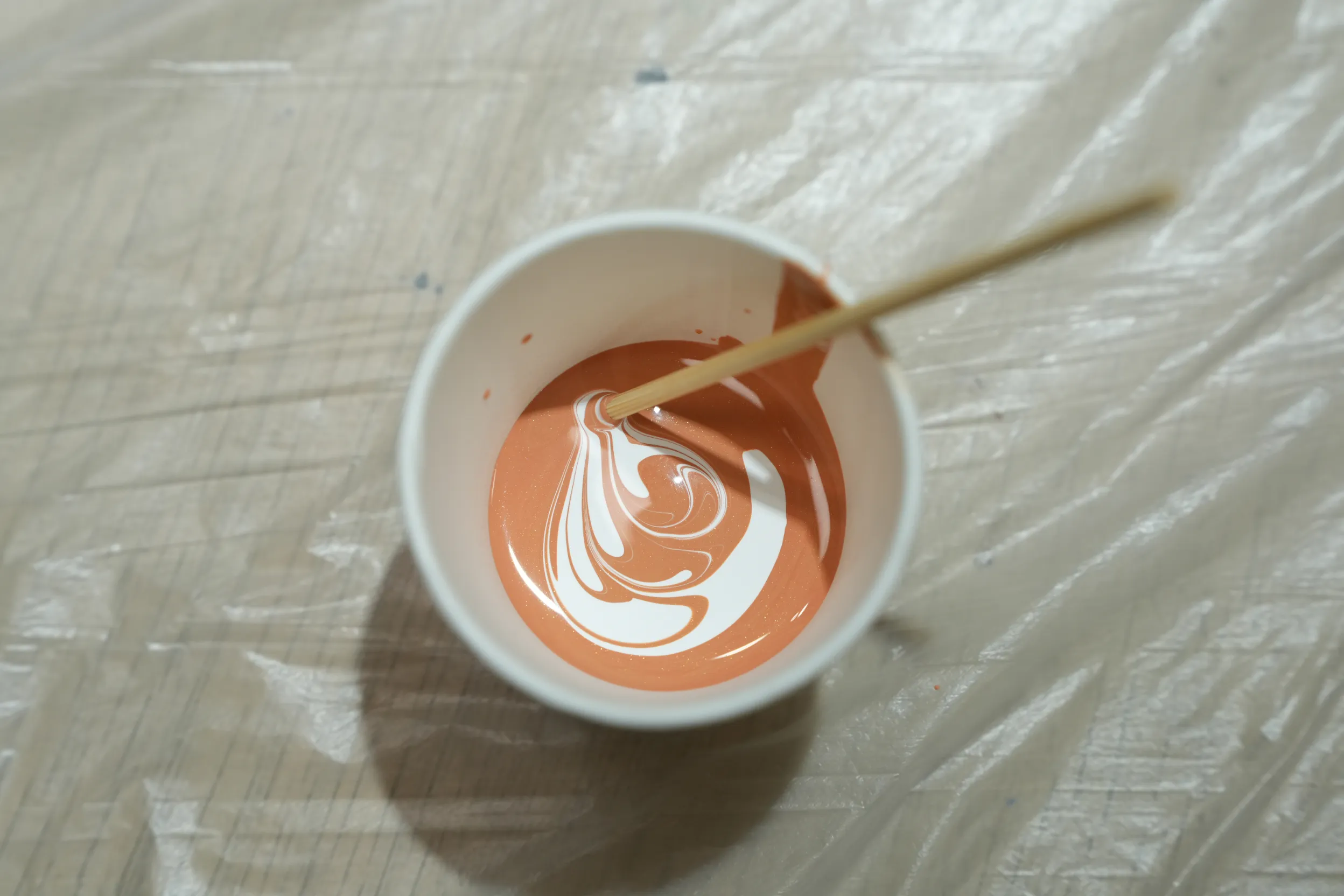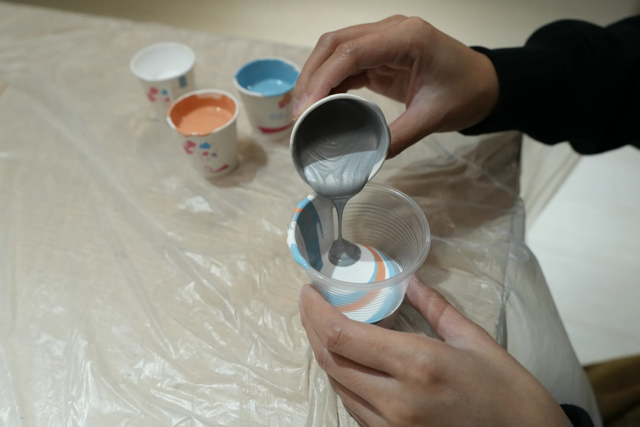 ▼朋友選了藍色、橘色、銀色和白色,將顏料分別倒入紙杯中,大約倒到九分滿的高度。