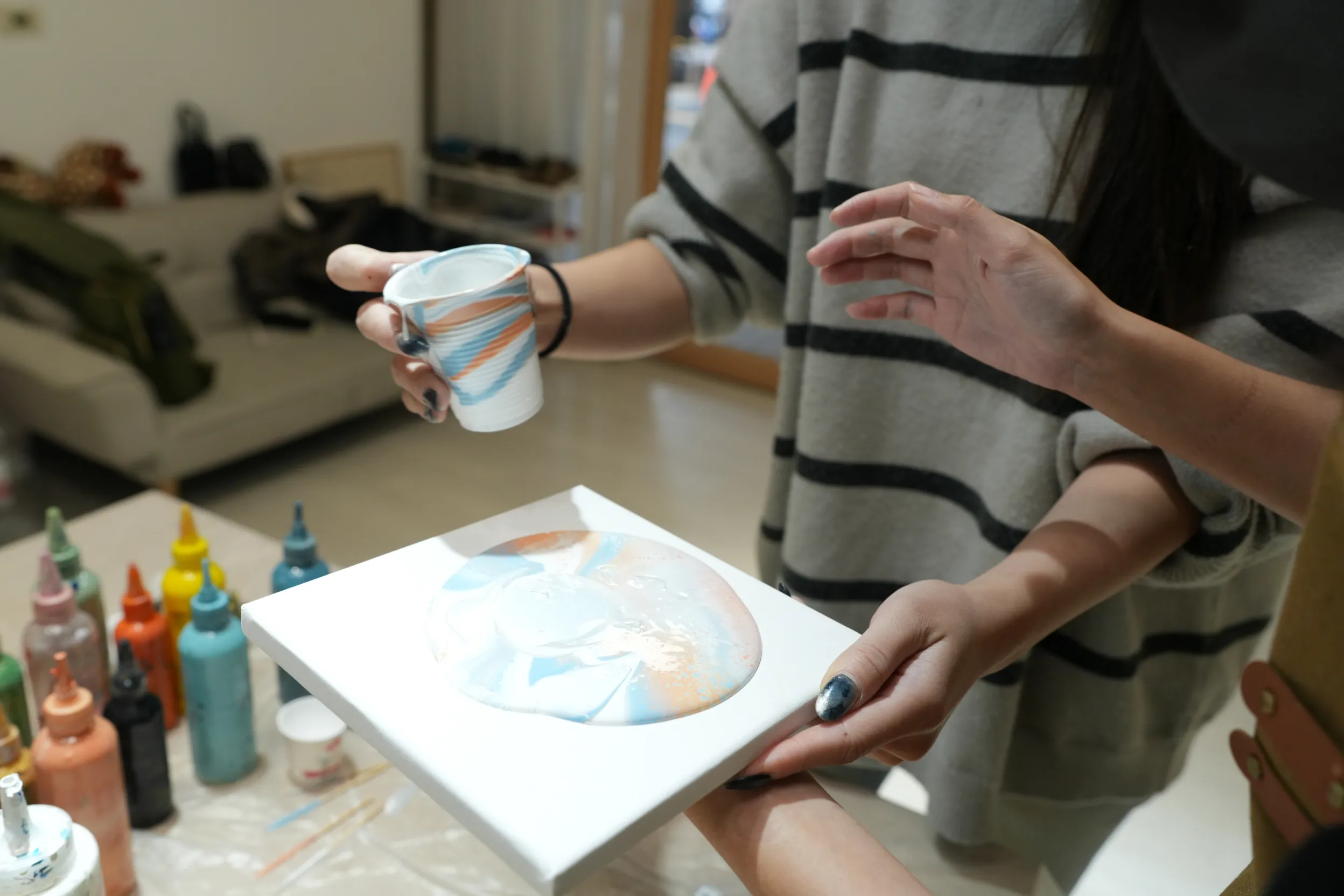 不管你想嘗試有立體感的肌理畫,還是喜歡流體畫那種自由奔放、每次都不一樣的效果,整個創作過程可以讓人完全投入其中,享受創作的樂趣。創作流動畫過程中可以專注於色彩的流動與變化,慢慢讓思緒沉澱下來,這樣的體驗非常適合想完成第一幅抽象畫的人來嘗試,不僅能享受探索色彩與肌理的過程,也能在創作中找到放鬆與滿足感。