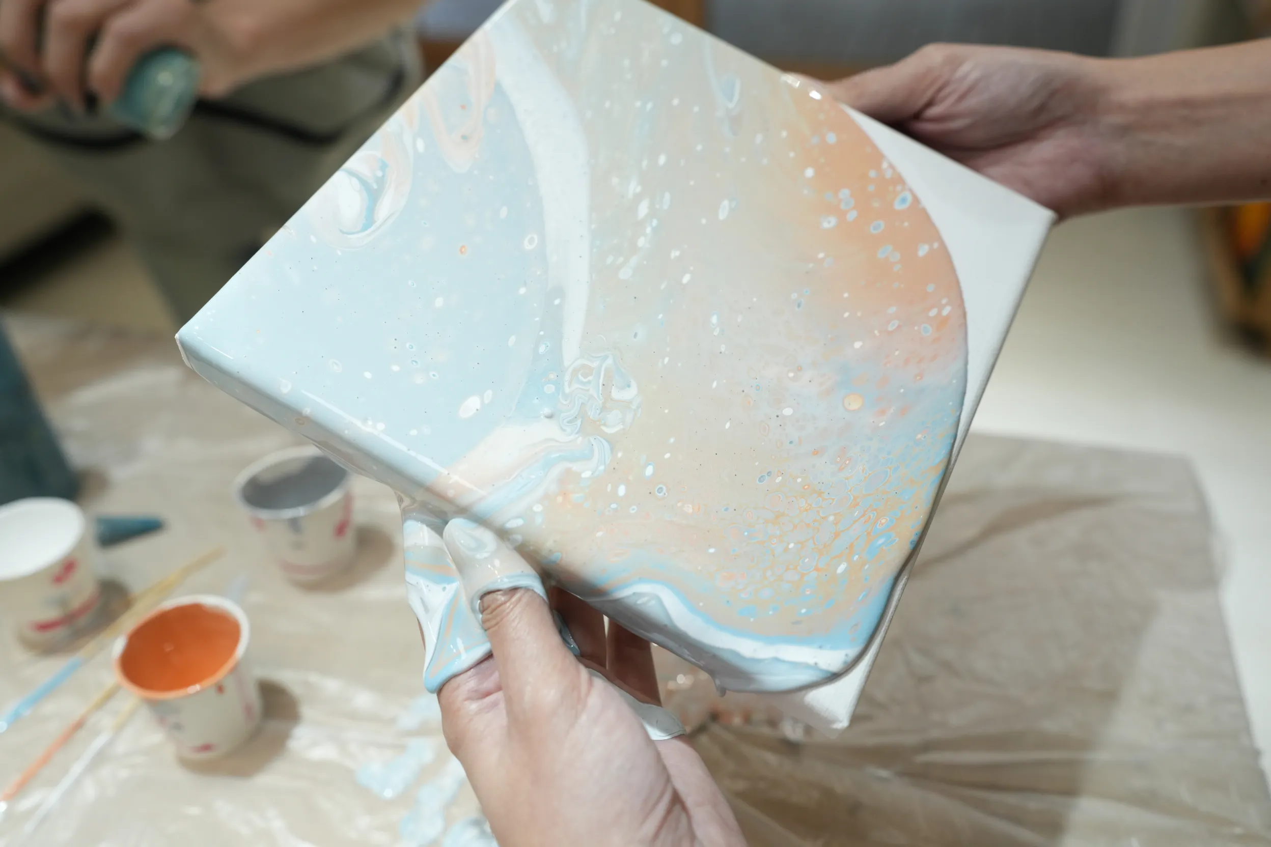 ▼老師會協助扶著畫布,先將畫布傾斜向四個角落,讓顏料均勻流動,覆蓋整個畫面。