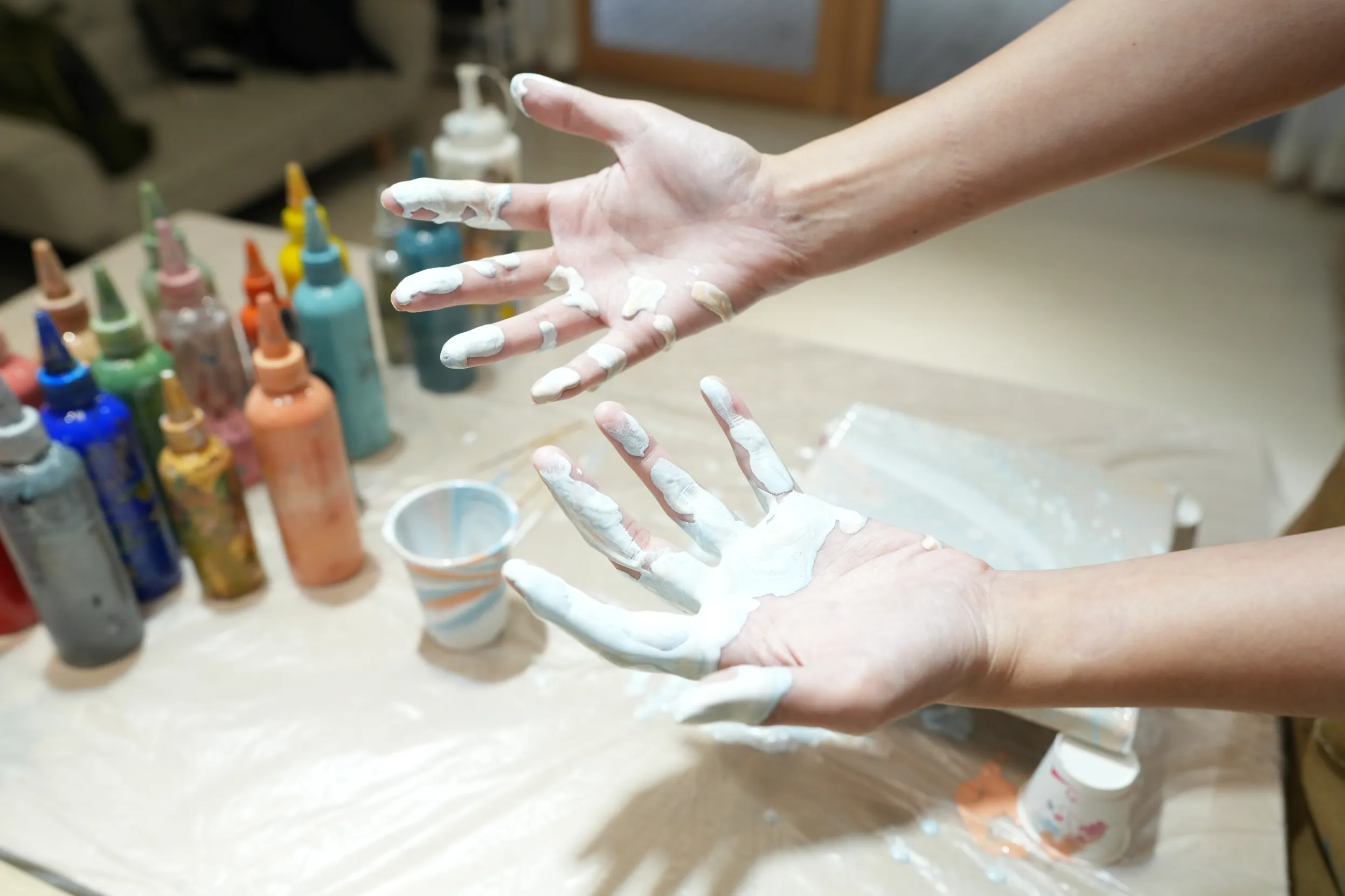 ▼由於顏料容易滑動,手上沾滿了顏料,原以為會很難清洗,沒想到稍微用水沖洗一下就能輕鬆洗乾淨!