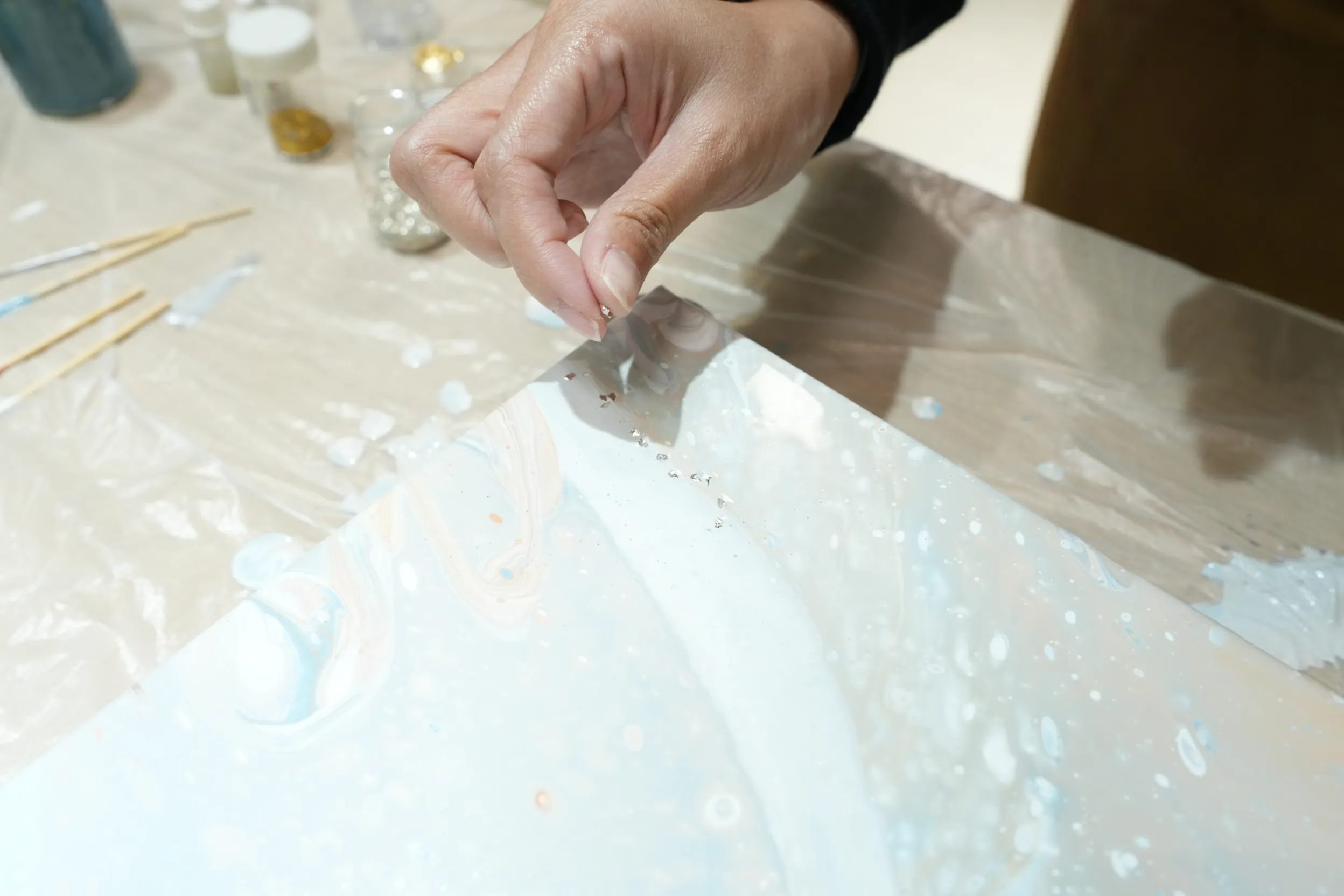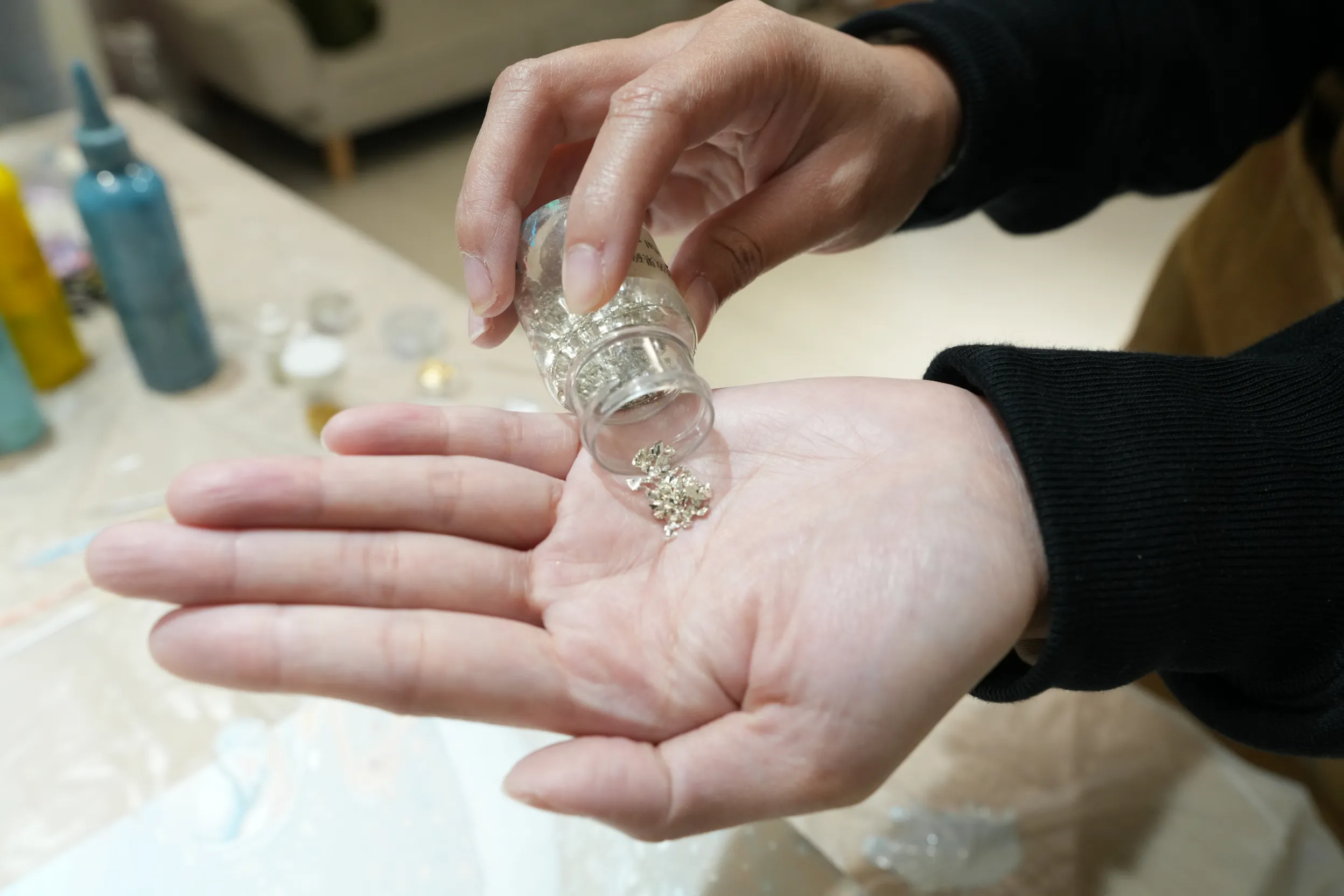 ▼我選擇了銀色亮粉碎片,將它們貼在流動畫上作為點綴,增添畫作的閃亮效果。