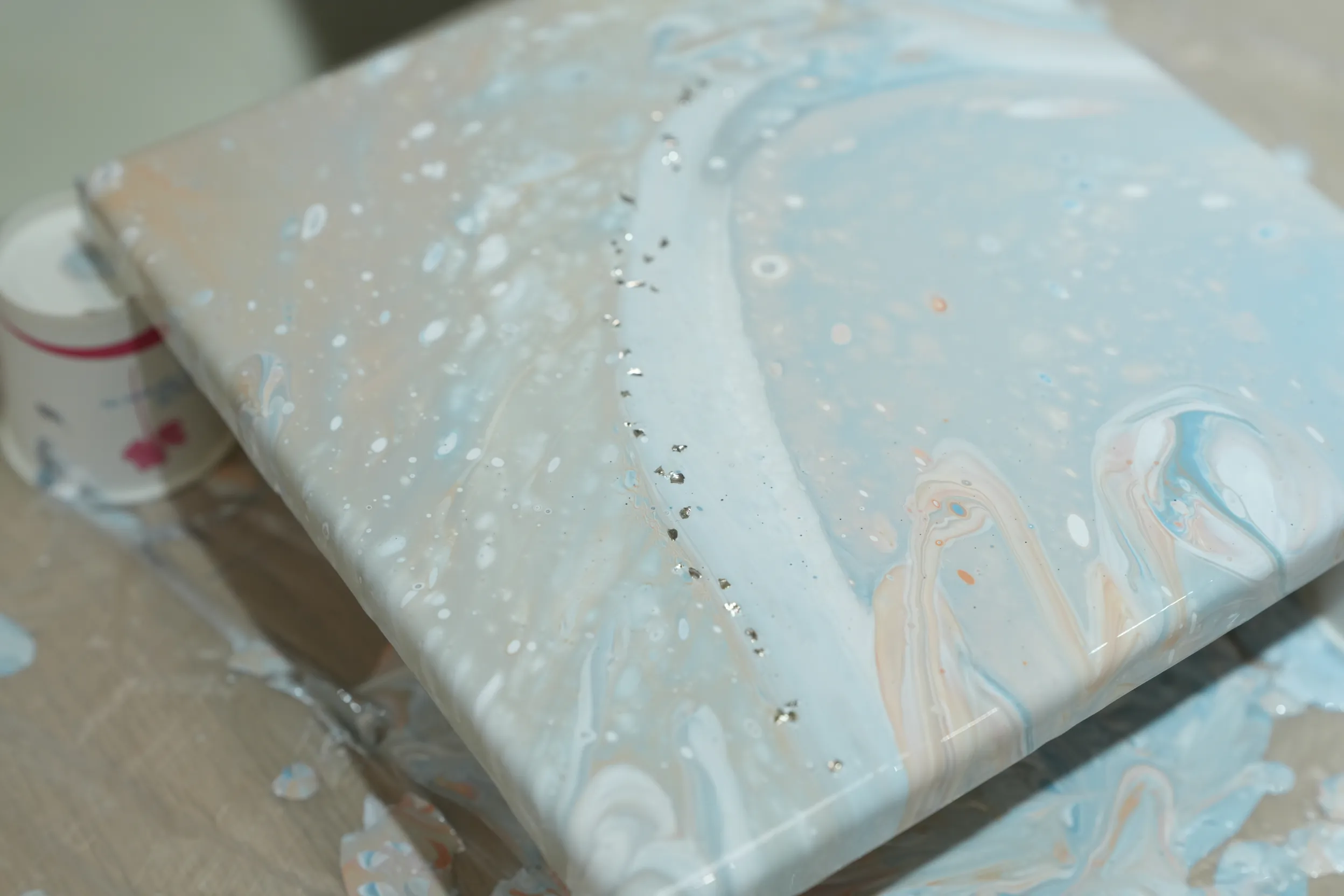 ▼接下來就準備用藍色、橘色、銀色和白色的壓克力顏料來進行流體畫創作。