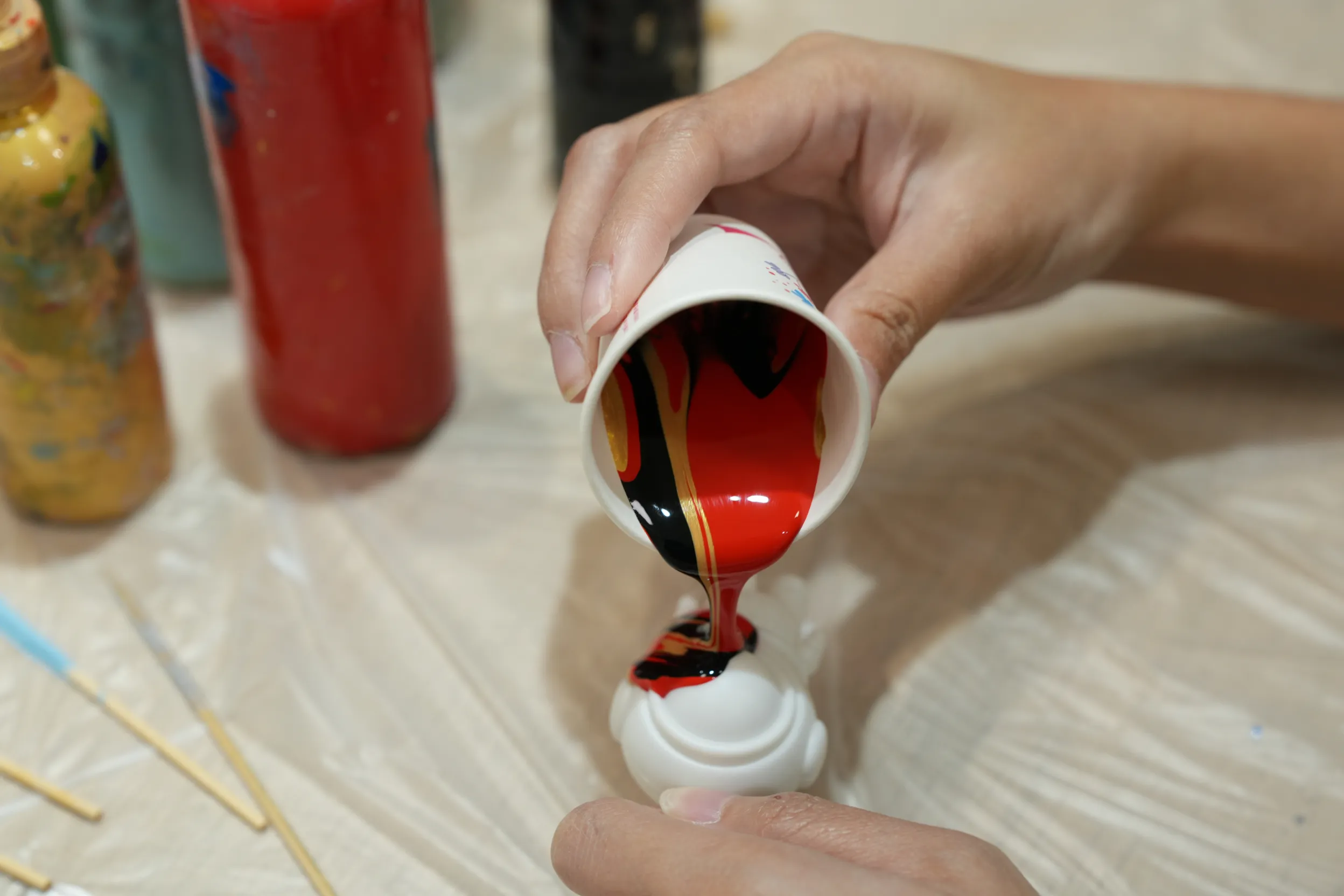 ▼將畫布蓋在塑膠杯上方後,再將整個杯子倒轉,讓顏料自然流到畫布上。