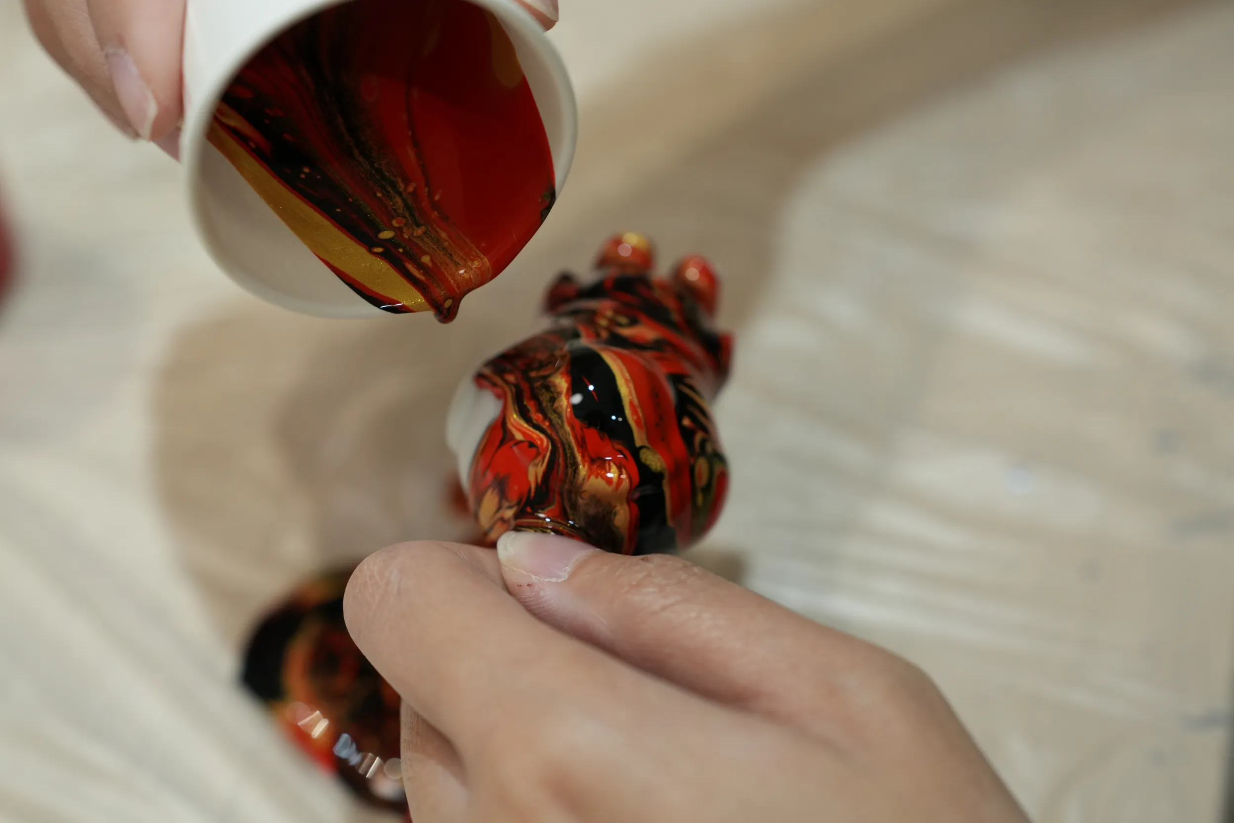 ▼從太空人的頭部開始倒入顏料,準備把顏料均勻倒在吊飾上。