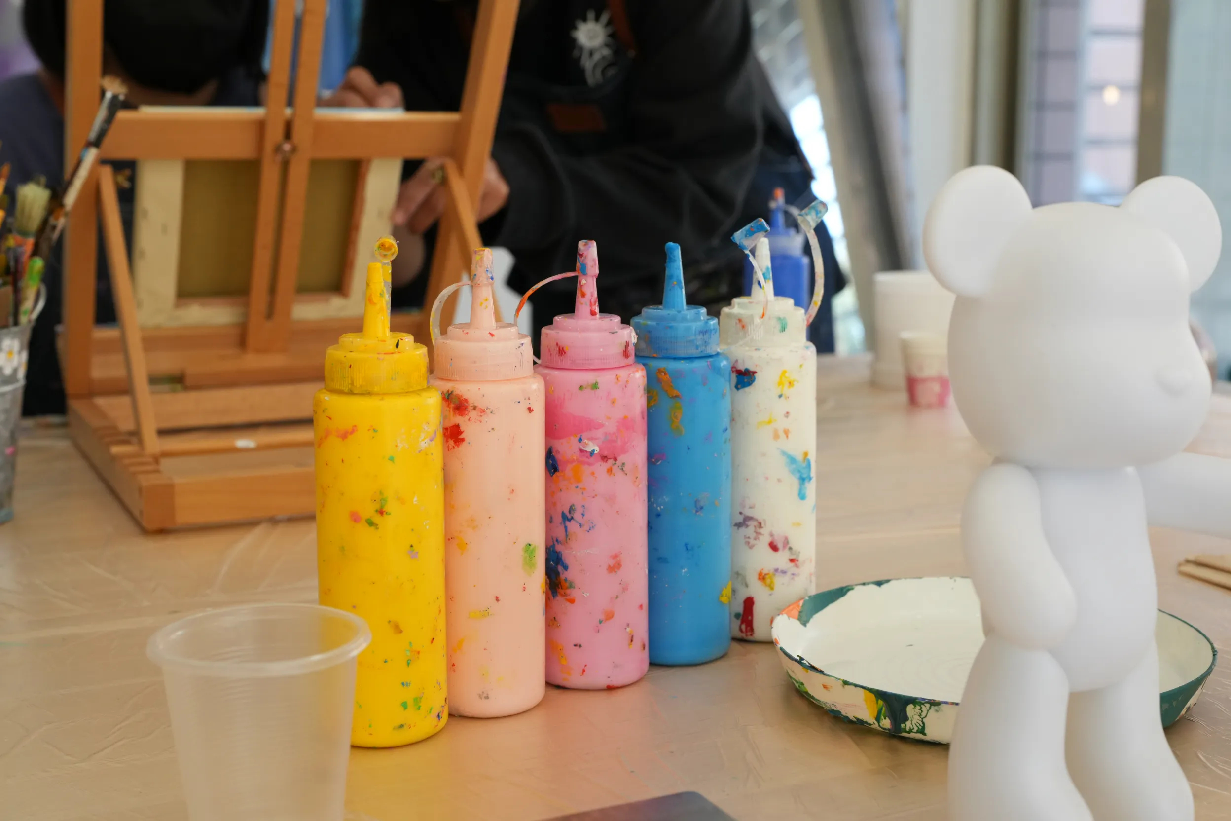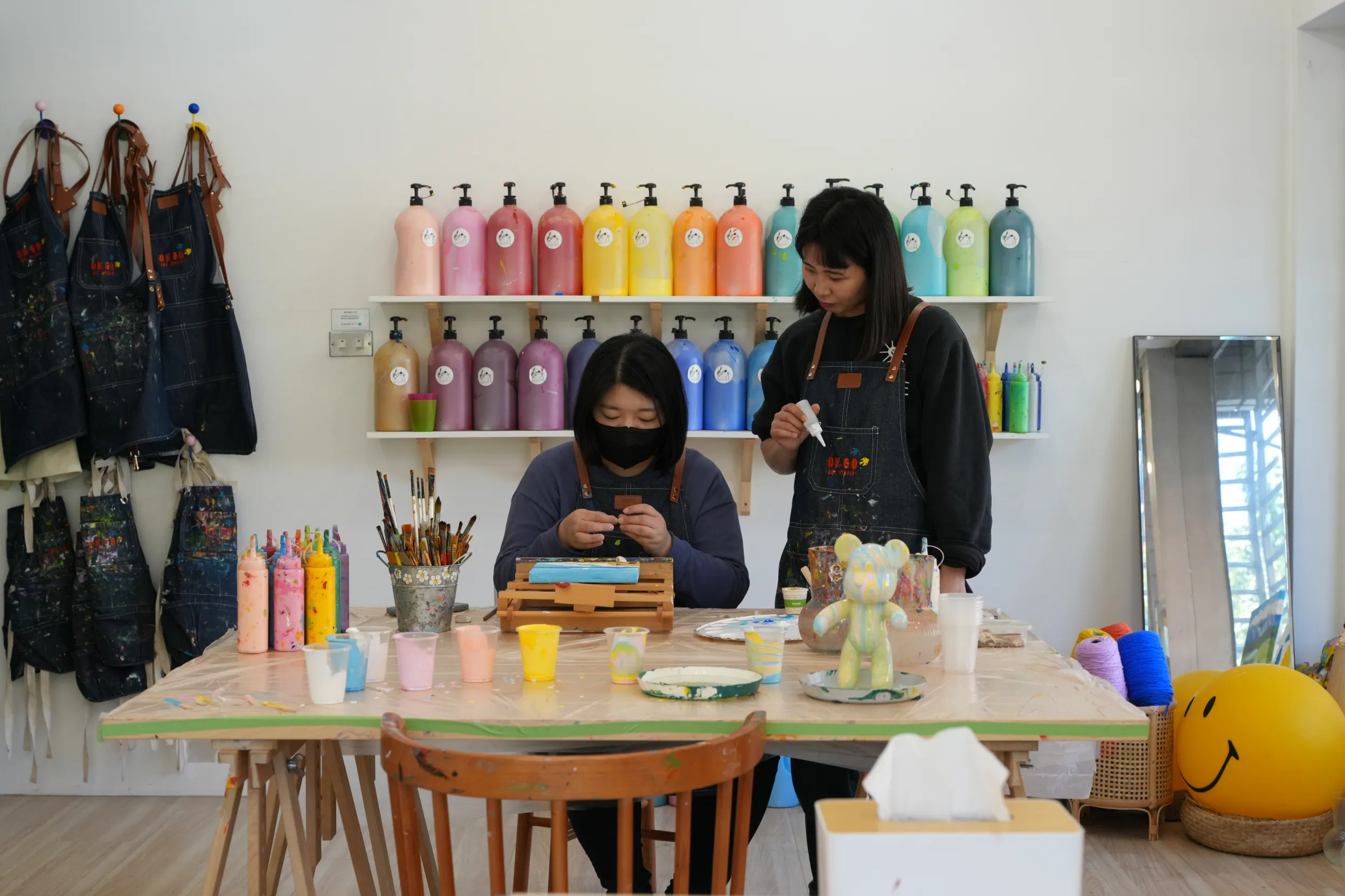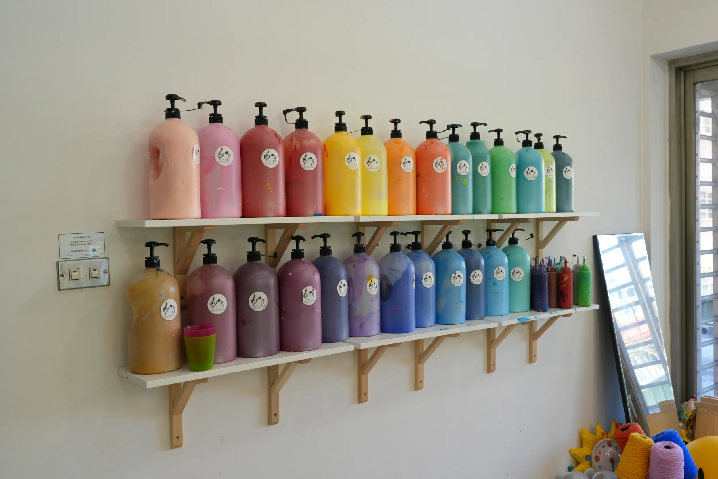 ▼牆面上整齊擺放著各種色系的壓克力顏料,從亮色到深色都有,讓人一看就想動手創作。