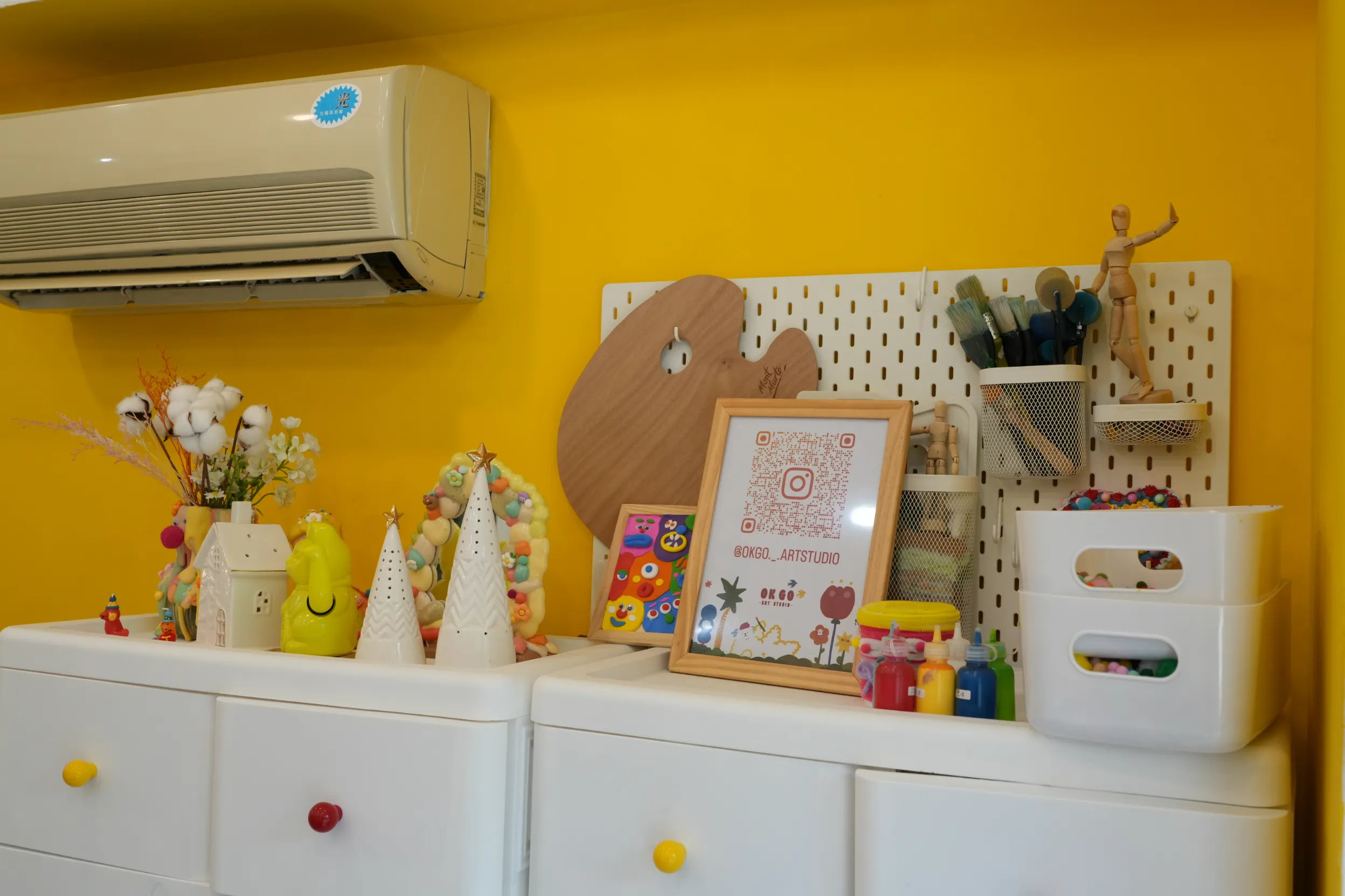▼畫室的櫃子上擺放著各式作品,風格多元又有特色,特別的是這裡還有專為兒童設計的美術課程,內容豐富、有趣,能讓小朋友開心體驗手作創作。