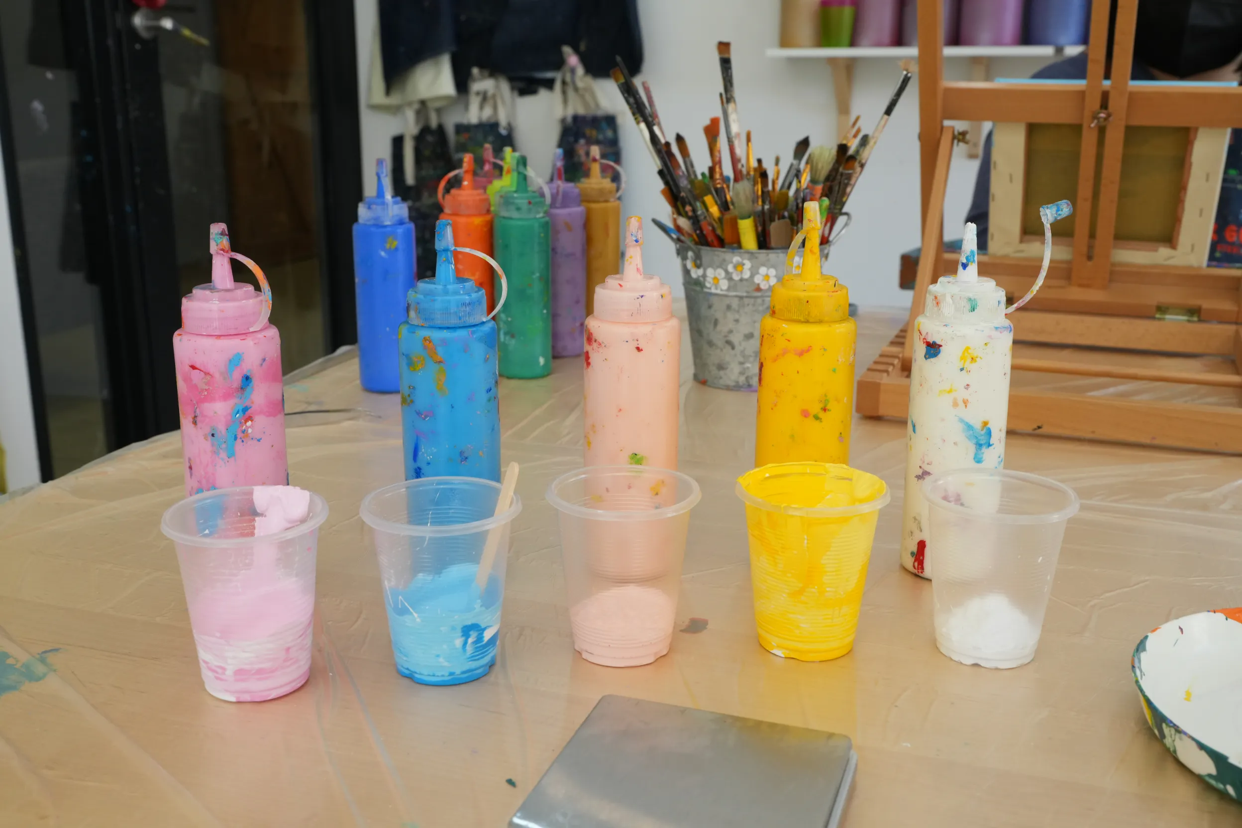 ▼每杯壓克力顏料都已調好,看起來狀態很均勻,搭配起來的流體熊成品顏色應該會相當明亮、飽和。