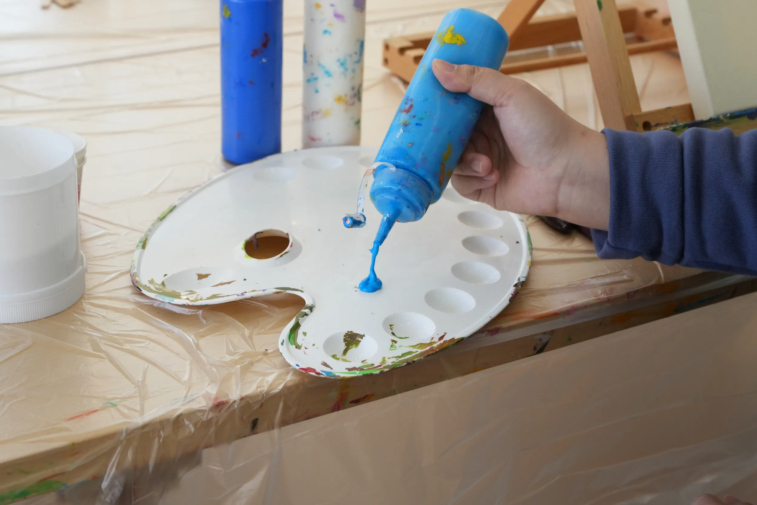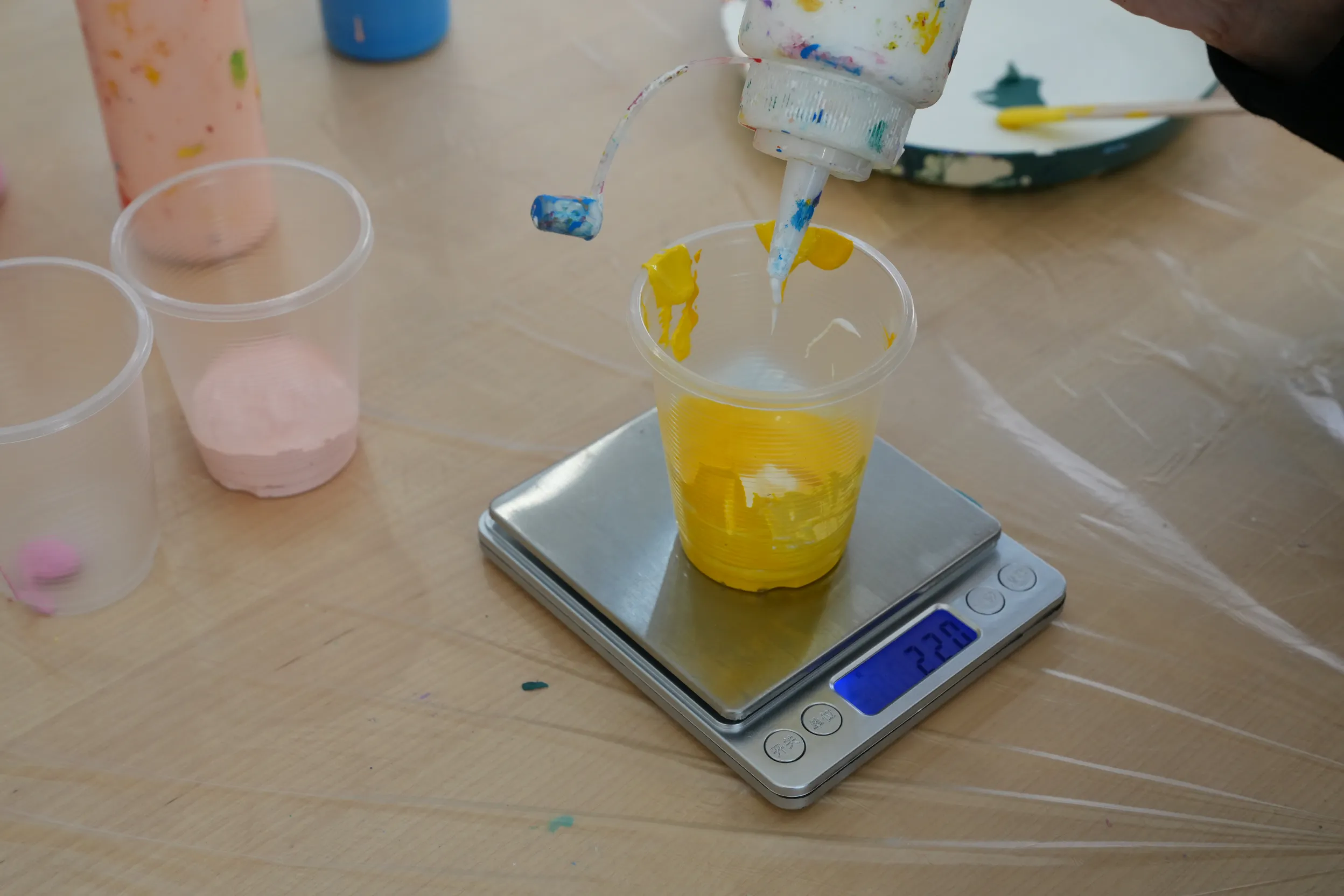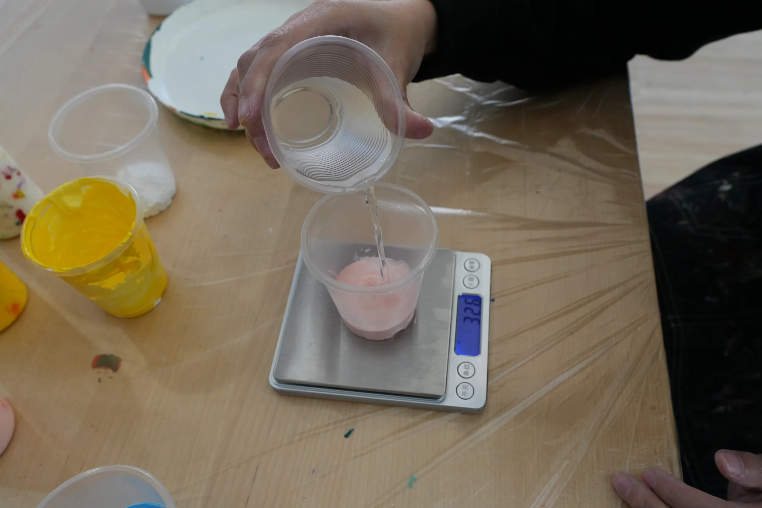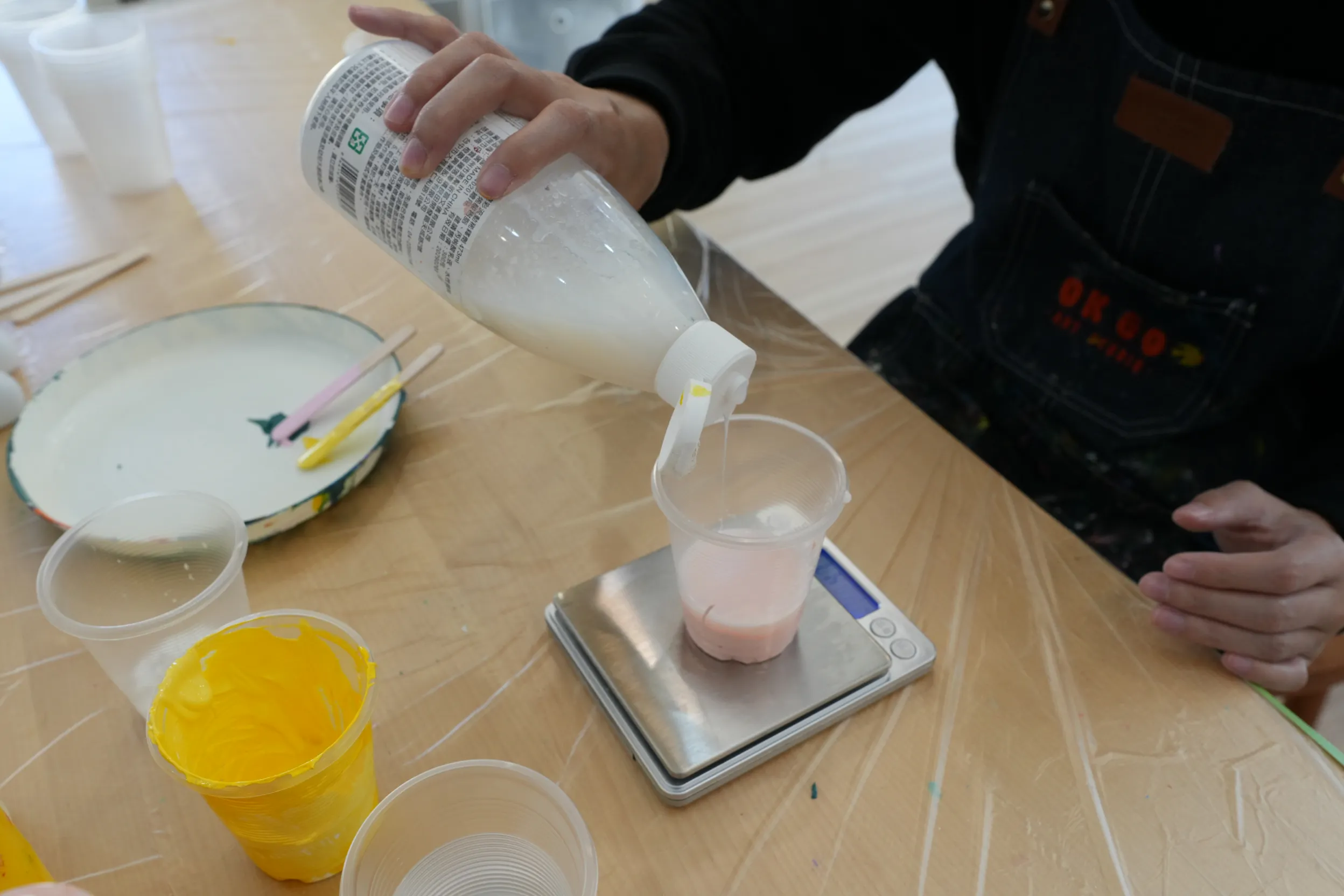 ▼先倒 30g 的壓克力顏料,再加入 15g 的水稍微調和,讓顏料呈現更順暢的稀釋狀態。