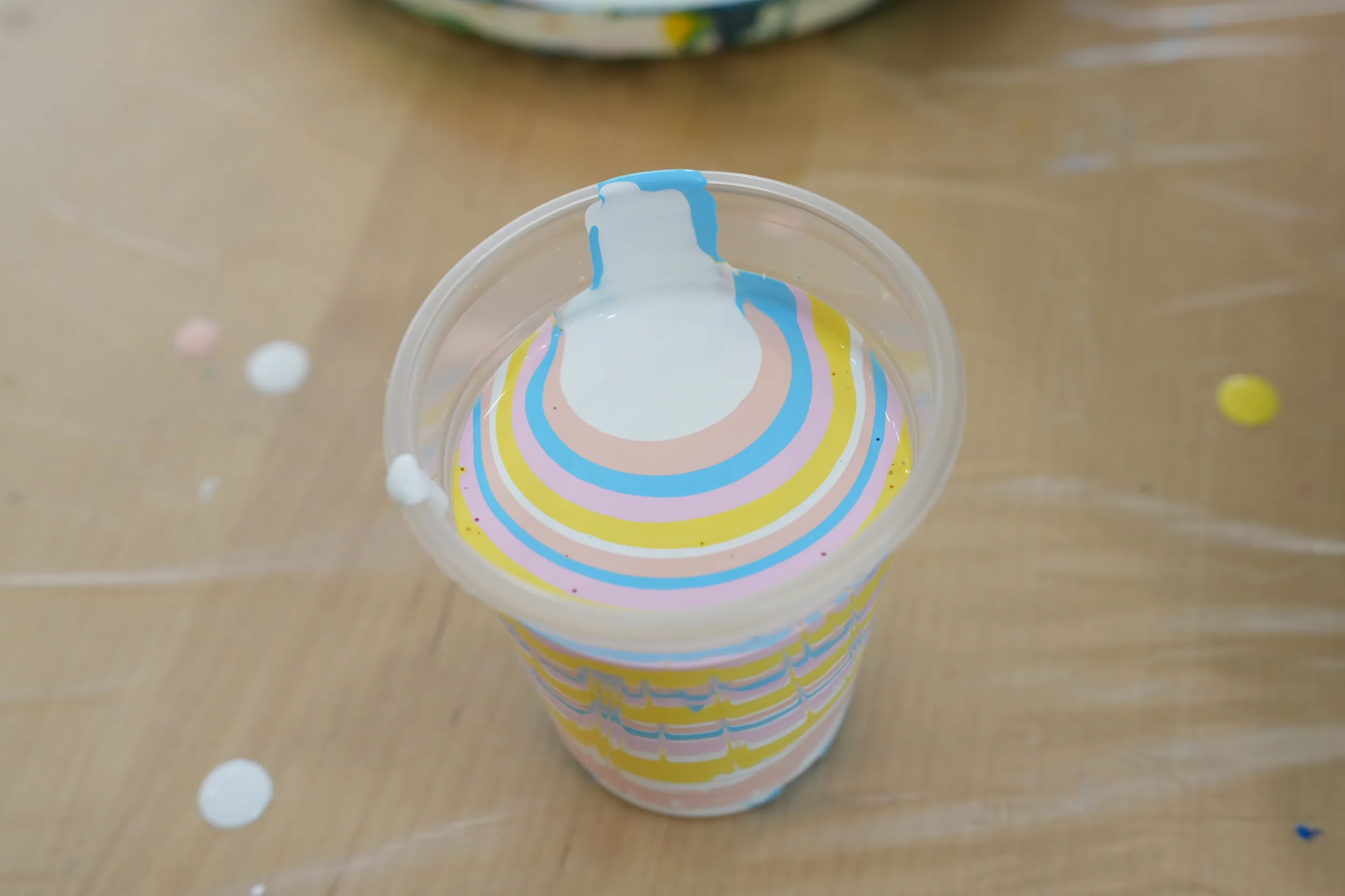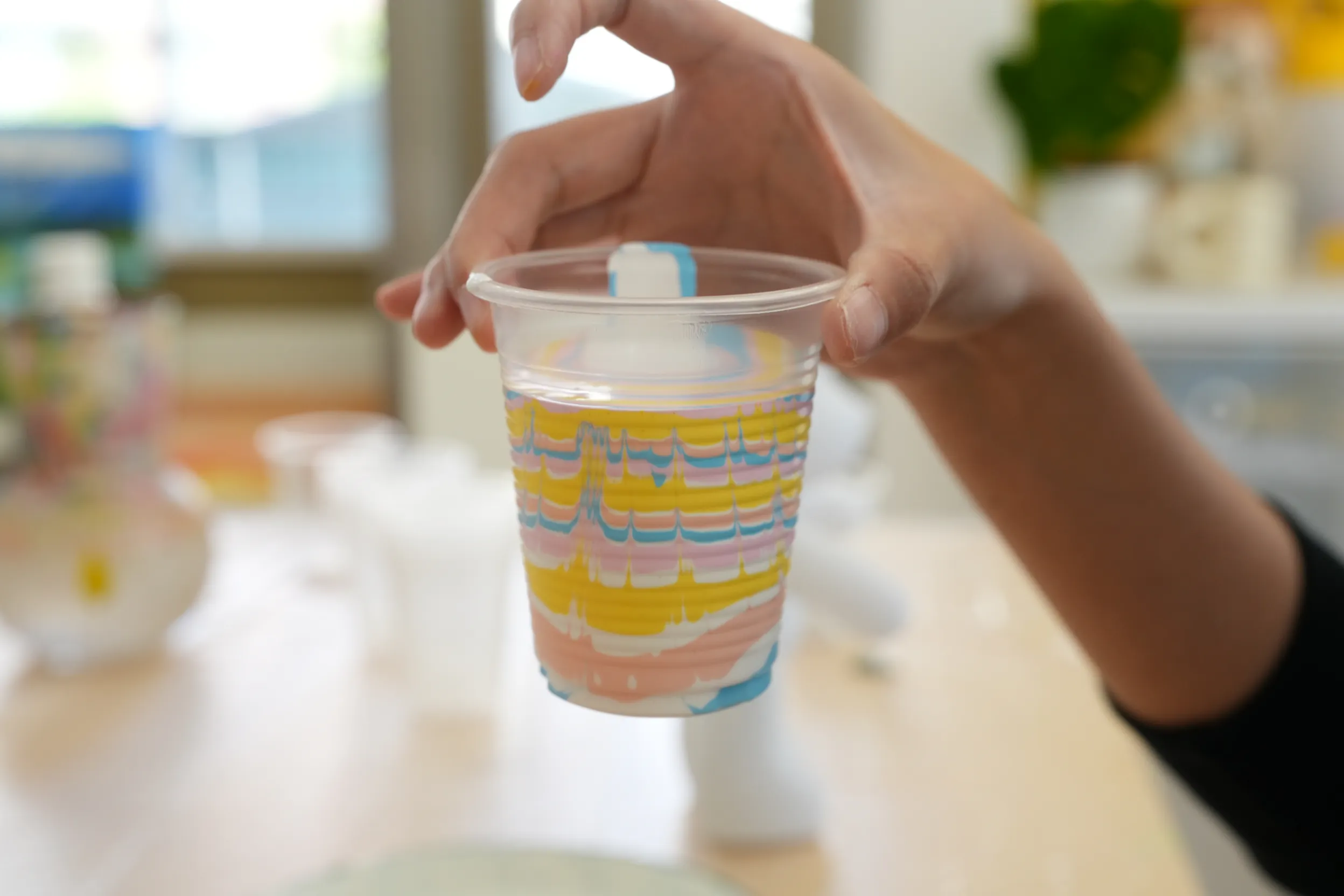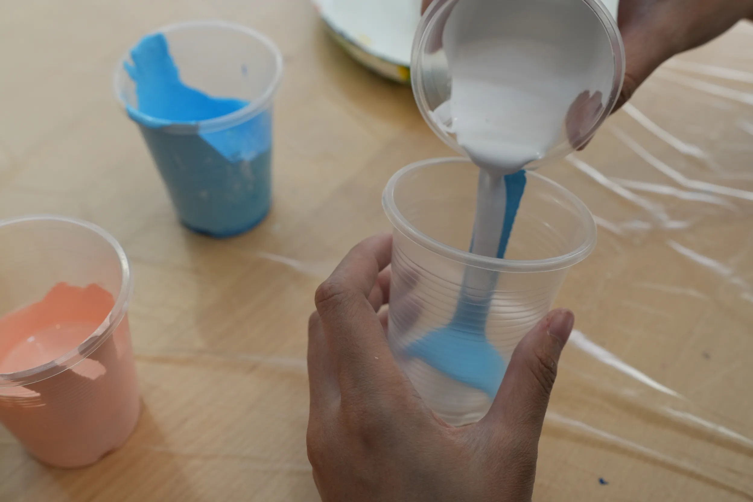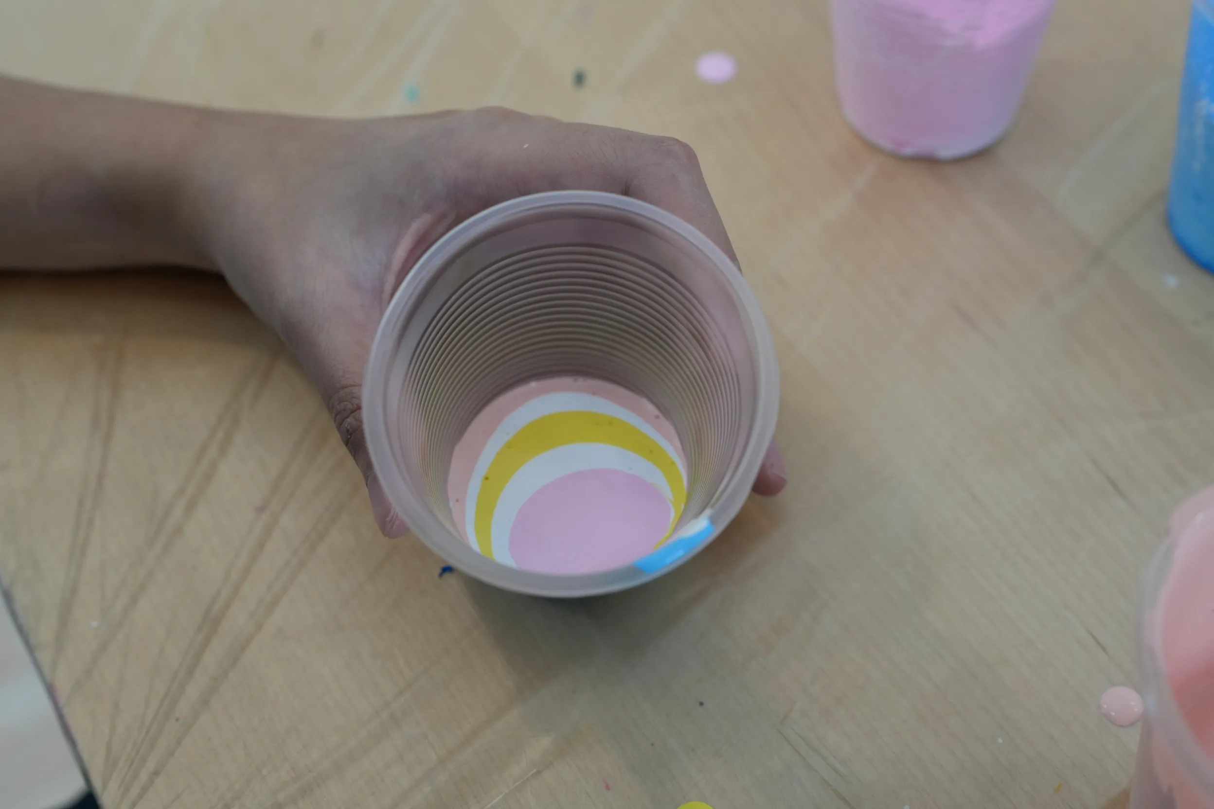 ▼倒顏料沒有一定順序,盡量把顏色錯開且平均沿著塑膠杯的杯身倒入另一個塑膠杯中,過程中要盡量避免搖晃導致顏料融合,這樣顏色就會混到比較不好看。