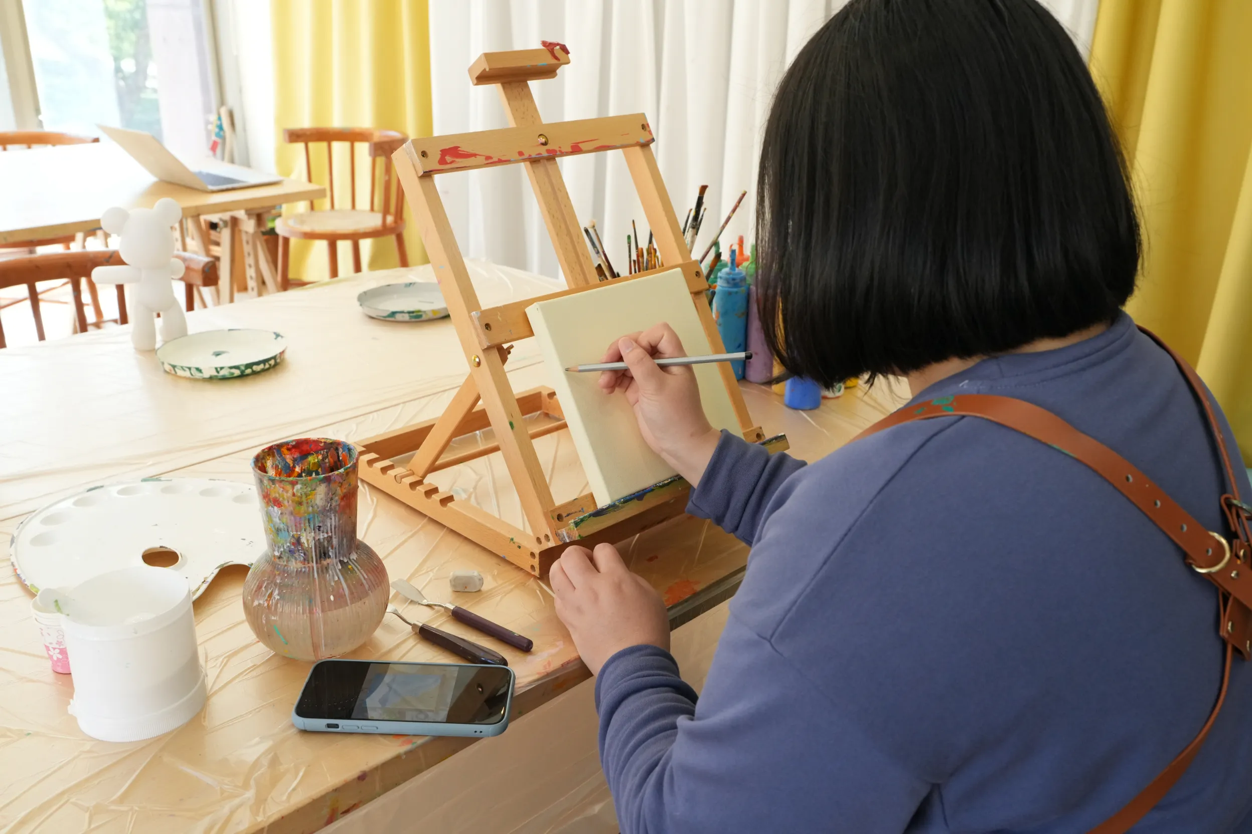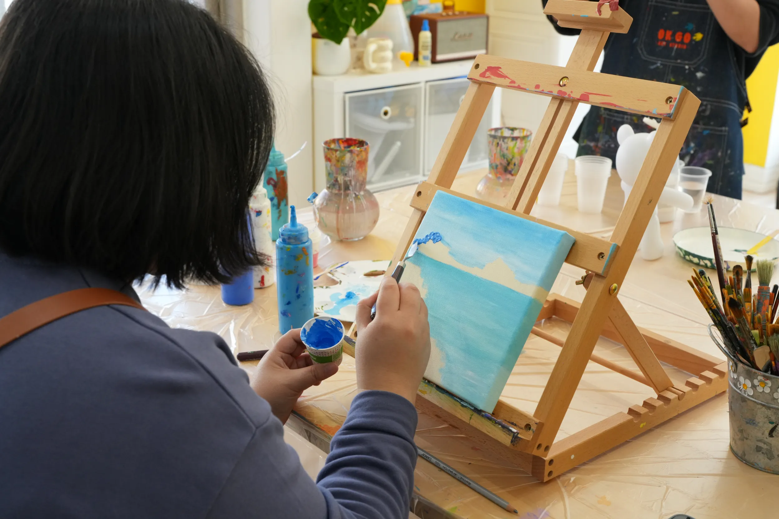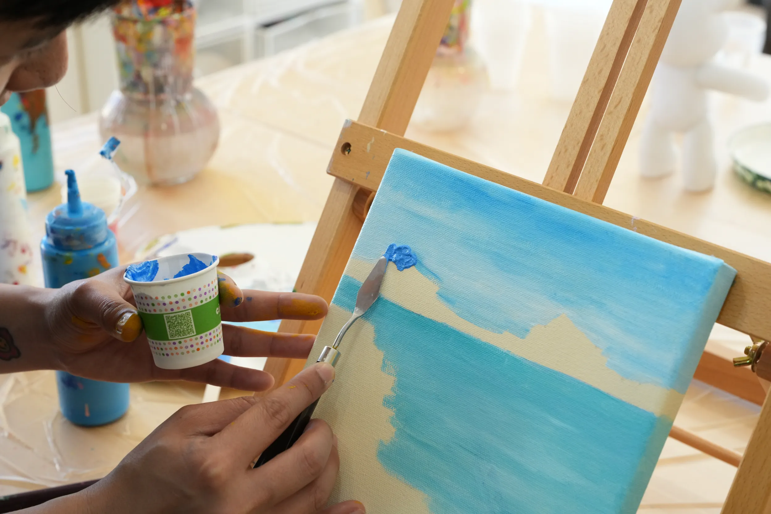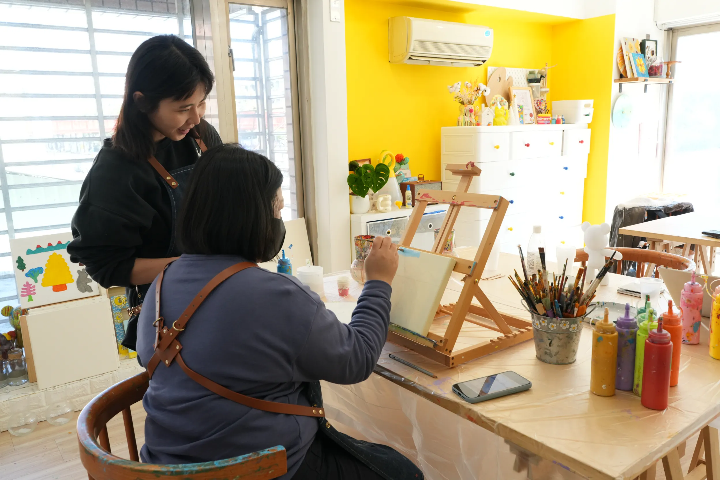 在體驗肌理畫的過程中,如果遇到任何問題,都可以隨時向老師請教,無論是技巧上的疑惑或顏料運用的細節,老師都會耐心解答。在畫室內創作氛圍輕鬆愉快,老師非常親切幽默,不時與你互動聊天,還會貼心地幫忙拍下創作瞬間,增添不少樂趣與紀念價值。