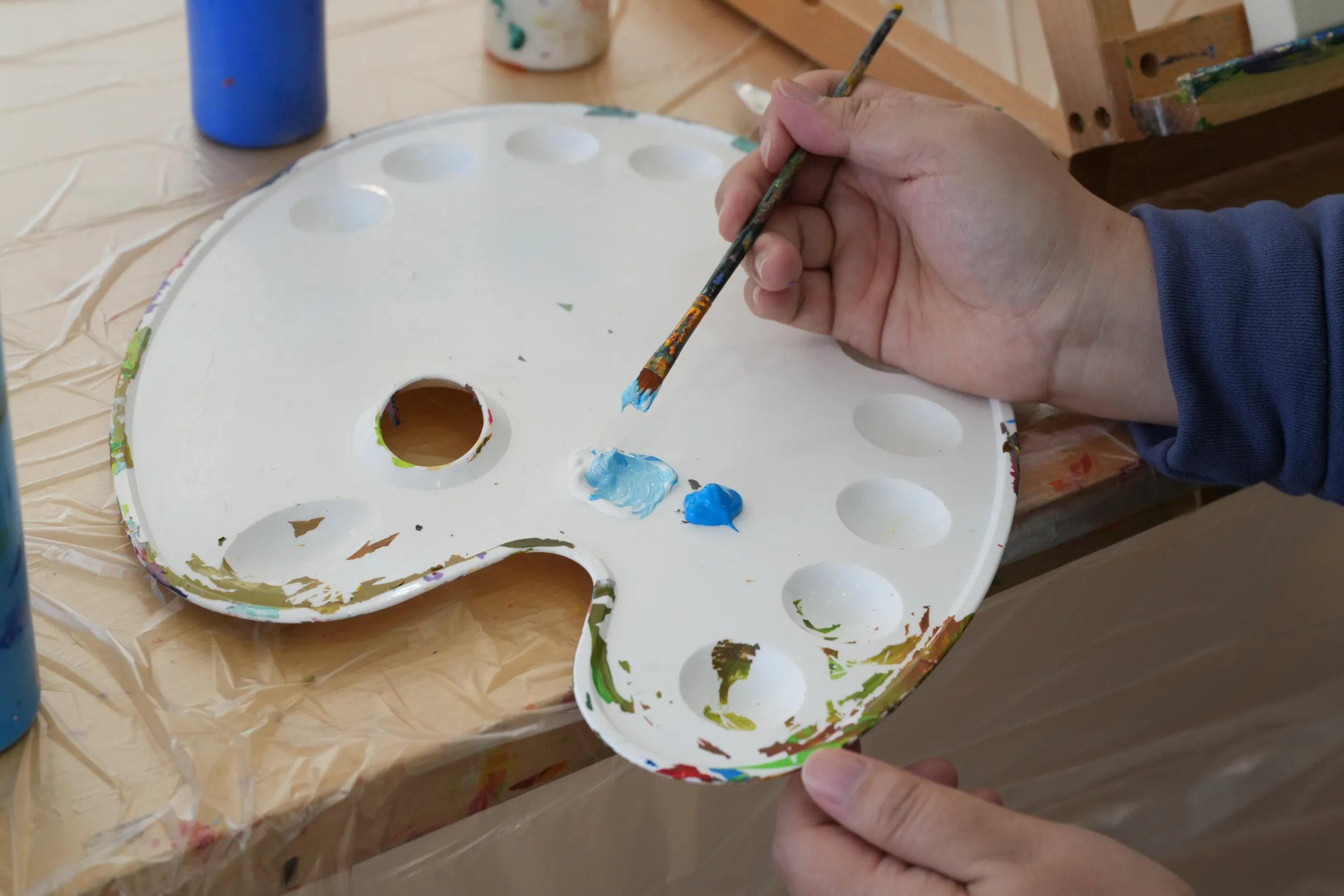 ▼我選了淺藍和寶藍作為天空與海洋的顏色,老師建議可以加入白色顏料,調出不同層次的藍色,使整體搭配更和諧。