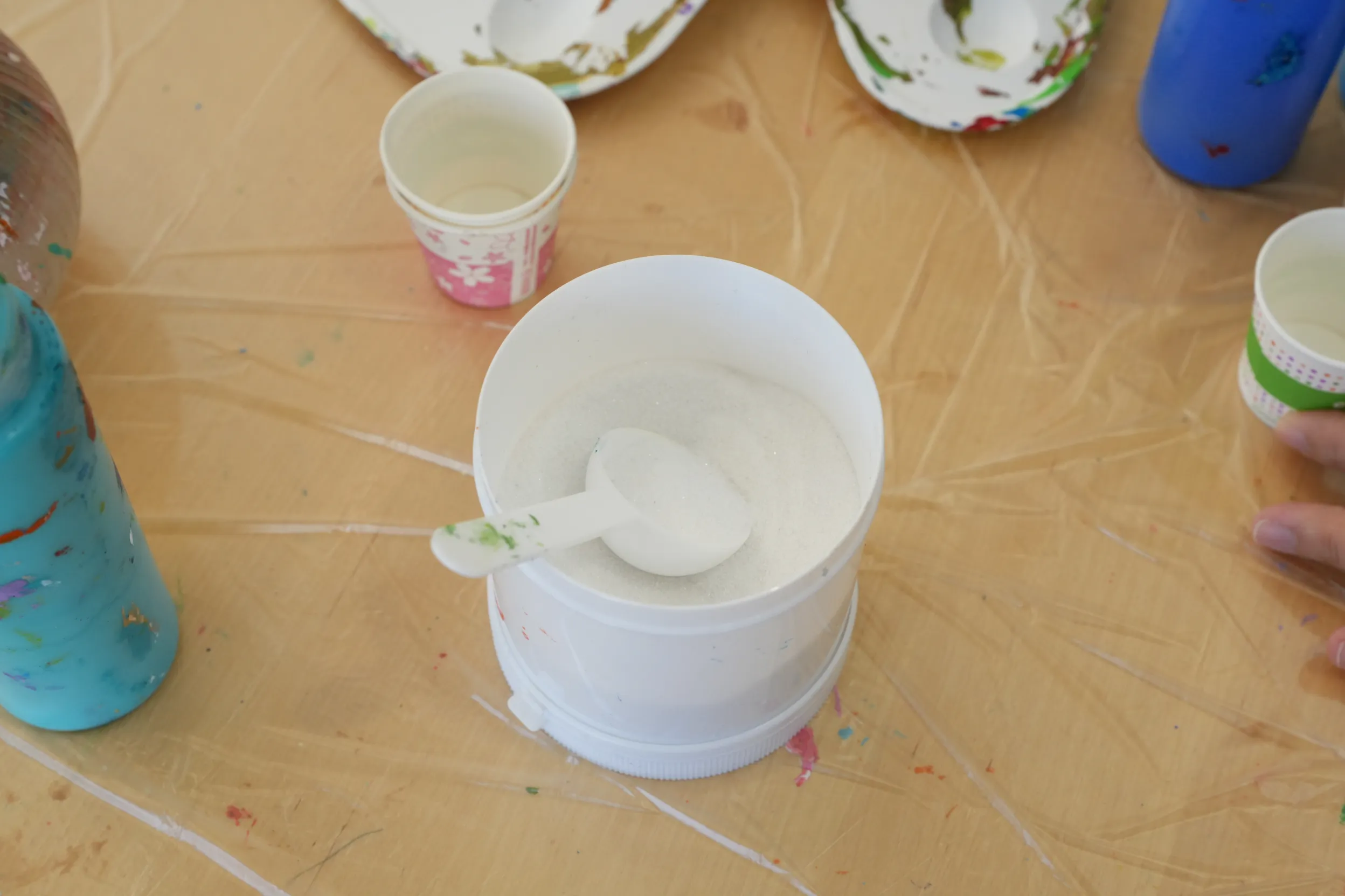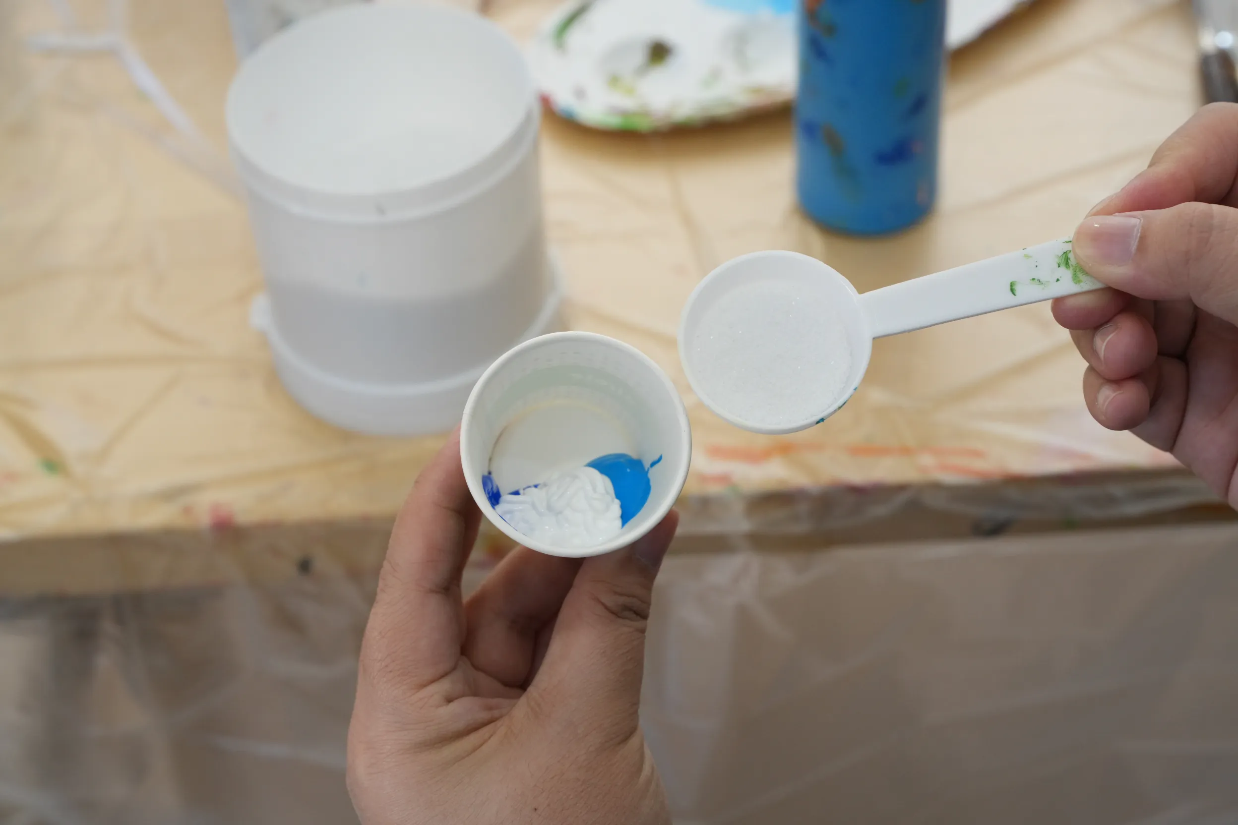 ▼將壓克力顏料擠入小紙杯中,再加入一匙石英砂,準備調製出具有肌理效果的沙質顏料。