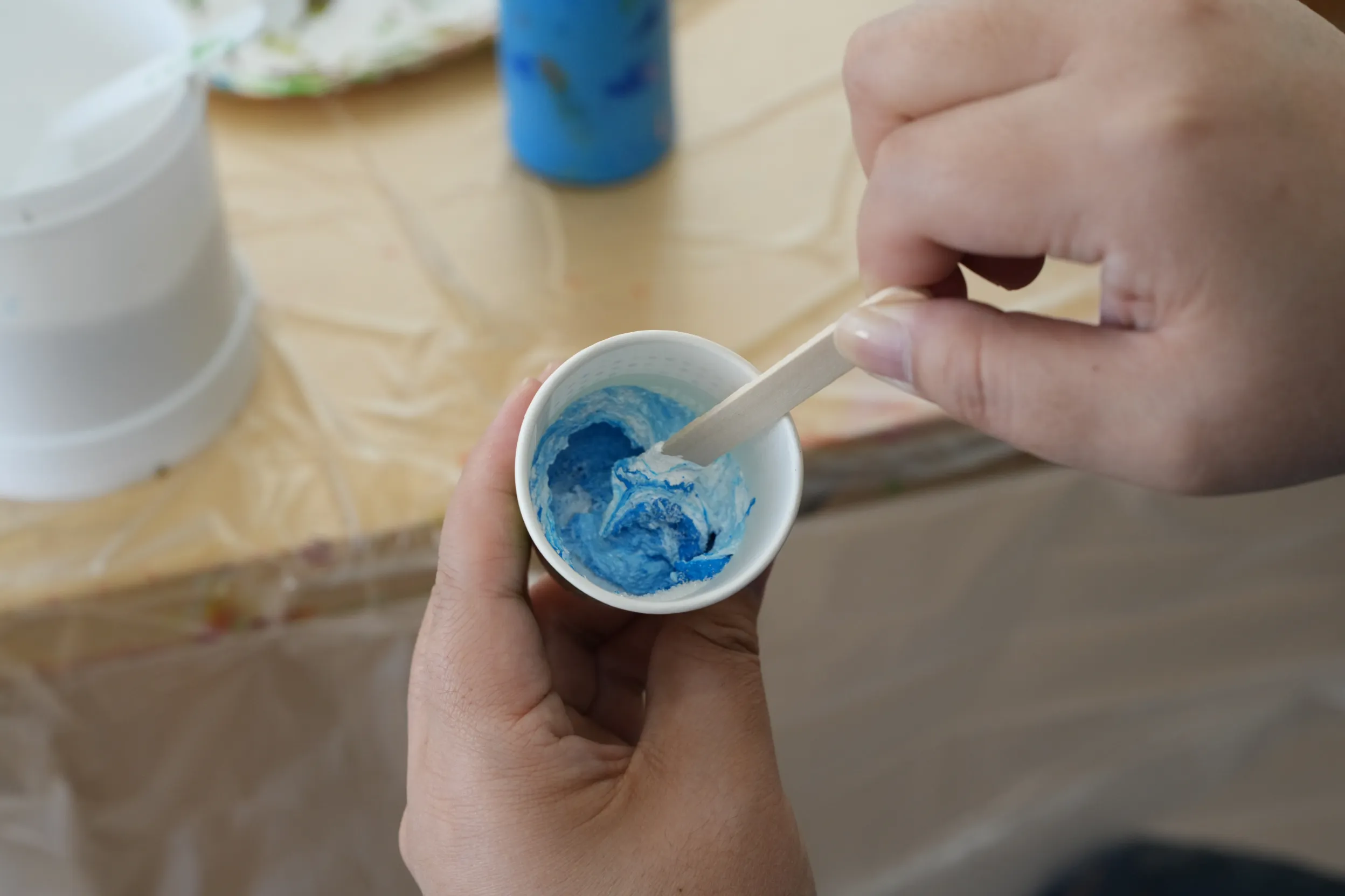 ▼先將淺藍色顏料擠出後,加入白色調亮,讓畫面呈現出不同層次的藍色,看起來更加豐富。