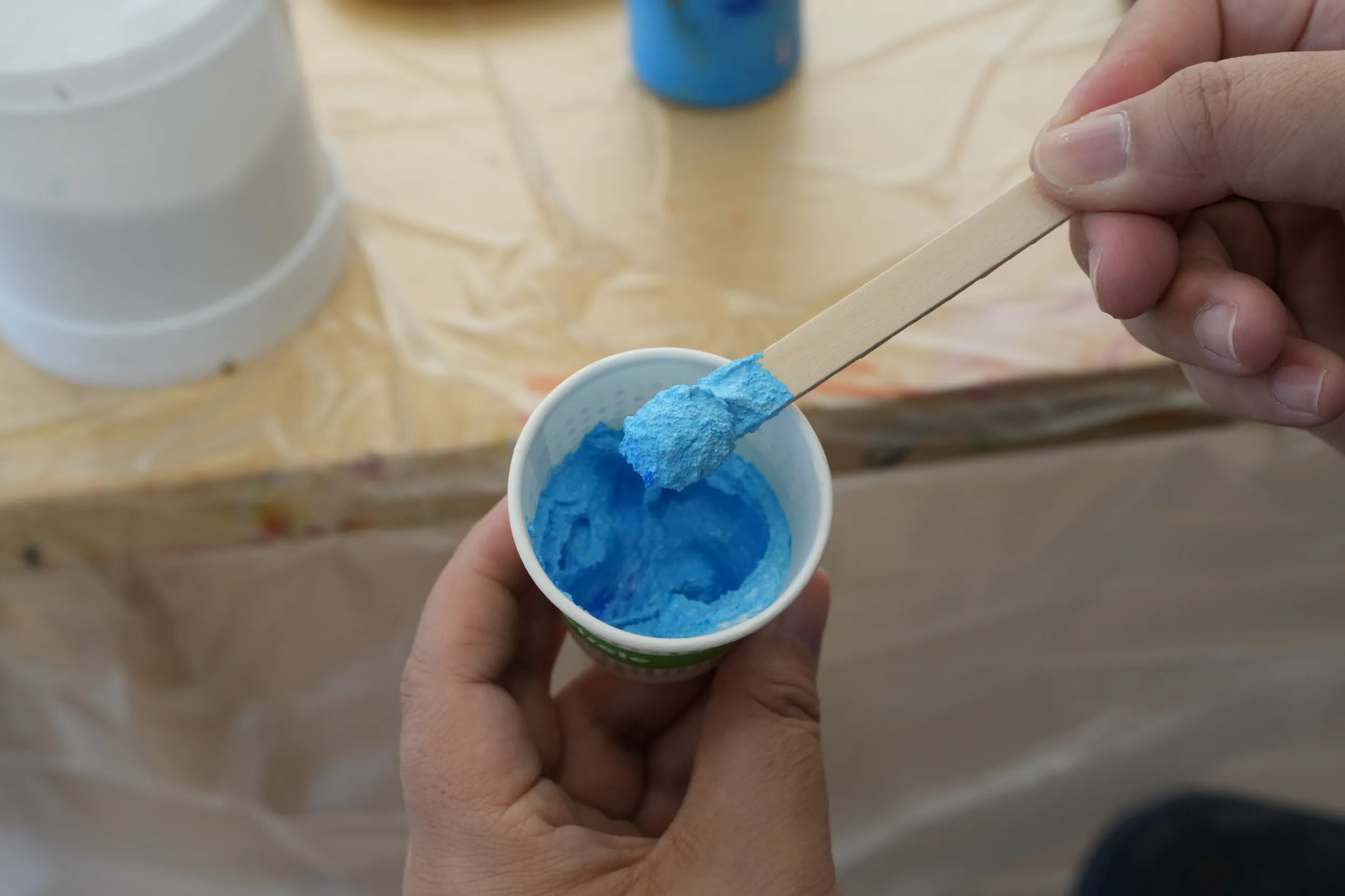 ▼之後再用冰棒棍輕輕沾取盤中的顏料,以輕點方式補在尚未上色的區域,讓整體更均勻。
