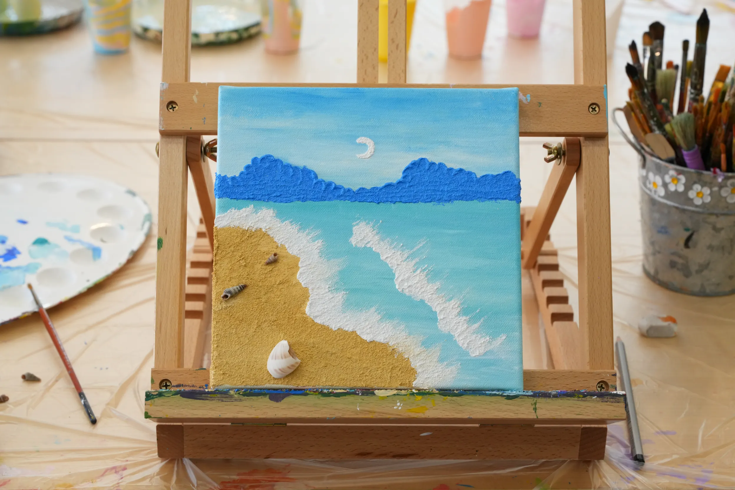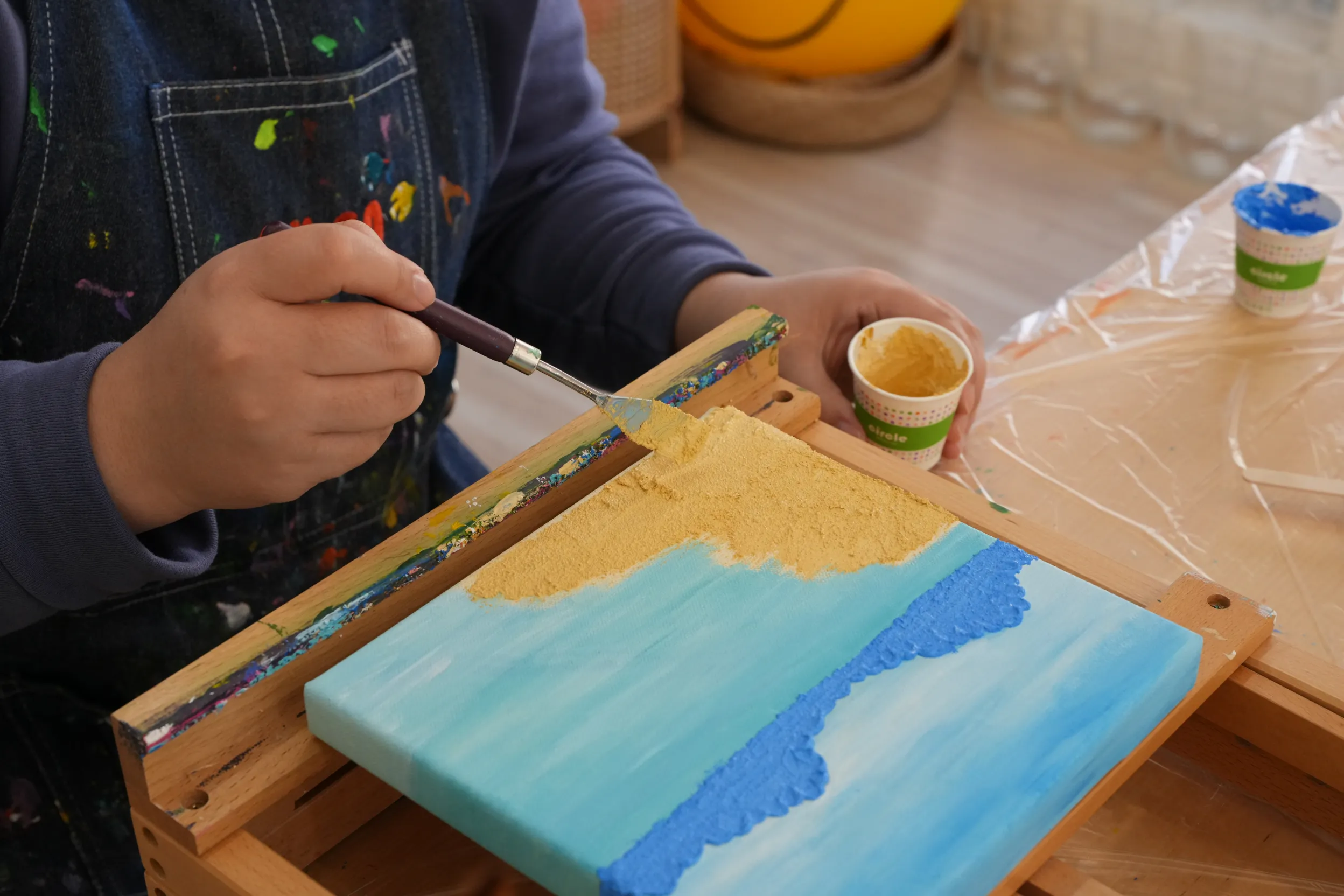 這次我體驗了石英砂肌理畫,將自己挑選的海邊照片給老師看,老師表示作品難度不高,預計兩小時內就能順利完成。