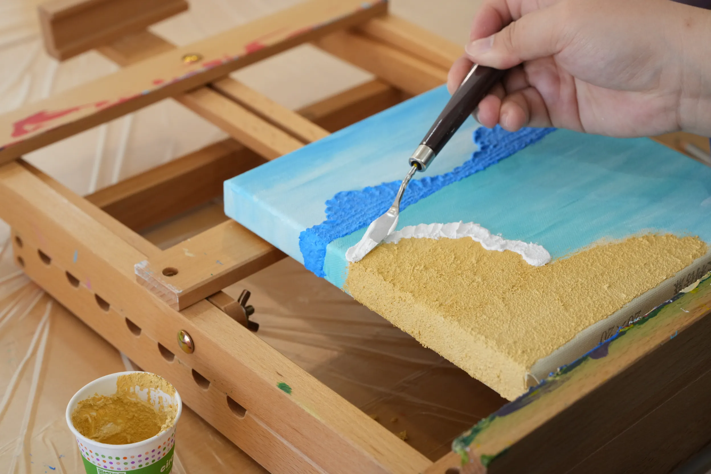 ▼老師示範如何用刮刀塗抹石英砂,要少量取用,並刮出如雲朵般的立體效果。