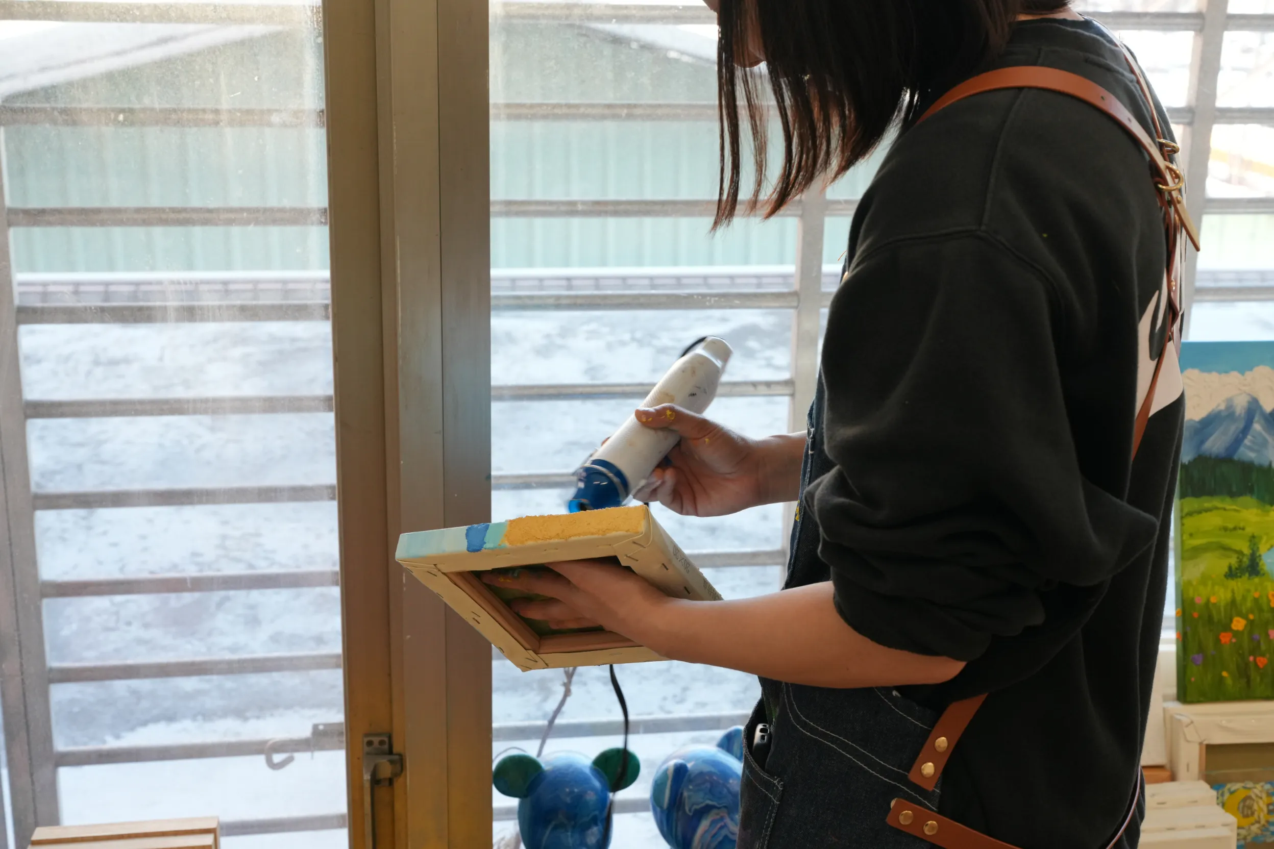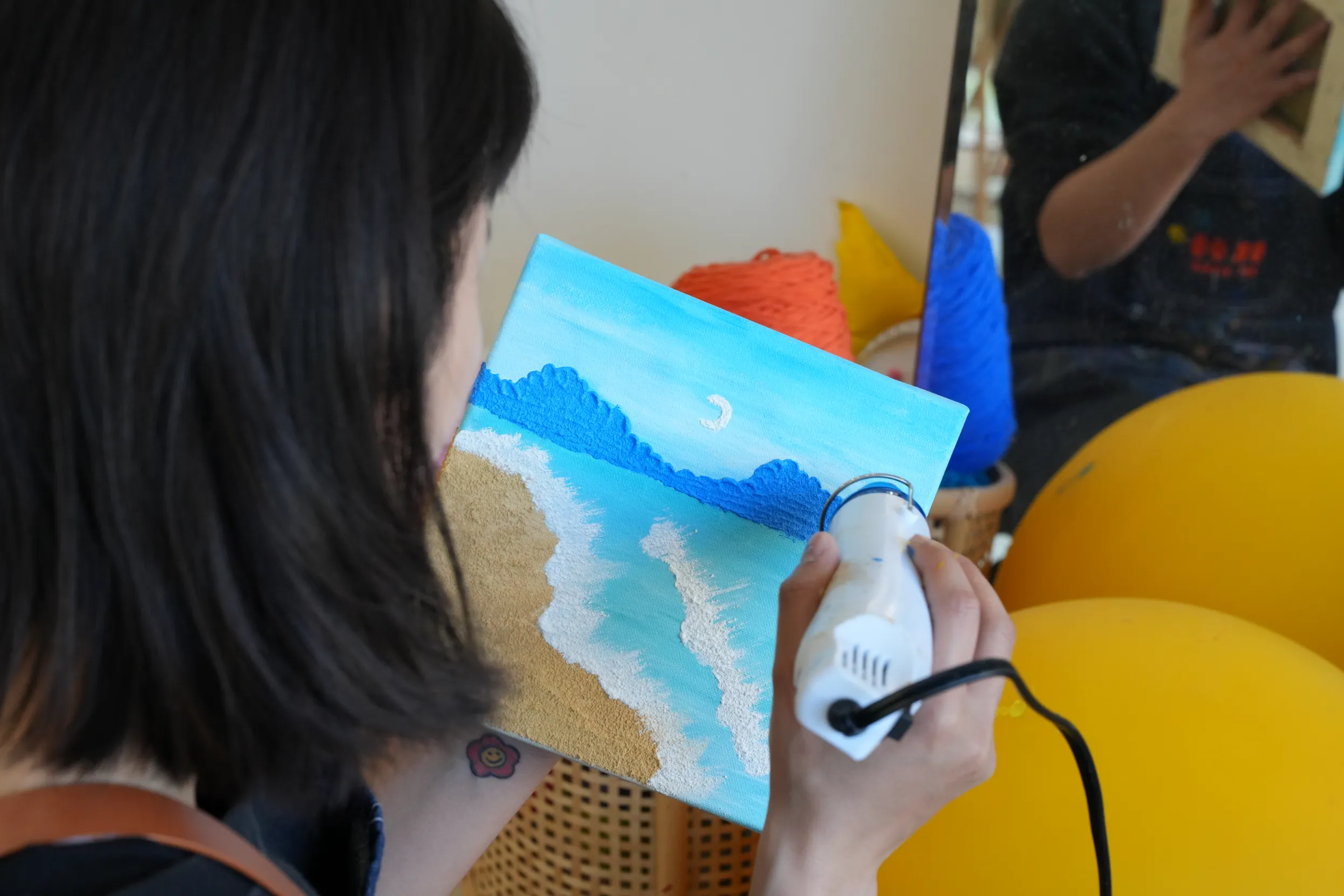 ▼畫作完成後,需要用熱風槍將顏料吹乾,這個步驟由老師協助完成,確保作品定型完整。