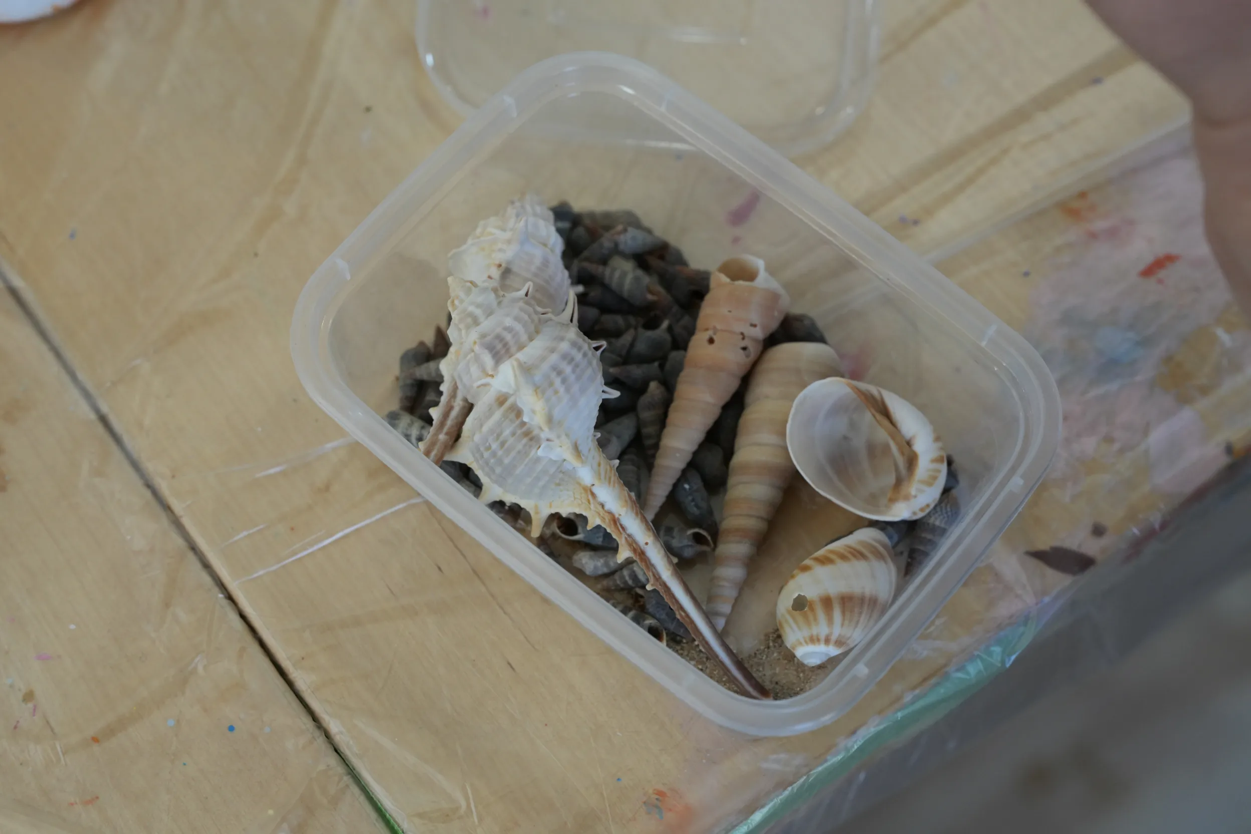 ▼老師突然拿出一小盒實體貝殼,讓我選 2~3 個貝殼貼在沙灘上,這樣不僅增加畫作的層次感,也讓整體更生動豐富。