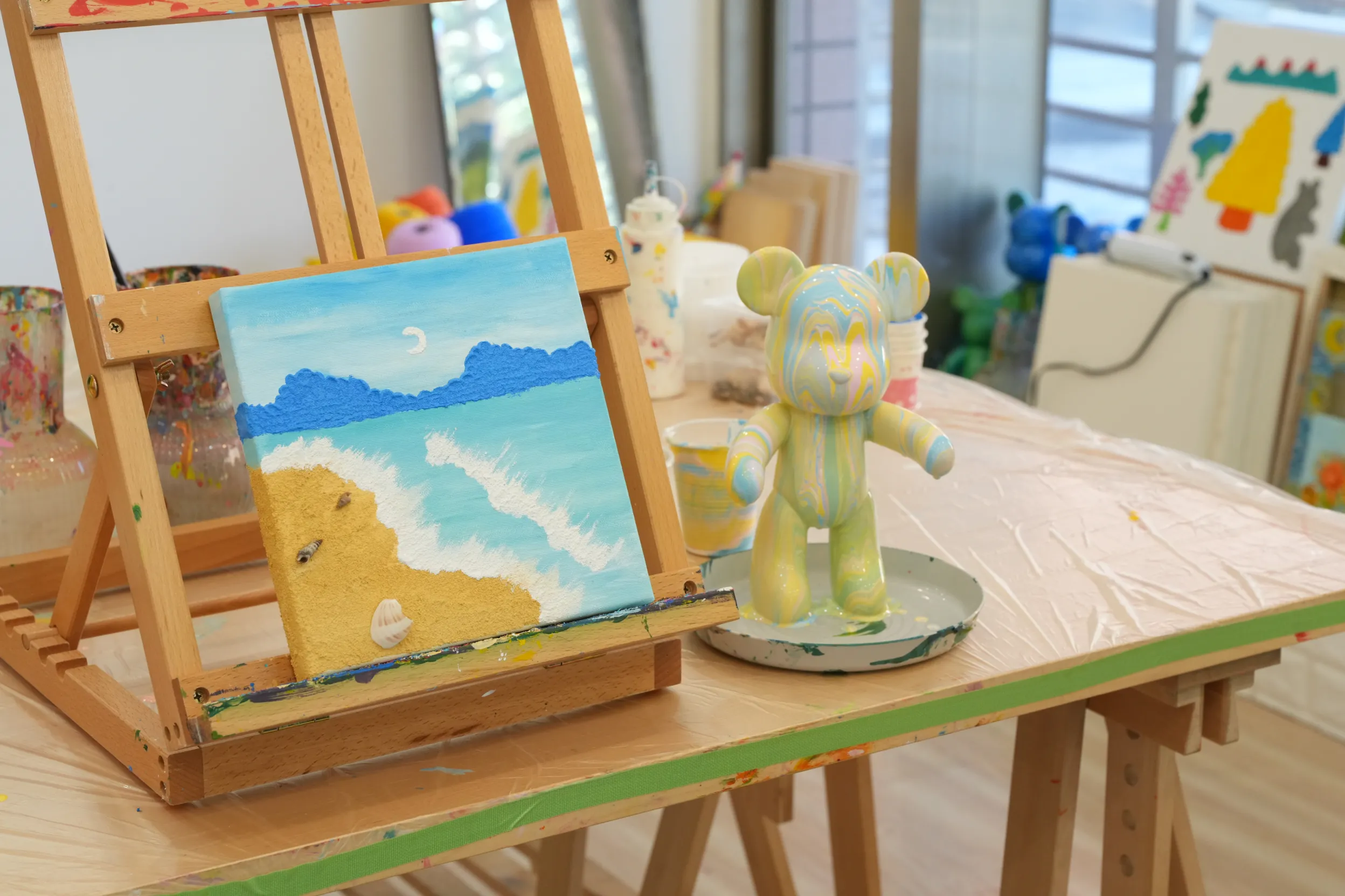 ▼我的石英砂肌理畫和朋友的流體熊都順利完成啦!而且都在預定時間內完成,老師掌控時間非常得宜,整個創作過程輕鬆愉快,我們對作品和體驗都非常滿意,收穫滿滿。