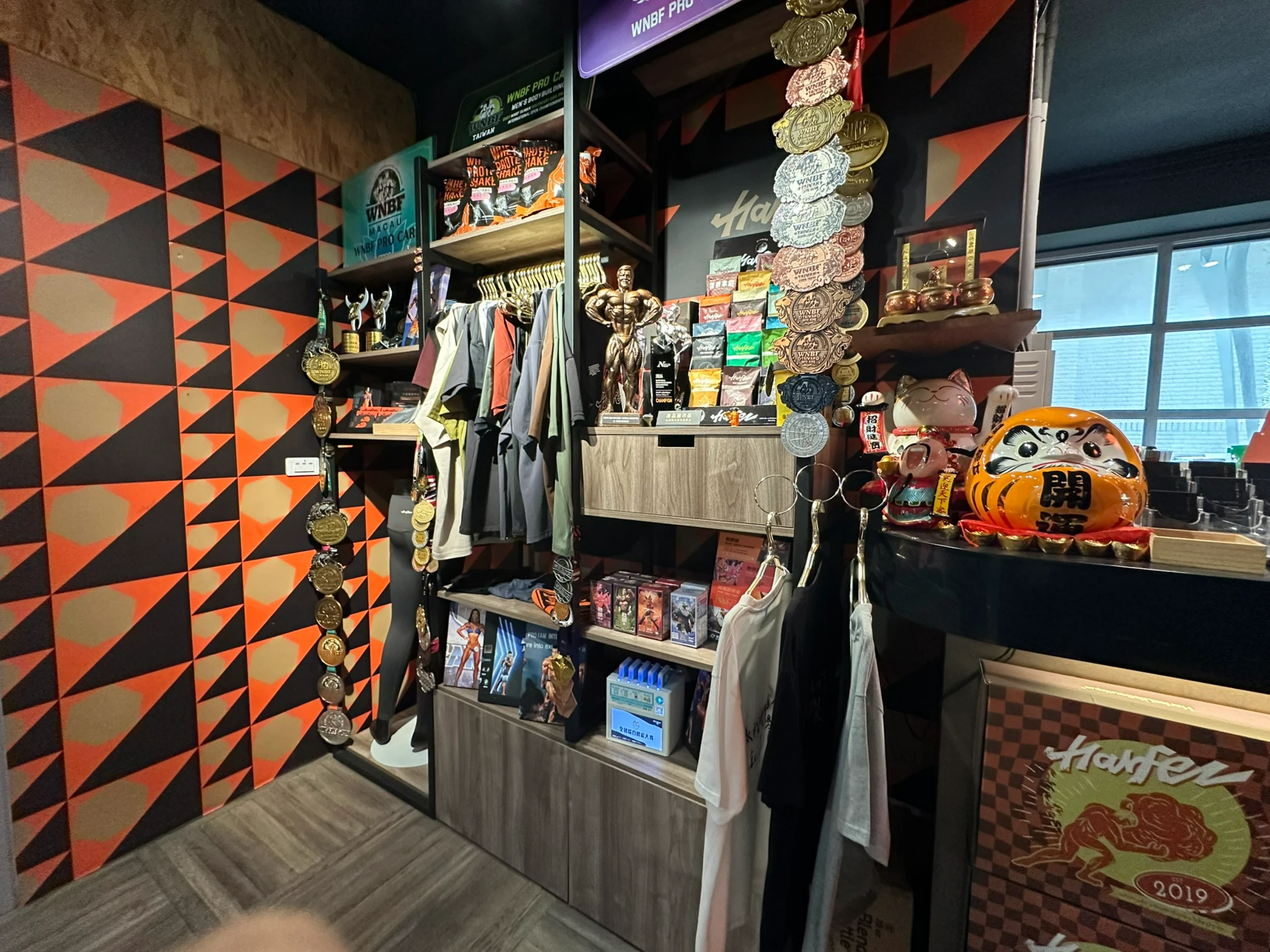 ▼樓梯上來後會看到力宴健身房櫃台,這裡有展示衣服、健身食品、大大小小的健身賽獎牌。