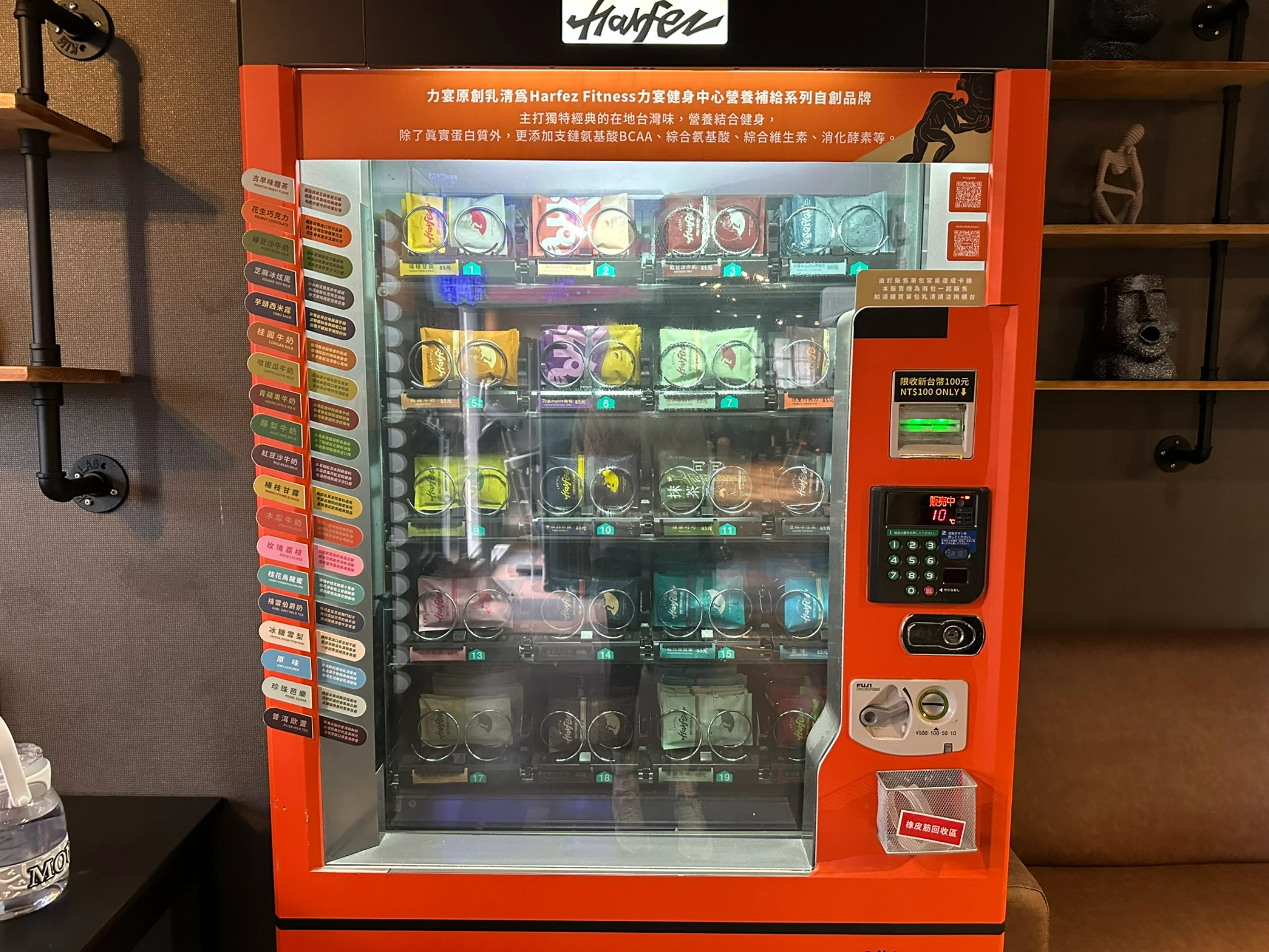 ▼靠近窗戶的位置設有一台販賣機,裡面販售多樣化口味的蛋白飲,選擇相當豐富,這是力宴自健身中心自創品牌「Harfez Protein 力宴原創乳清蛋白」,主打獨特經典的台灣口味,可以依照當天的喜好挑選自己想喝的口味。