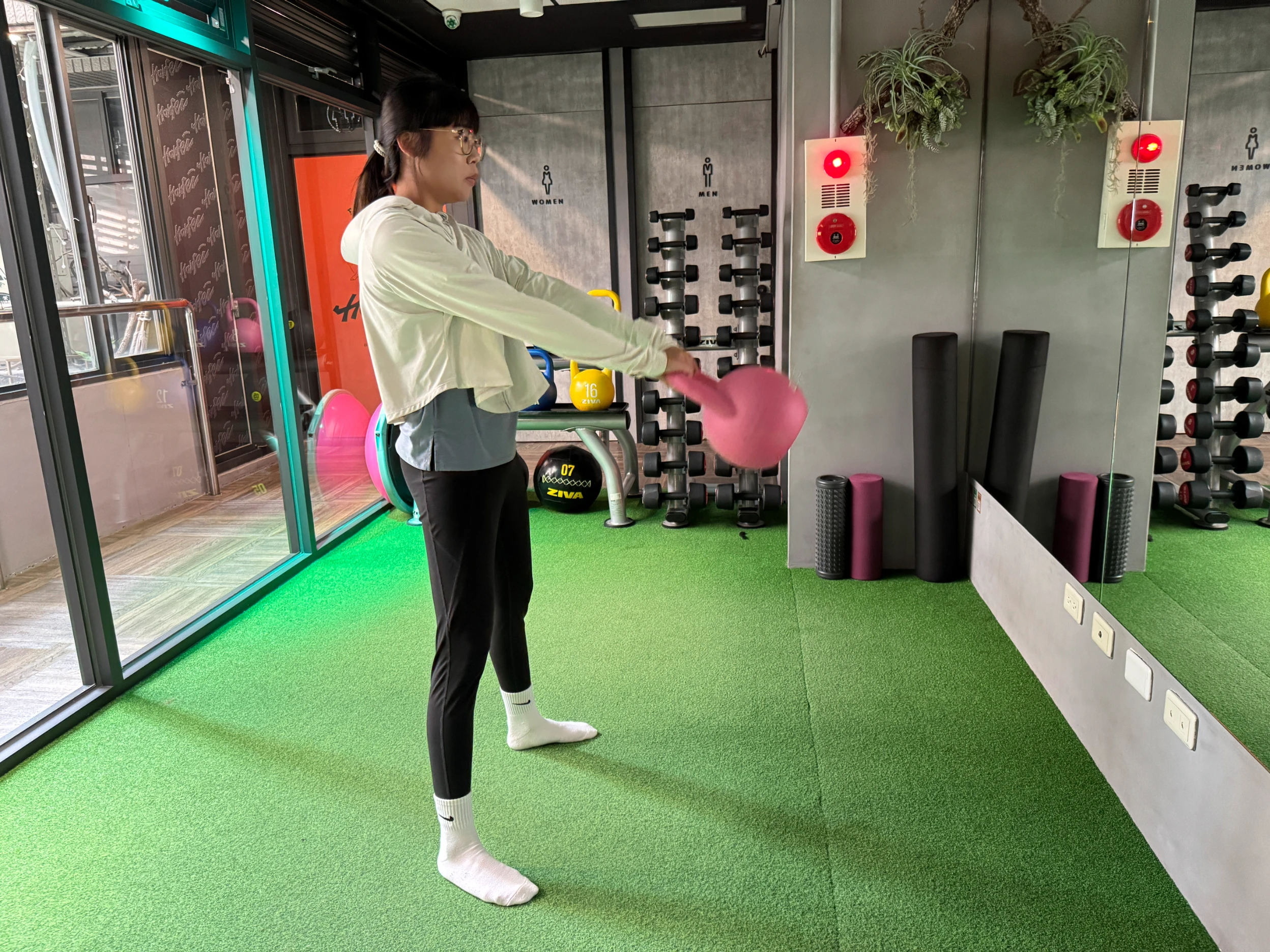 ▼接著開始使用壺鈴進行訓練,專注地完成每一個動作,透過擺動與控制重量,不僅鍛鍊全身肌群,也提升了運動的趣味與挑戰感。