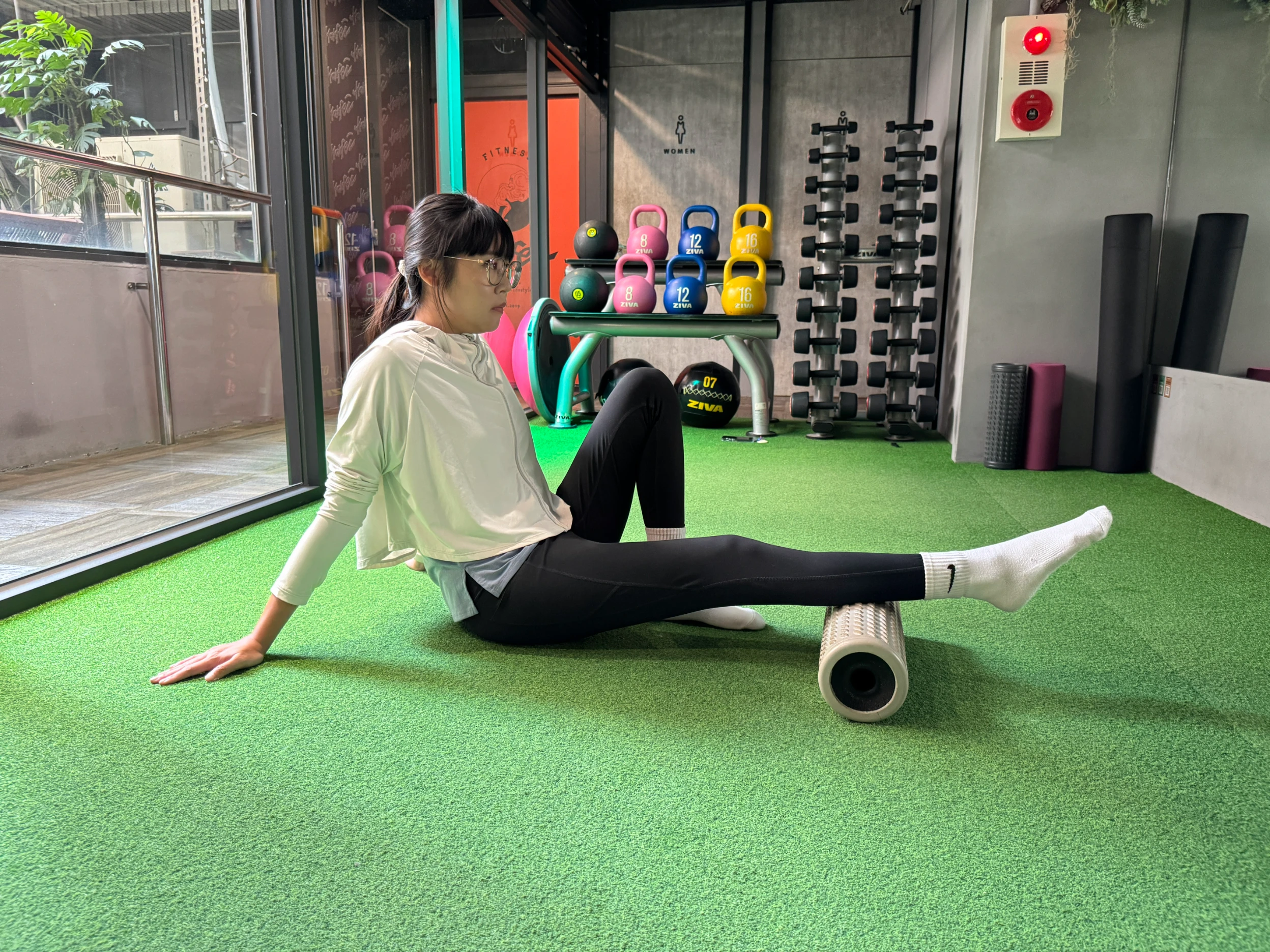 ▼做訓練前暖身腿部也是很重要的,利用滾筒來做筋膜放鬆,幫助肌肉放鬆、減少緊繃感。