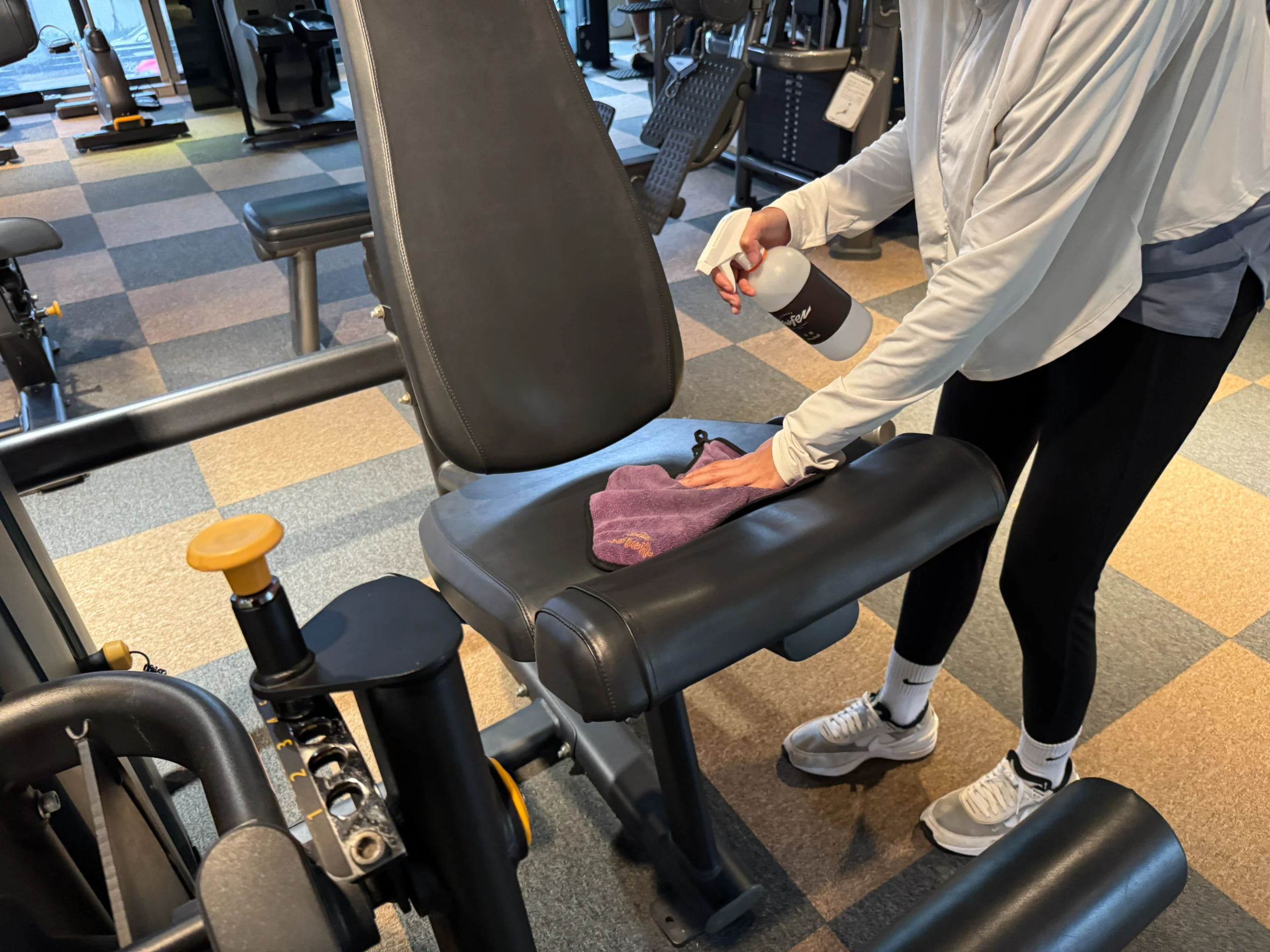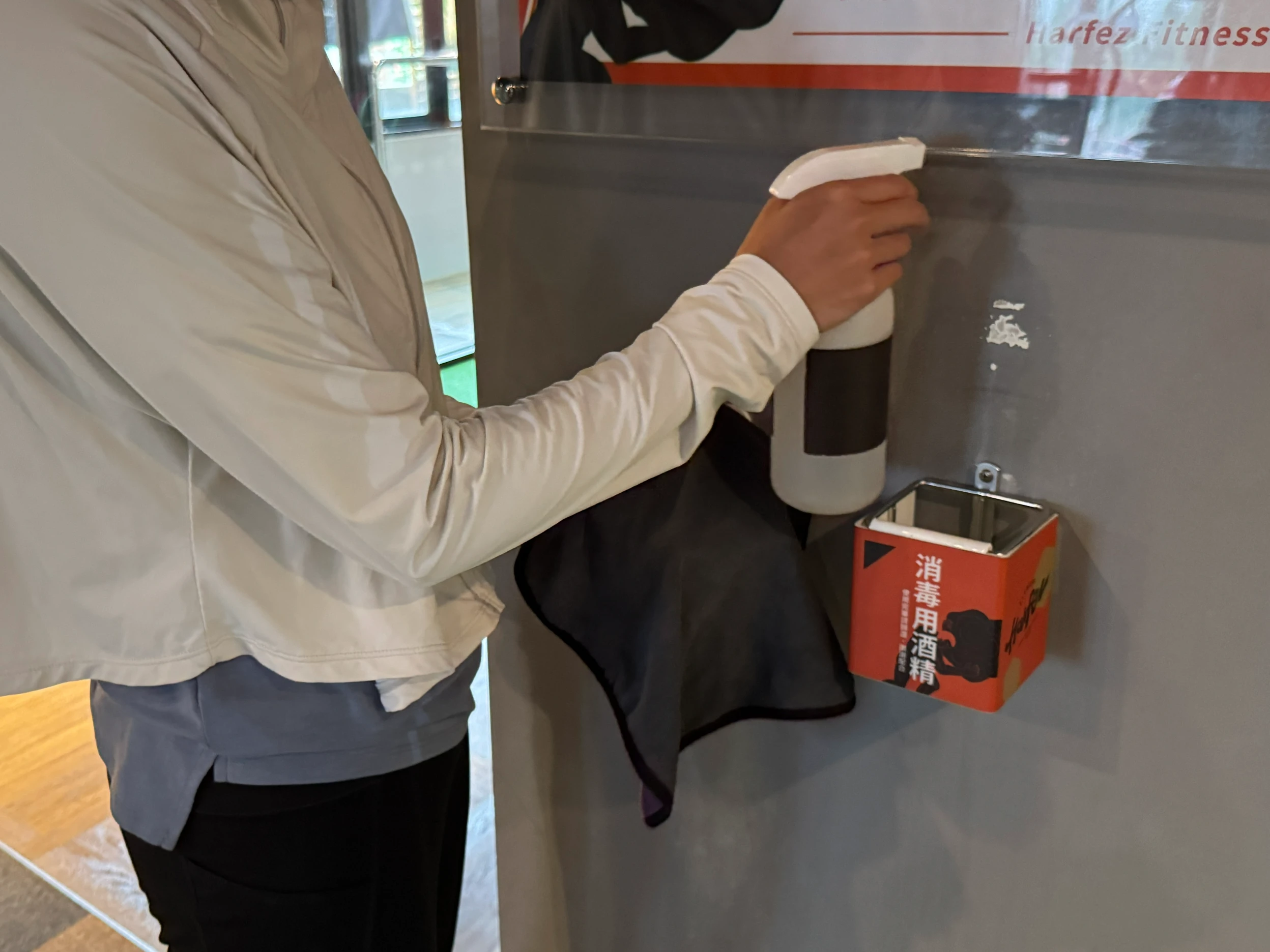 ▼當你使用完器材後,可以拿取抹布噴上酒精消毒座椅,並用抹布擦拭乾淨後歸回原位,既保持個人衛生,也讓下一位使用者能有整潔、安全的運動環境。