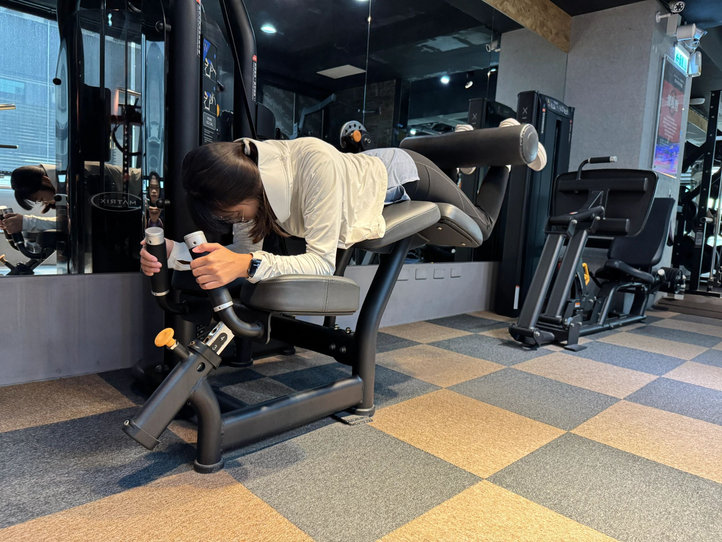 ▼「俯臥腿彎舉機」是用來鍛鍊大腿後側肌肉的經典器材,對於修飾腿部後側線條非常有效,實際操作起來挺累的。