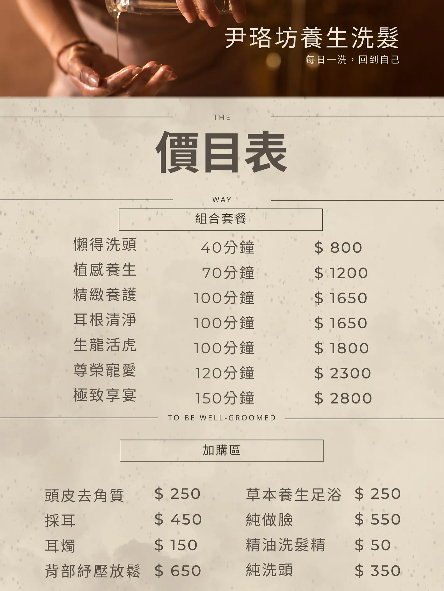 ▼「尹珞坊養生洗髮」提供多種不同的洗頭方案,從基礎到全套方案通通都有,客人可以依照預算及想要的項目做選擇,也有採耳+洗髮的方案,以下是官方的價目表及詳細方案內容,提供給大家參考。