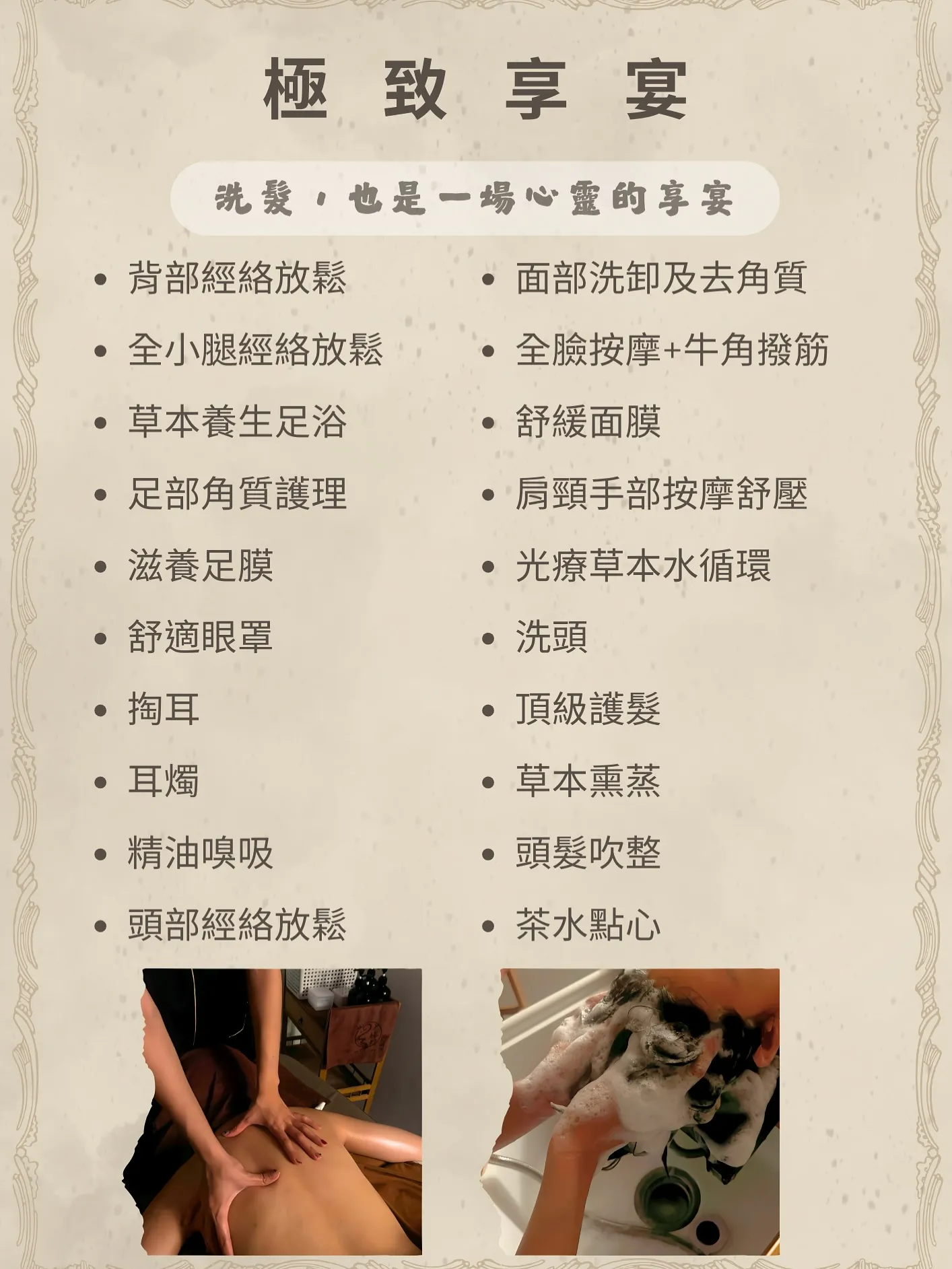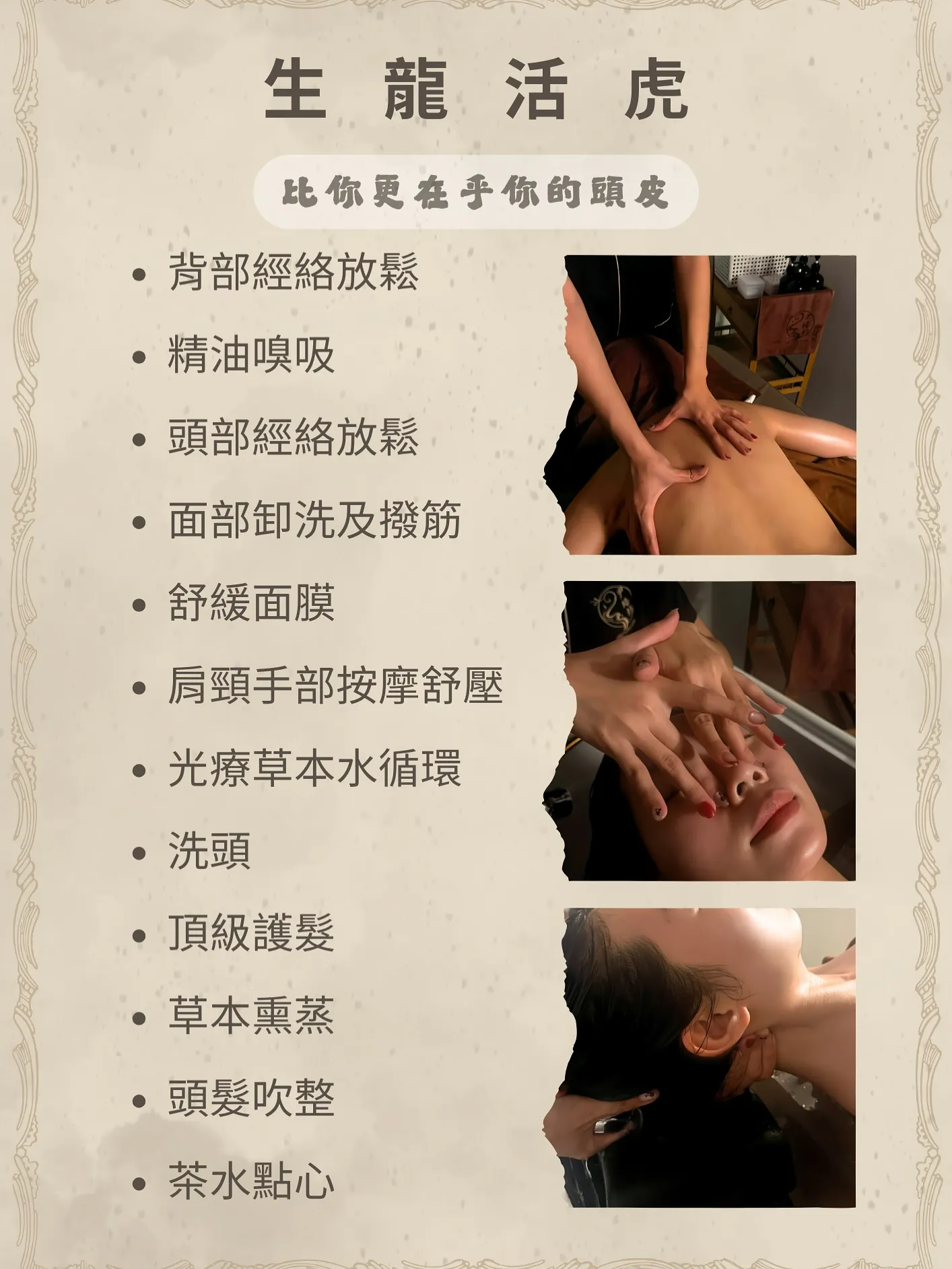 「尹珞坊養生洗髮」是台南七月全新開幕的越式洗髮店,提供7種不同的洗髮套餐,也有多種單品項目可以加購,讓客人可以在這邊完全放鬆下來。這次朋友體驗的是「生龍活虎」方案,課程中包含上半身精油按摩、臉部撥筋、護髮等項目,不過所有的按摩僅限於上半身,下半身基本上是沒有施作到的,如果想要有足浴的話,可以直接加購足浴項目。