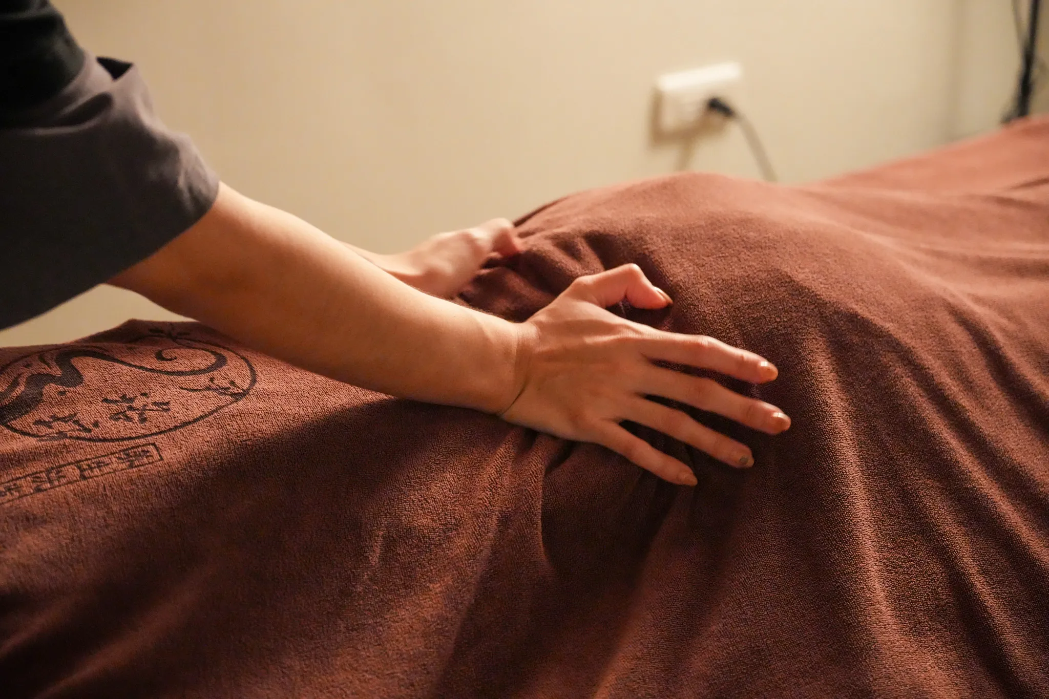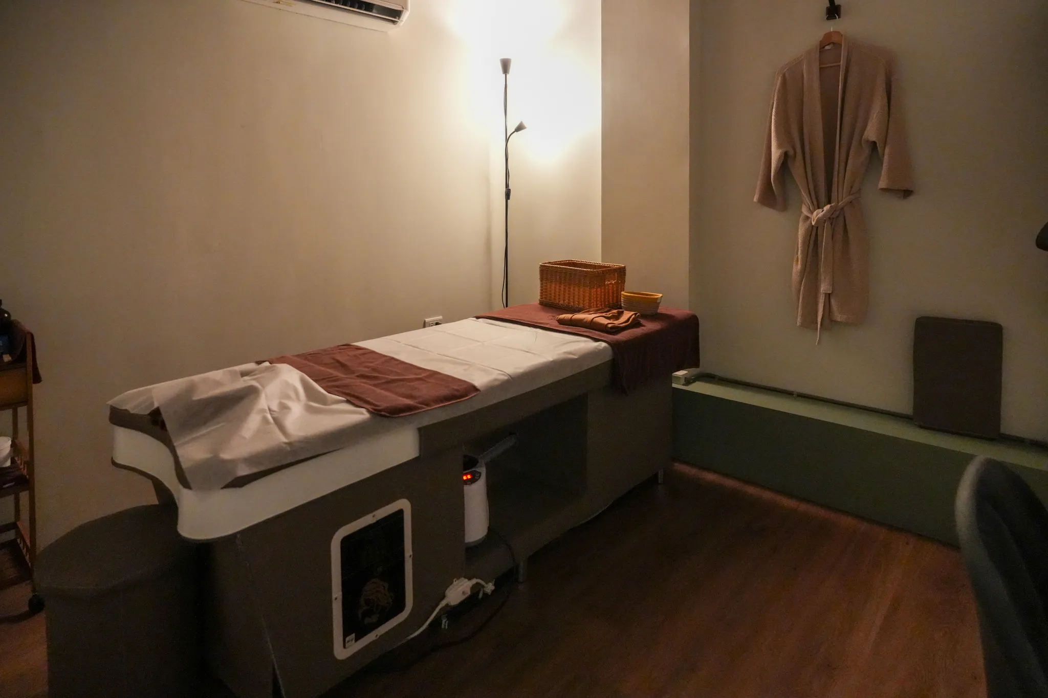 這次朋友選擇的是中價位的「生龍活虎」方案,課程包含上半身經絡按摩、洗頭、臉部洗卸及撥筋等項目,首先服務人員會請你先換上包廂內的專用美容袍,由於這個方案只有針對上半身做油壓,所以只須將上衣及內衣脫掉,下半身和襪子都不用換。