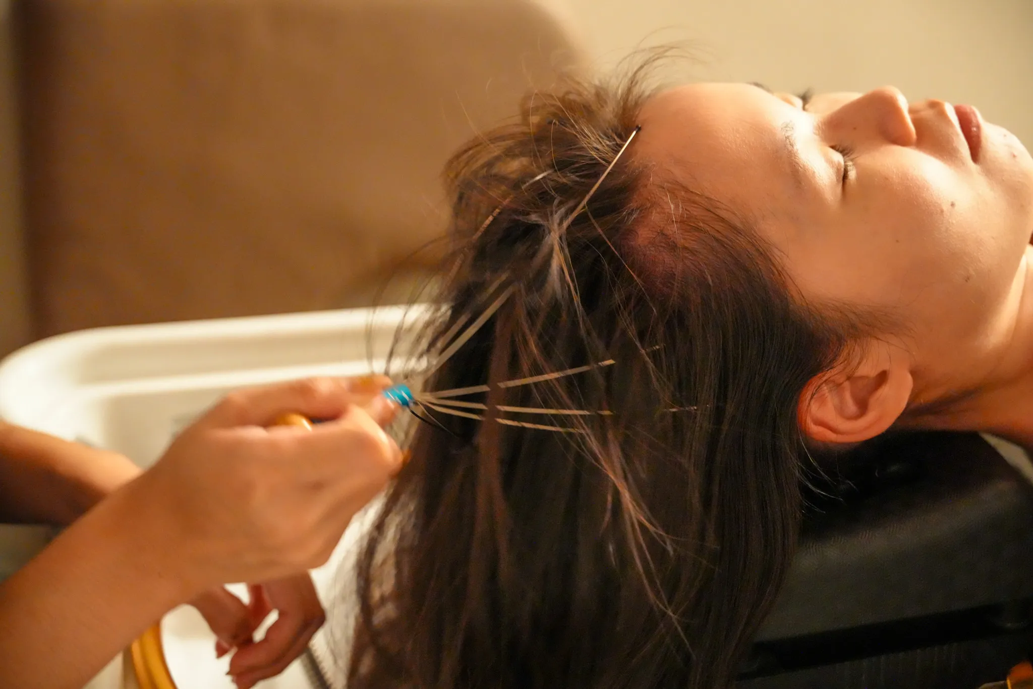 ▼嗅吸後的步驟是頭部經絡放鬆,會使用梳子、刮痧棒和細細的頭部按摩器,梳子是刺激頭皮穴道,刮痧棒則是全面性的按摩,頭部按摩器會有種被小小的細針舒緩放鬆的感覺。