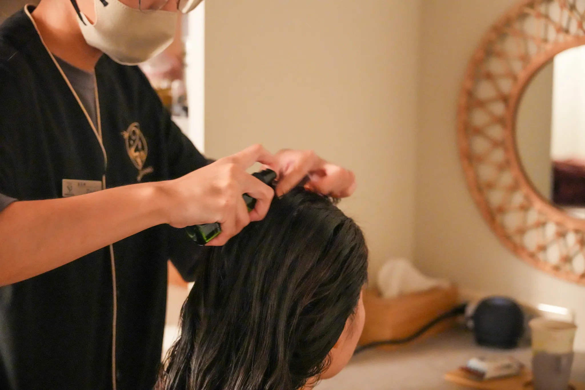 ▼起身換好衣服後,會在包廂內先吹乾頭髮,開始吹頭髮之前會幫忙噴上頭皮水,後來服務人員有發現朋友是捲髮,所以吹頭髮的時候有幫忙用手繞捲,吹完後也有確認乾度是否可以接受,十分貼心。