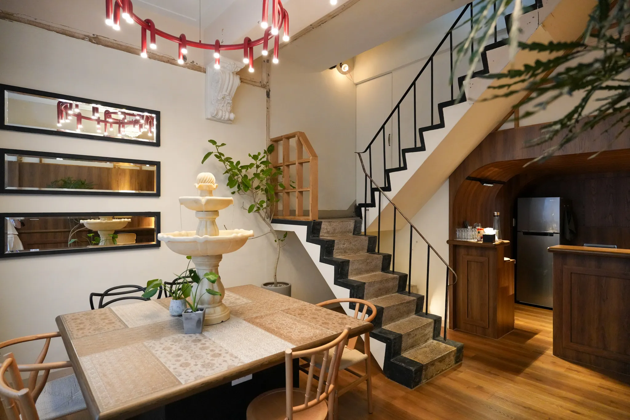 「ami14朋友食室」這間旅途中意外遇到的咖啡廳,推門而入就像來到台南的小歐洲,豪華的噴水池,巴洛克式的雕花建築,彷彿置身國外的餐廳享受高級下午茶一般,是好拍又舒適的用餐空間。這次嘗試的三種甜點都表現得不錯,布丁是有硬度的口感,不是入口即化的那種,有一定的甜度,但融合得很好;蕾夢塔酸中帶甜,可以嚐得出是用新鮮檸檬下去製作,誠意十足的檸檬塔,是朋友最喜歡的一款。