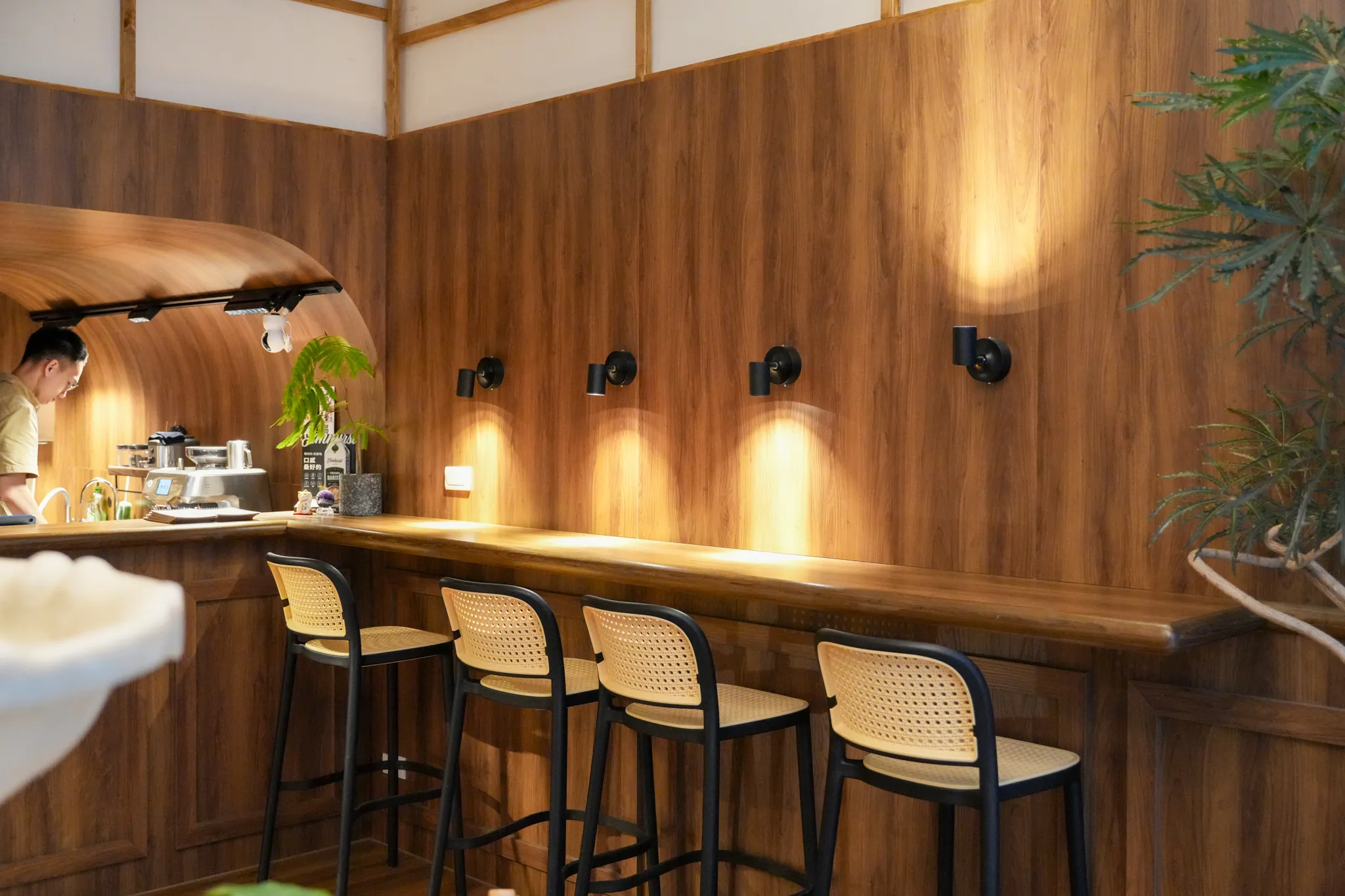 ▼一樓主要為製餐及點餐區,有一整排的吧台座位可以入座,家具、裝潢同樣是以木頭為主,連吊燈都有特別挑選過,可以感受到店家對店面裝潢的用心。