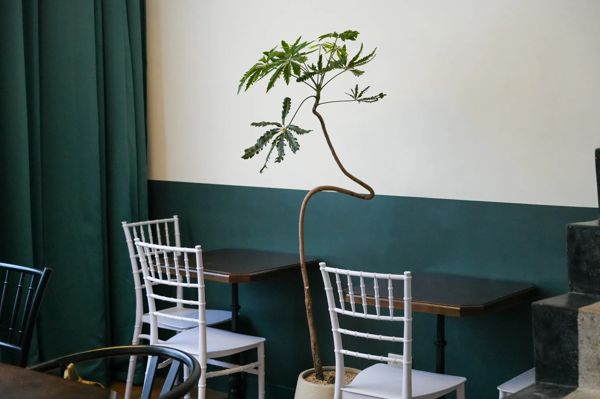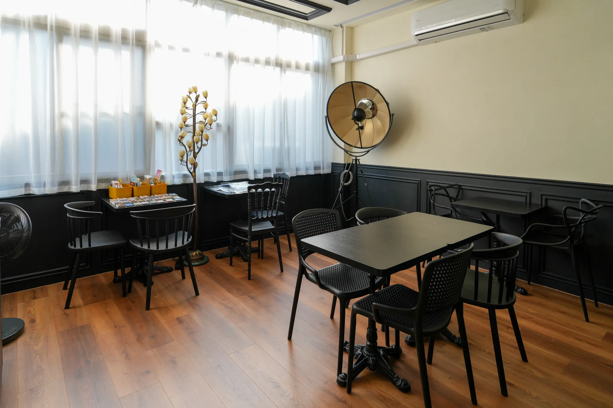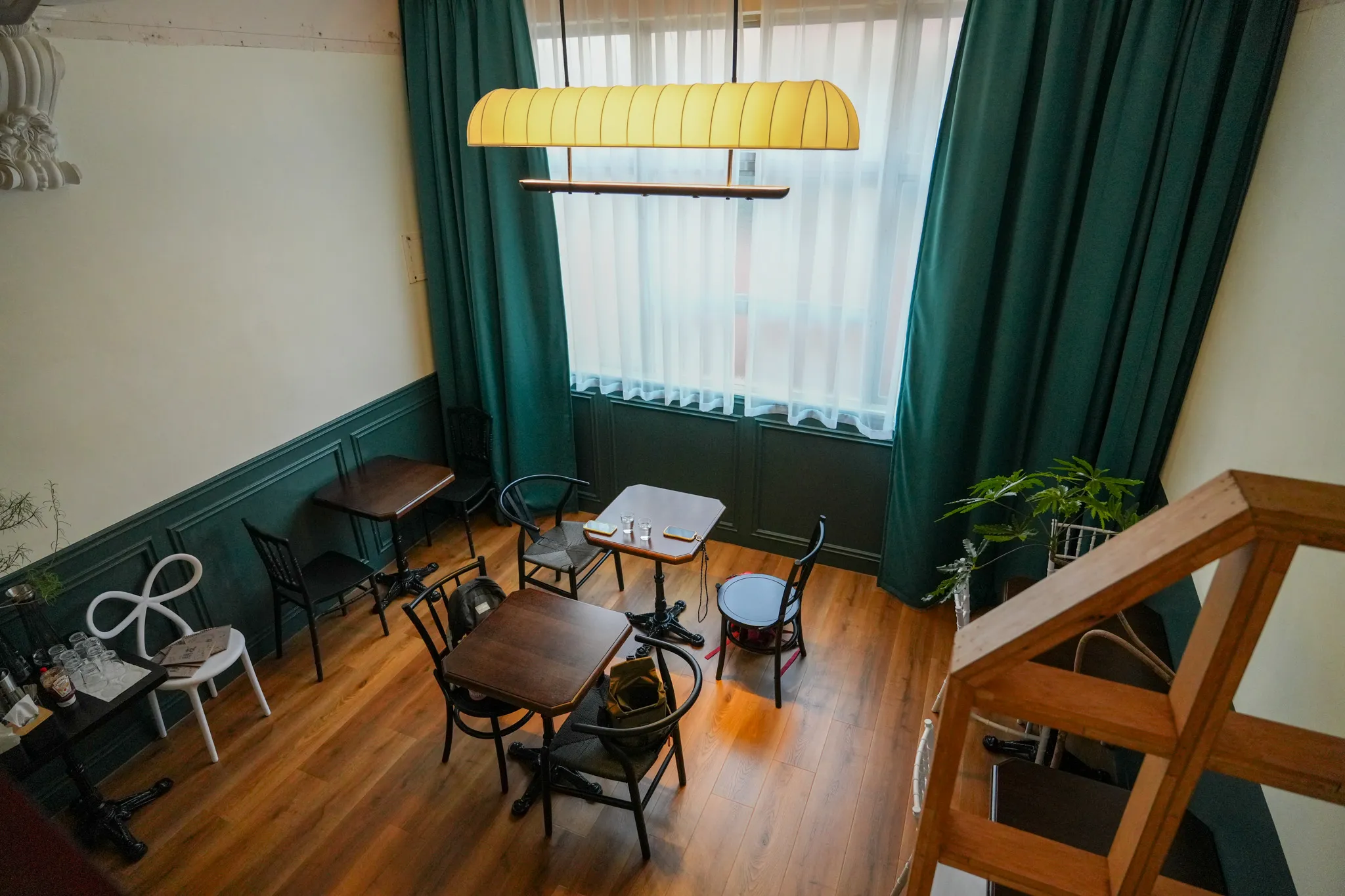 ▼走上二樓後,風格明顯轉換成英倫復古調性,深綠色窗簾搭配木質地板與高挑空間,營造出低調優雅的氛圍,中間那盞像小飛船的吊燈很有特色,光線柔和又溫暖,使整個空間更加舒適放鬆,很適合在這邊待一個下午,好好享受相聚的時光。