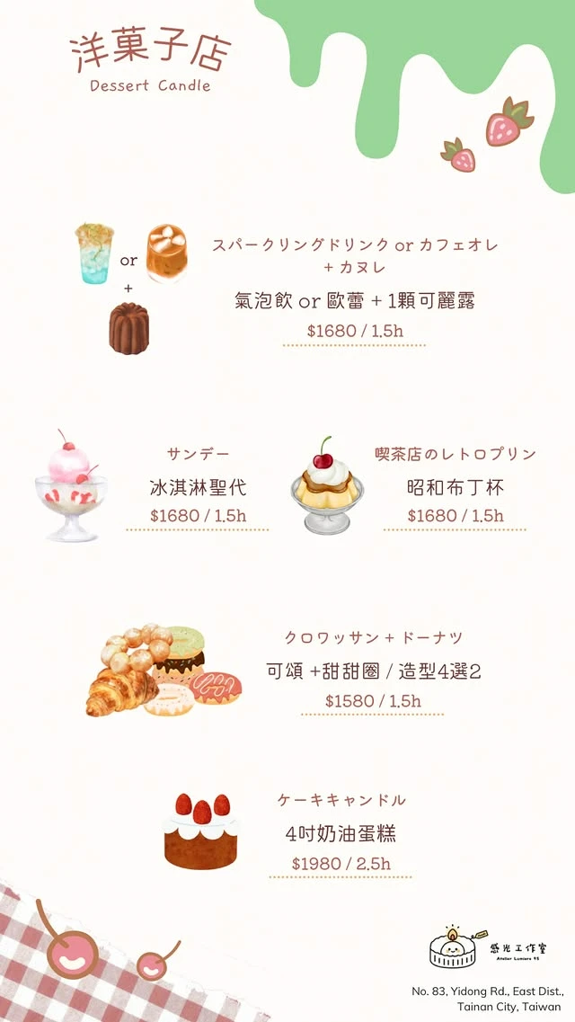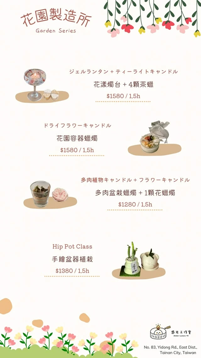 ▼「感光工作室」主要提供手作蠟燭課程,其中又以造型不同而分成不一樣的類型,像是甜點、植栽和寶石等,以下為詳細的價目表,提供給大家參考。