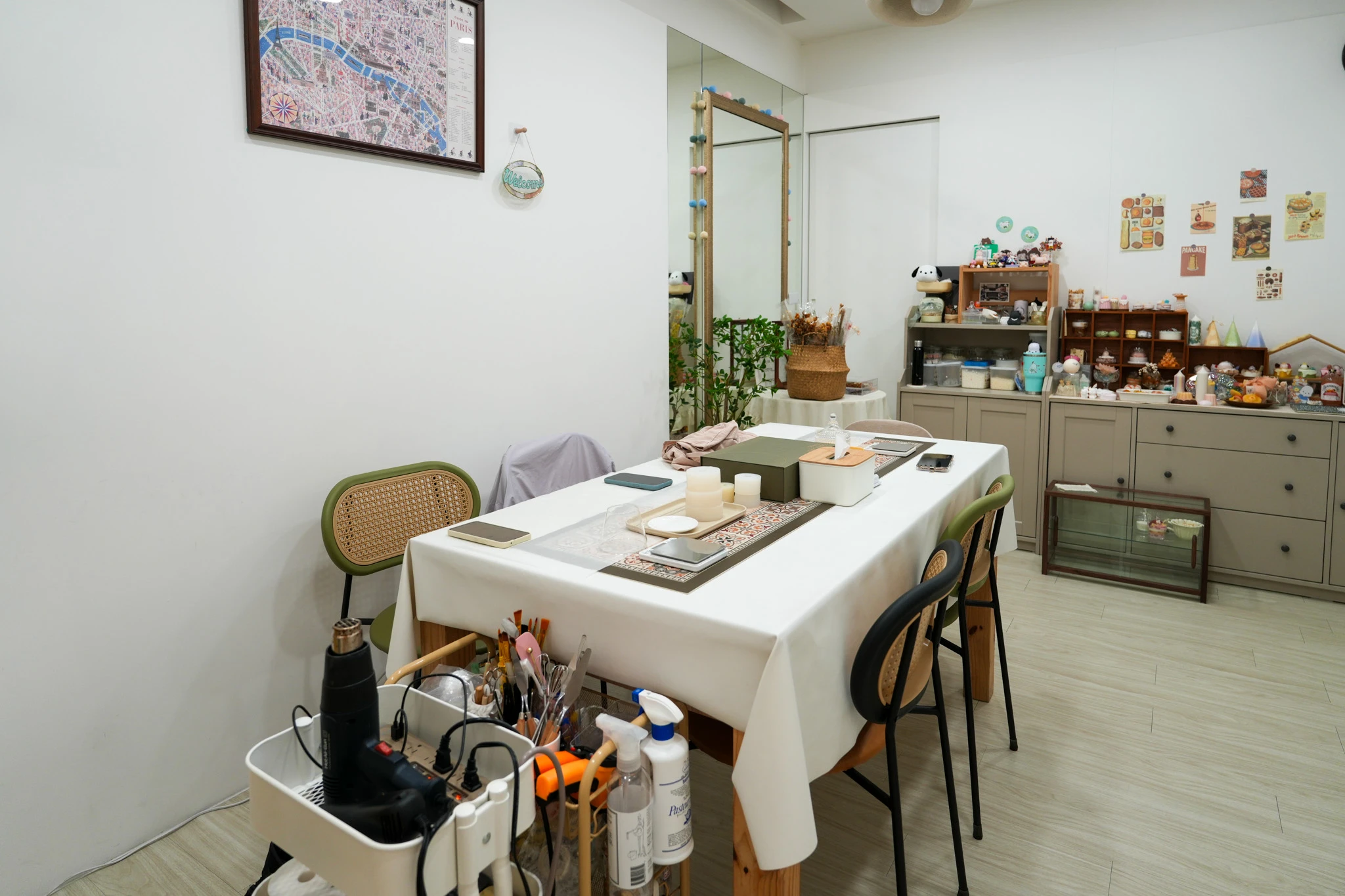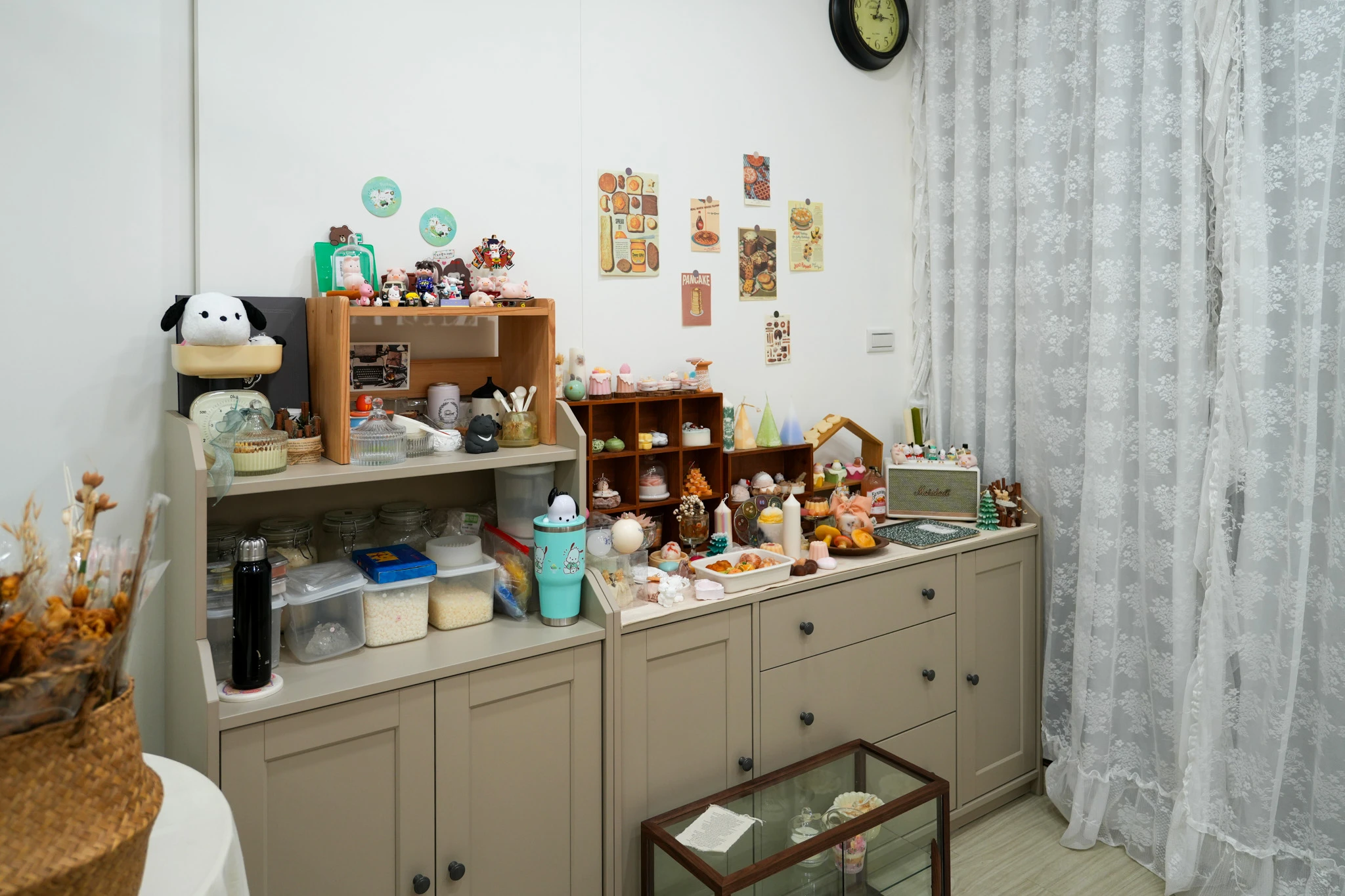 ▼而實際的上課教室則隱藏在收銀台後的小空間,整體空間不大,只有一張小長桌,後方則是課程作品的範本,還有一些老師收藏的公仔們,非常可愛。