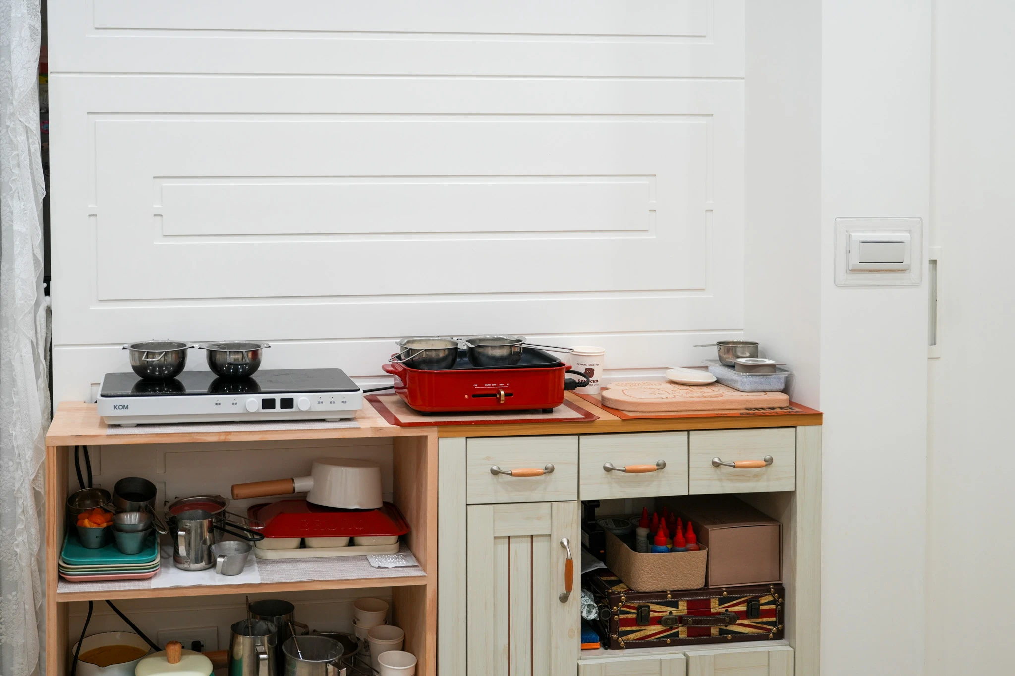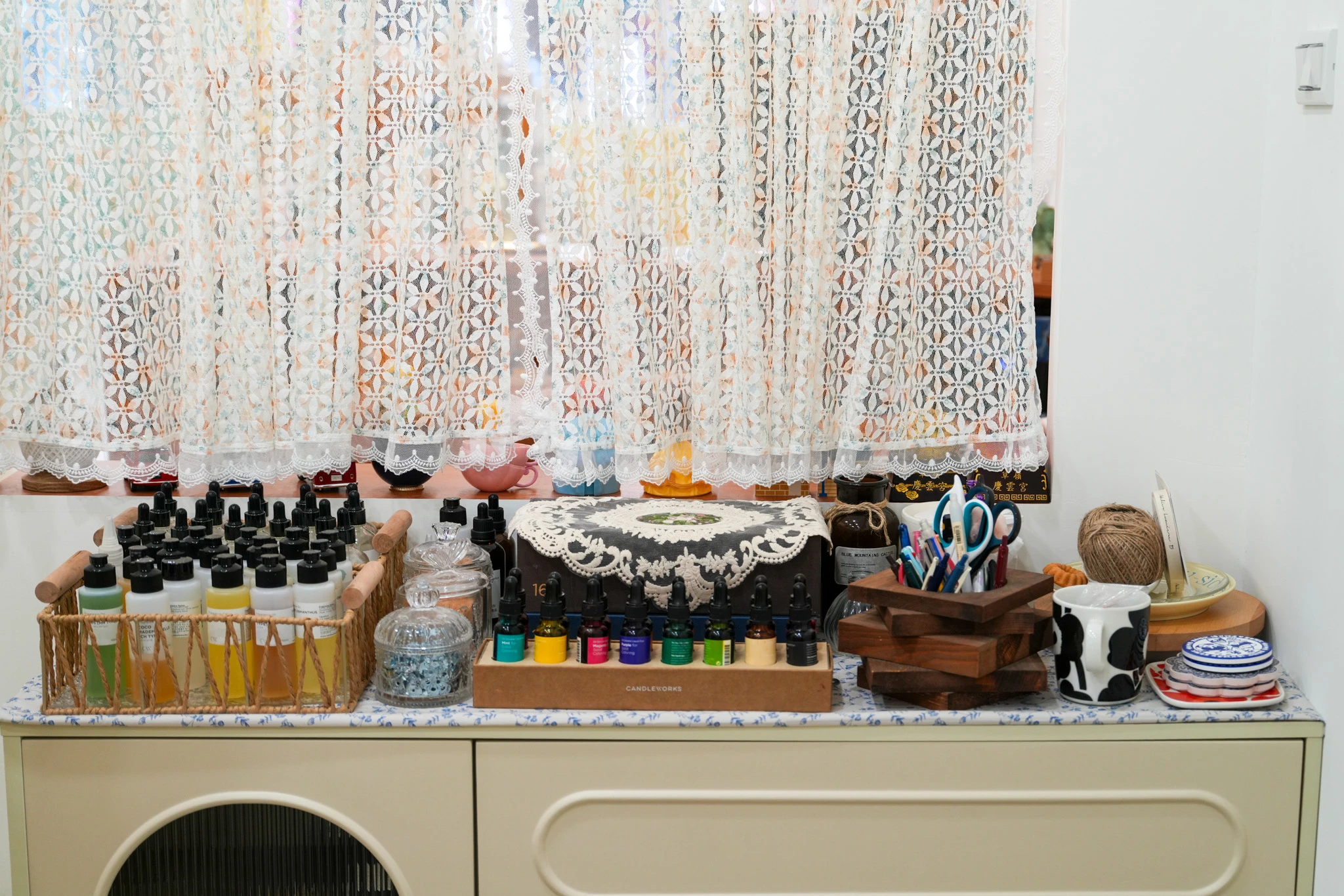 ▼靠近教室門旁的櫃子則是擺放了許多香精及顏料,開始做蠟燭前會先在這邊挑選喜歡的香味,另一側則是融蠟用的容器及加熱機器,整體空間明亮又舒適,讓人一走進來就感到十分放鬆。
