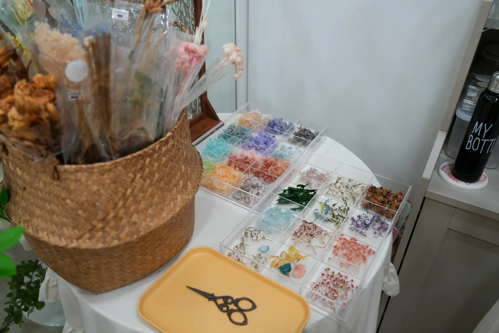 ▼作品櫃旁邊的小圓桌上則放著花園蠟燭需要使用的乾燥花材,後方還有一面鏡子及一些小道具,作品完成後可以在這邊拍美美的成品照。