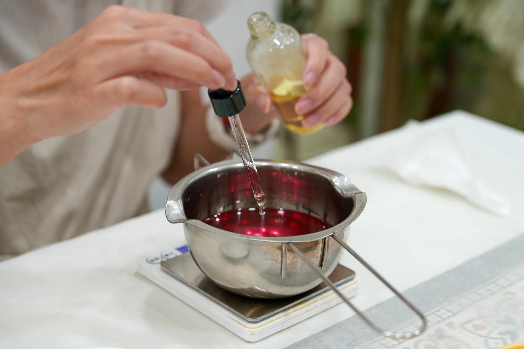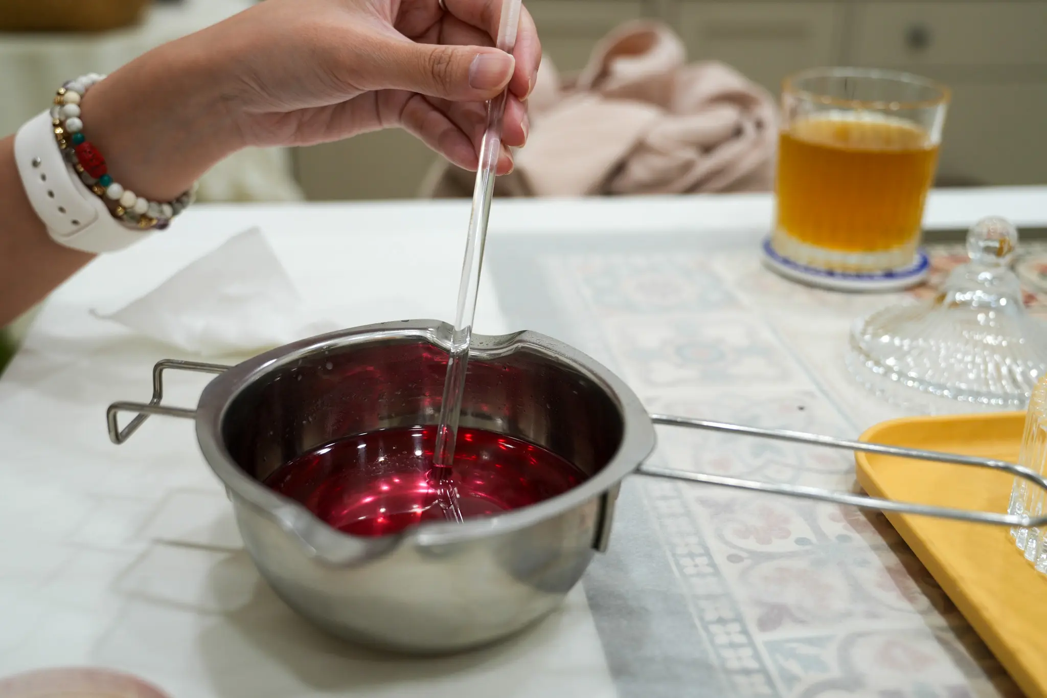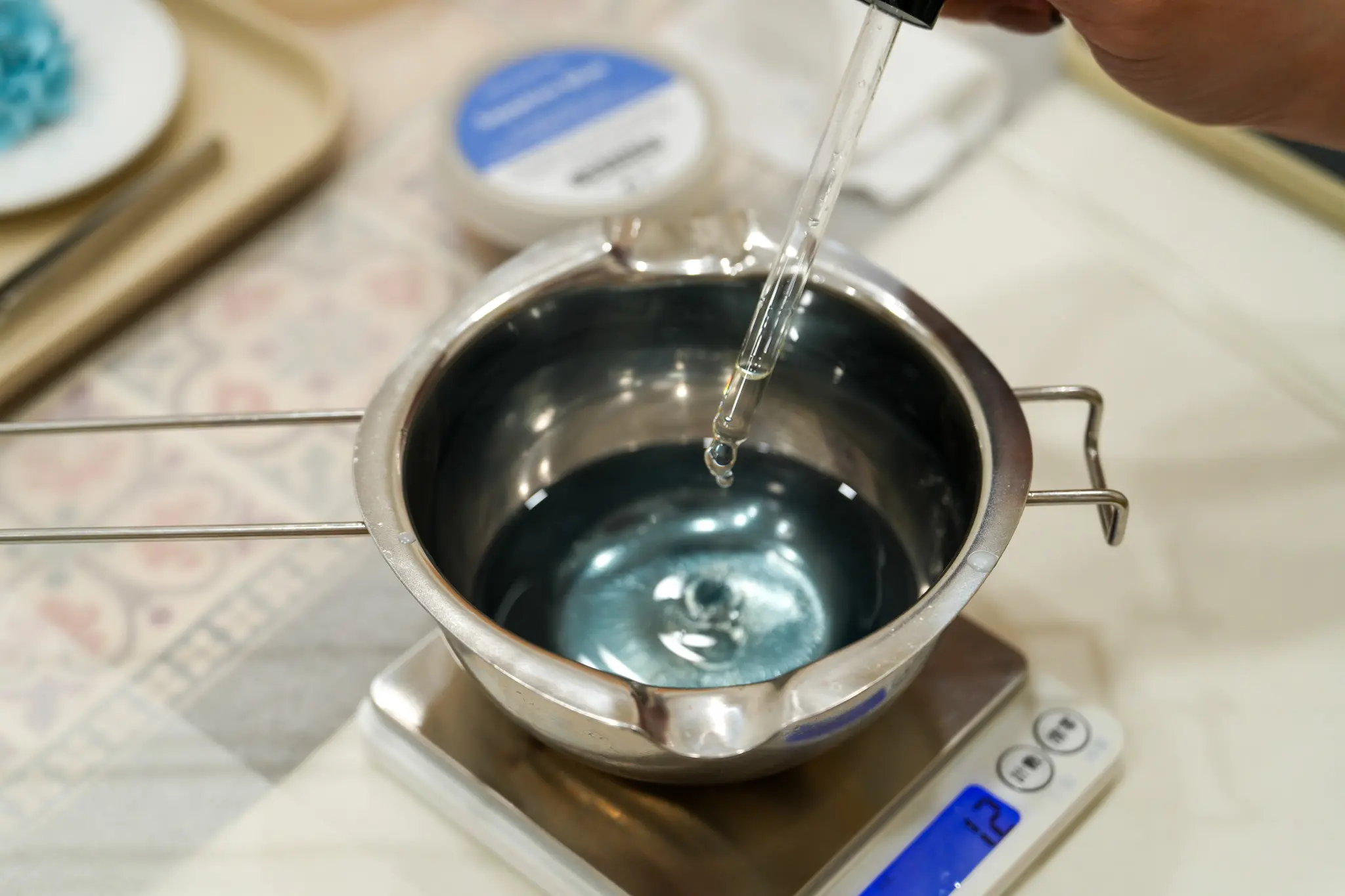 ▼調完色後,就是加入香精的步驟,花蠟燭需要加入的重量約3.5克,滴入後用攪拌棒稍微攪拌,讓香精和蠟液能夠融合。