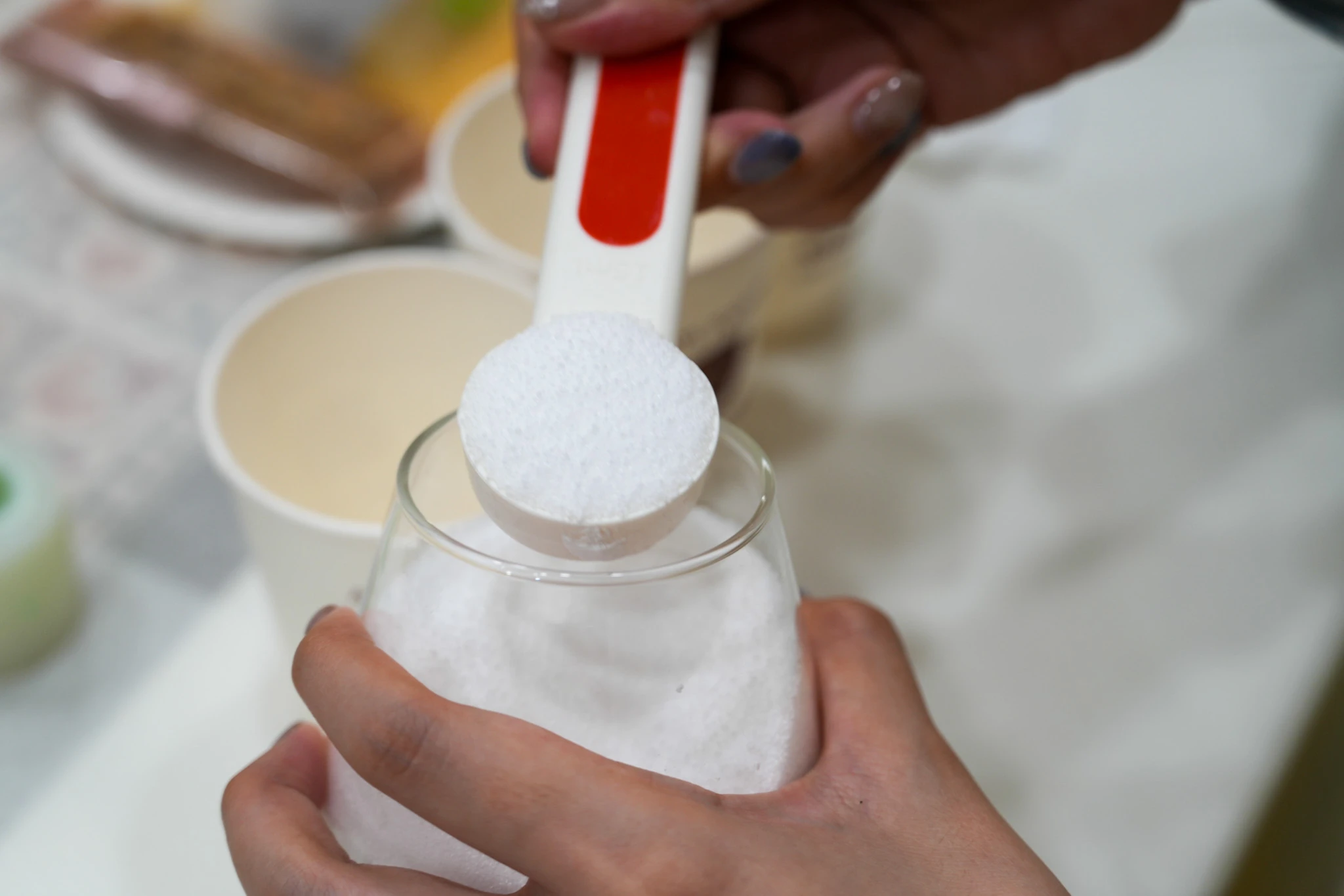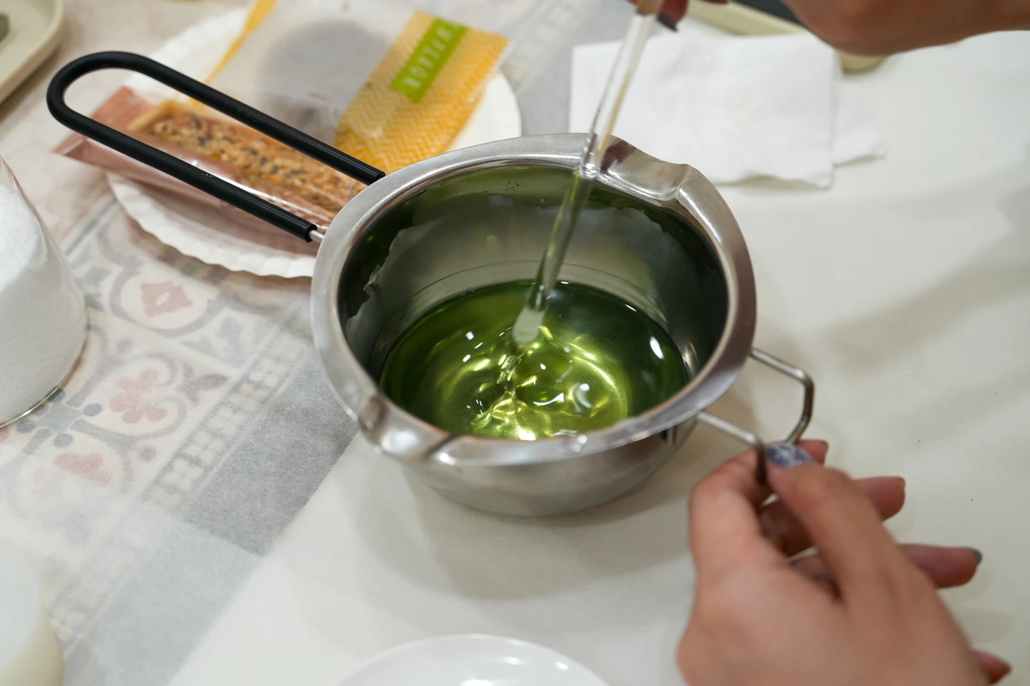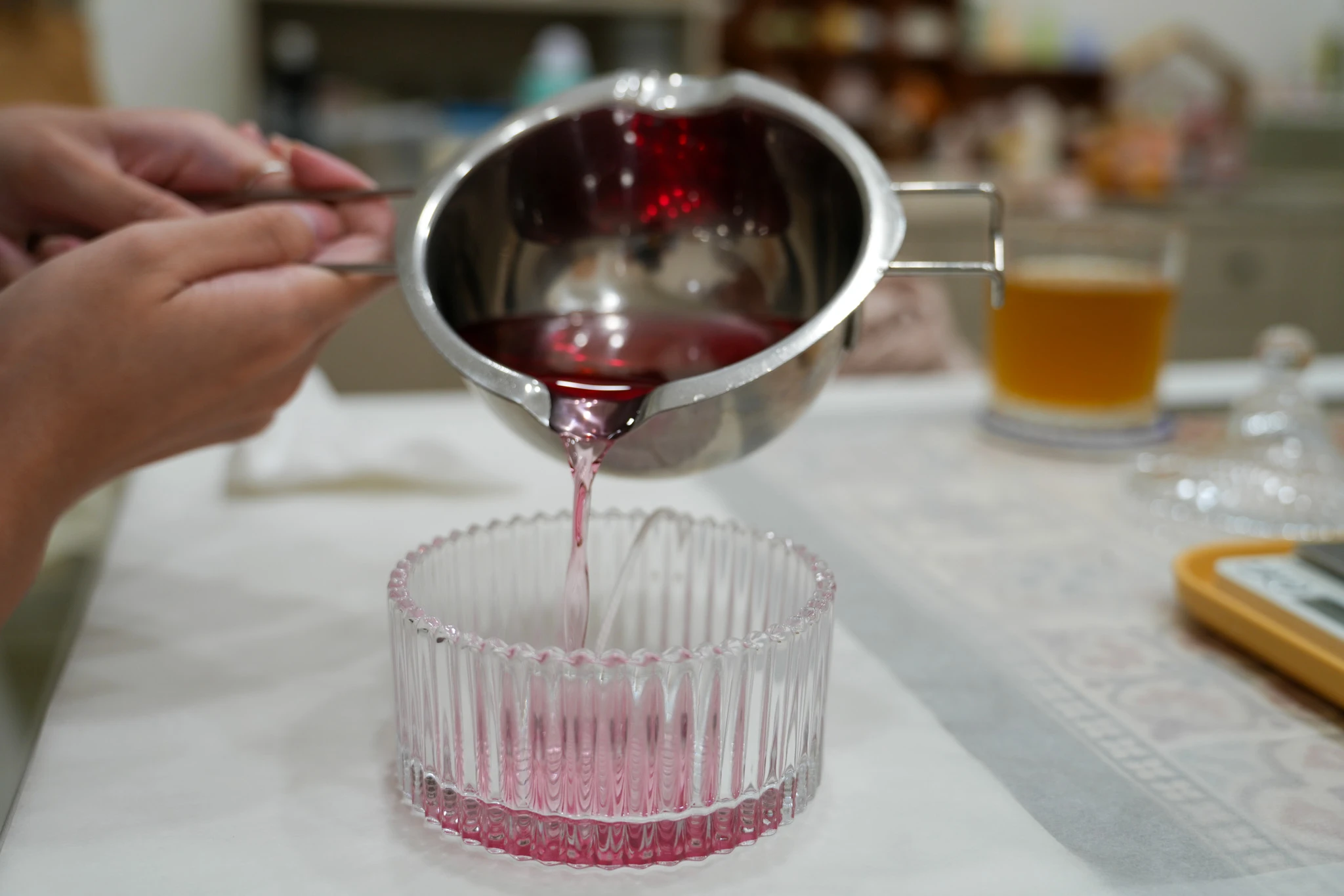 ▼調好之後老師會幫你加熱蠟油,然後請你加入7公克的香精,攪拌後倒入已經貼好燭芯的容器中。