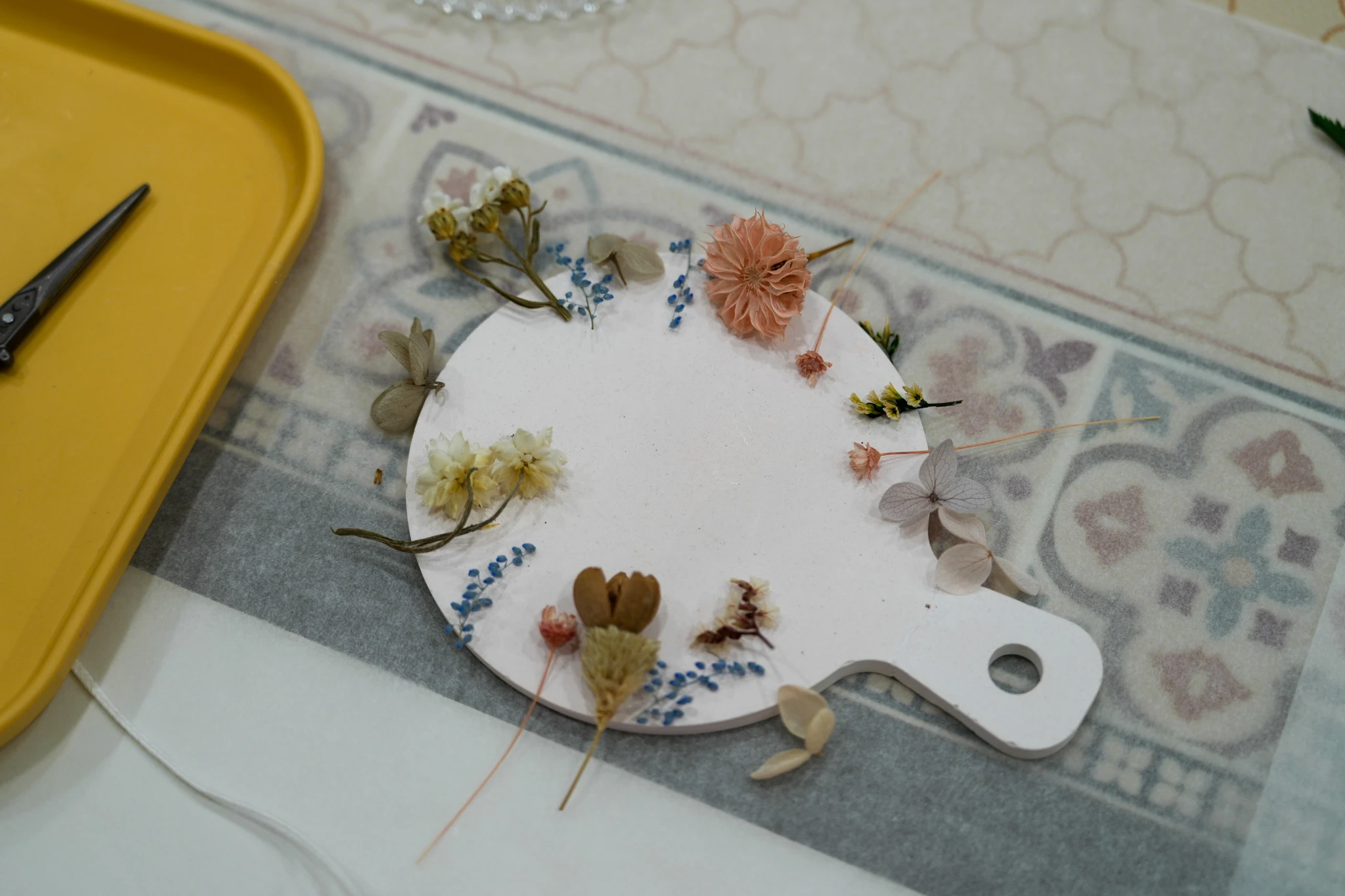 ▼選好花材後,老師會給你一個圓盤先稍微擺一下想要的位置,擺放的方式很自由,如果真的沒有想法,也可以以插花的概念下去做,像是選擇一朵主花,再從中間往旁邊展開。