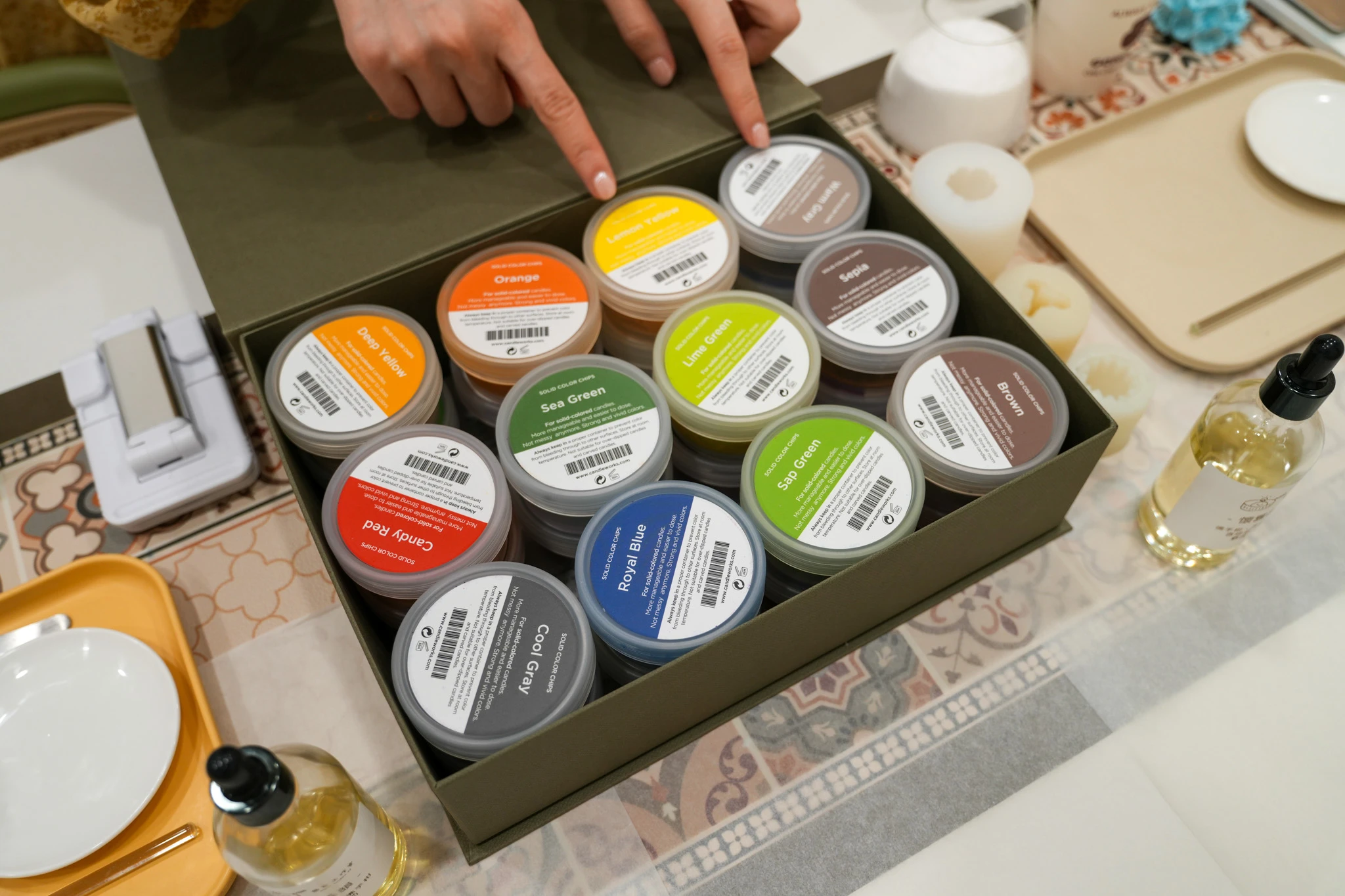 ▼選好味道後老師會幫忙融好蠟液,然後就可以開始進行調色,桌上有許多不同的色片可以選擇,可以選單色也可以混色。