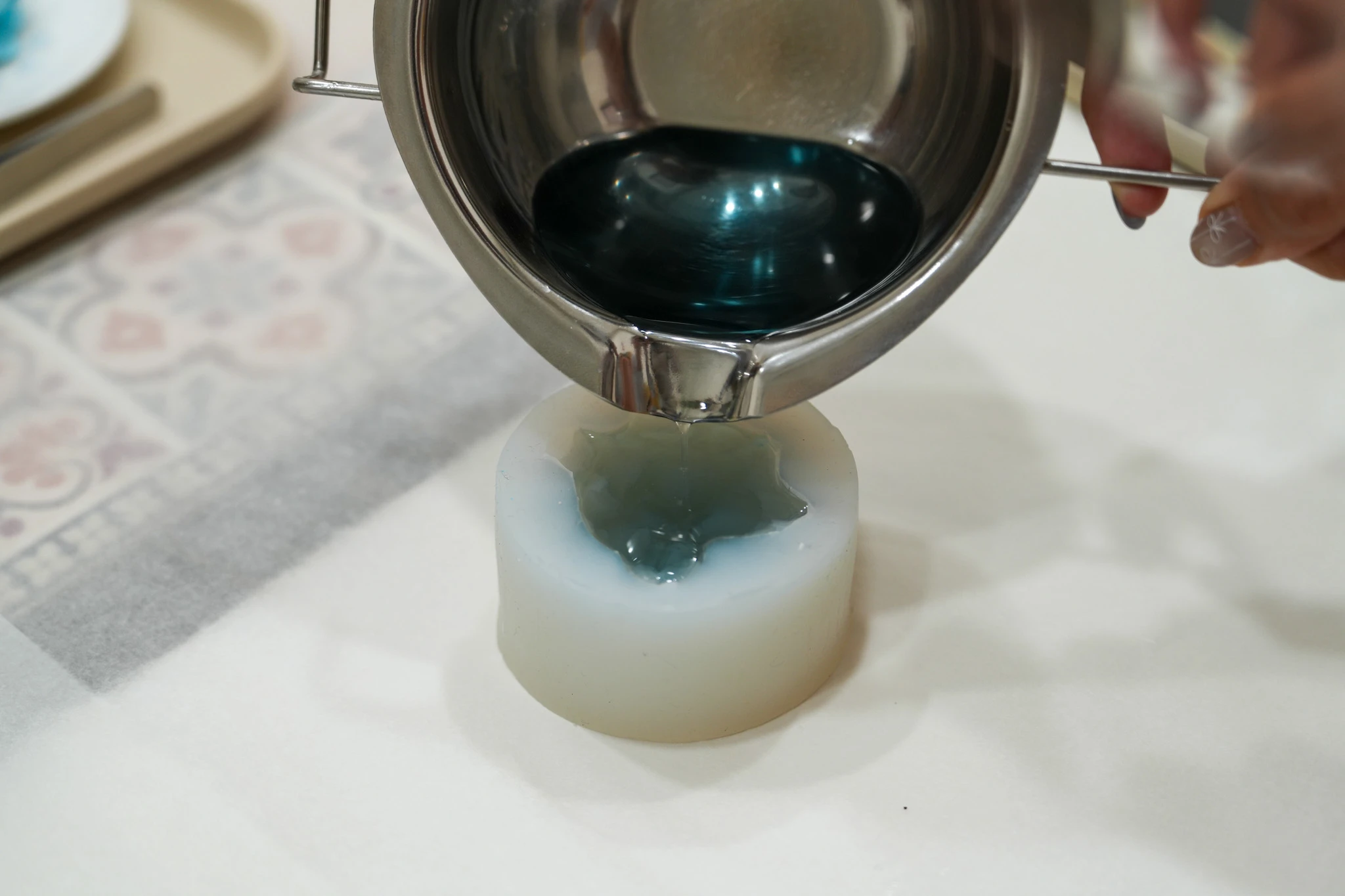 ▼接著倒入模具並等待它凝固後,就可以脫模得到漂亮的花蠟燭啦!