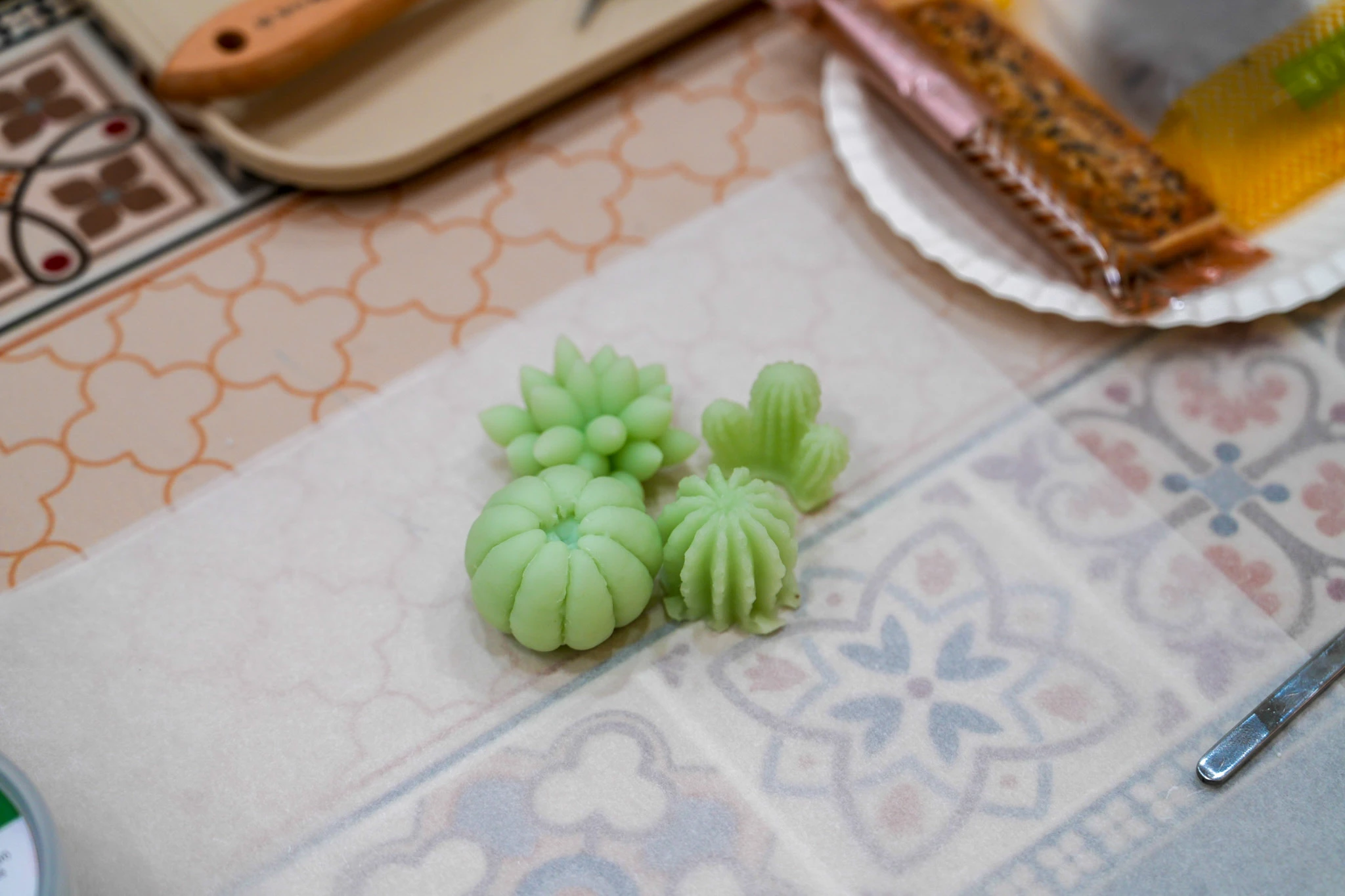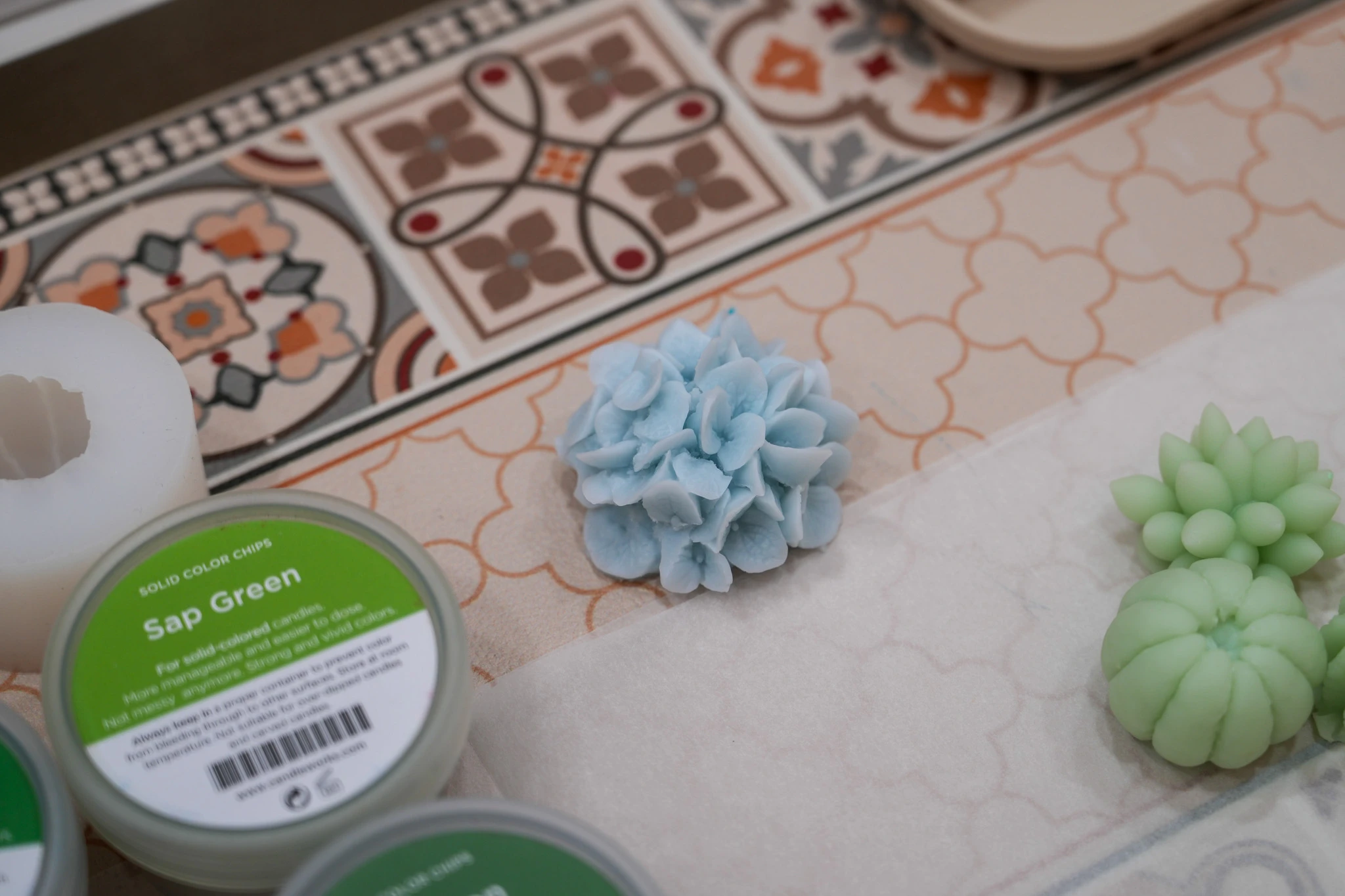 ▼再來就是多肉的部分,有4種多肉模具可以選擇,可以四種都先做成蠟燭脫模後,再選擇要把哪幾個放到盆栽內,多肉也可以隨興搭配自己想要的顏色,像朋友選的就是比較繽紛的草綠色。
