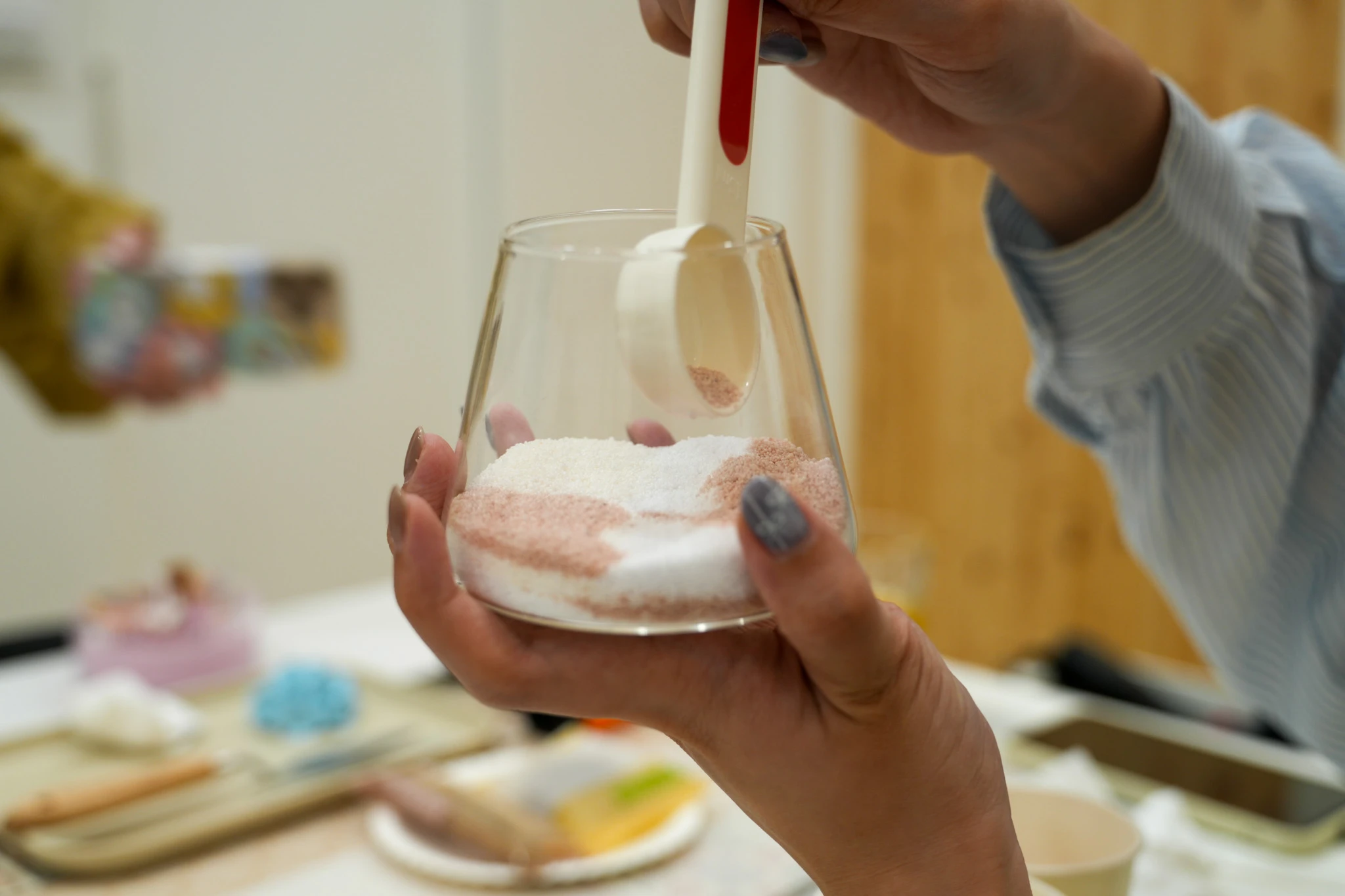 ▼總共可以挑三種不同顏色的沙子一層一層的堆疊成想要的盆土,也可以選擇老師提供的乾燥花做裝飾,不過朋友覺得盆栽已經有點滿了,所以就沒再放花了。