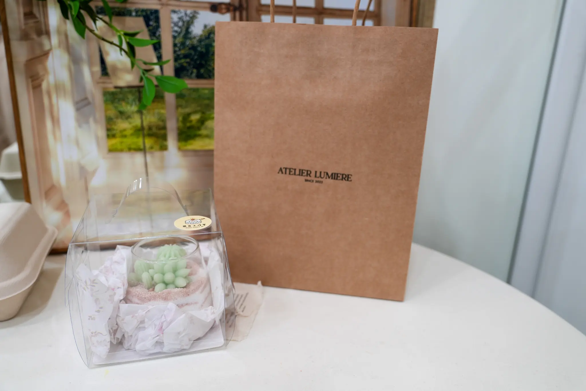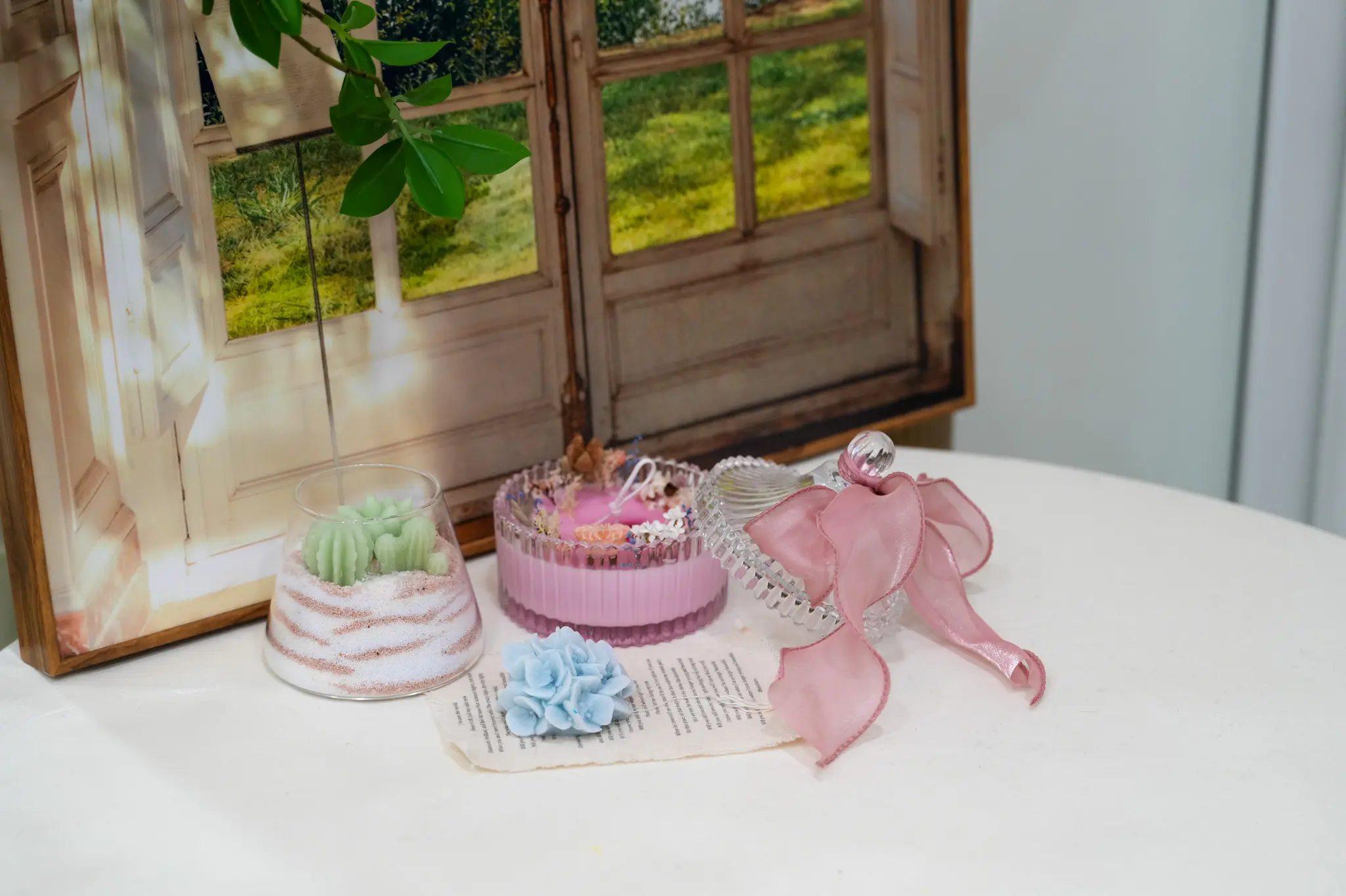 ▼兩個蠟燭都完成後,老師會幫忙布置後面的小圓桌,讓學員們拍攝成品照,自然的佈景搭配小道具,拍起來更有氛圍,拍完後也會幫忙包裝好,並提供紙袋方便學員把成品帶回家。