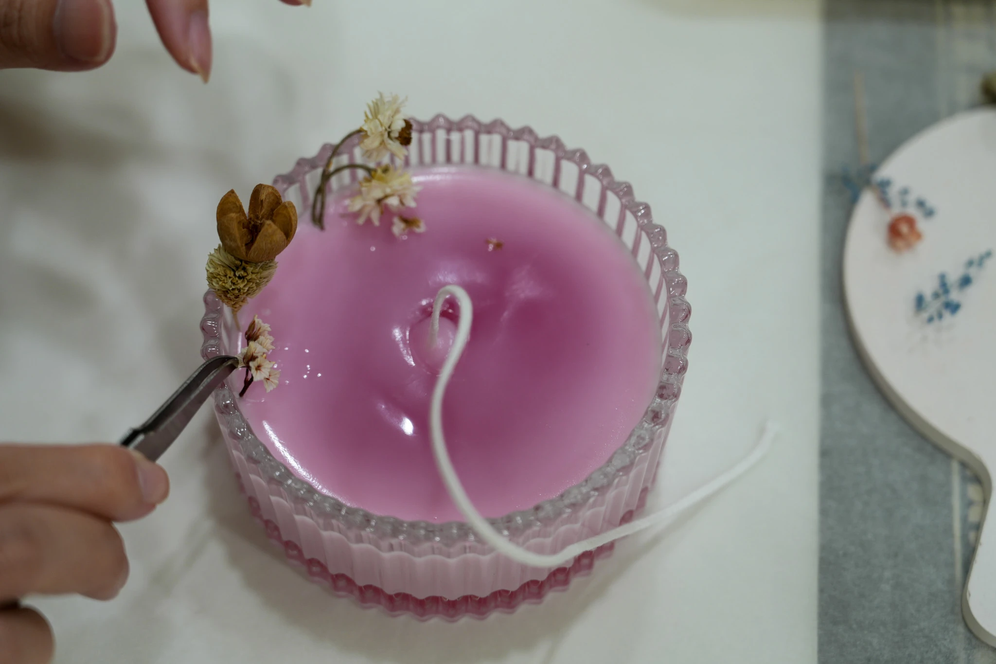 ▼等蠟液稍微凝固一點後,就可以準備放入花材,在等待的過程中可以先到後方選擇自己想要的乾燥花材。
